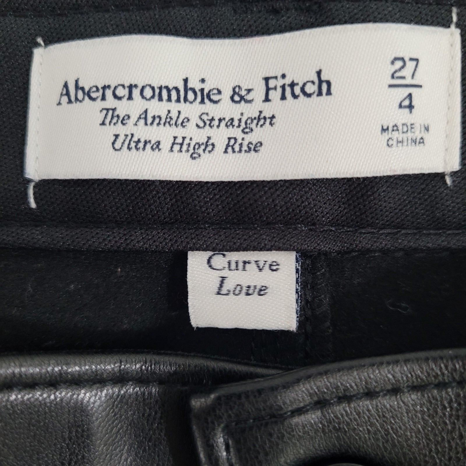 Abercrombie & Fitch Faux Leather Ankle Straight High Rise Curve Love Pants in size 4 (25x26). These stylish pants feature a solid black color with a zip and button closure. They are designed for various occasions including travel, party/cocktail, casual wear, and workwear. Made of faux leather, these pants have a high rise with a straight leg style and ankle length. Easy to care for and machine washable, they also offer stretch and pockets for convenience.