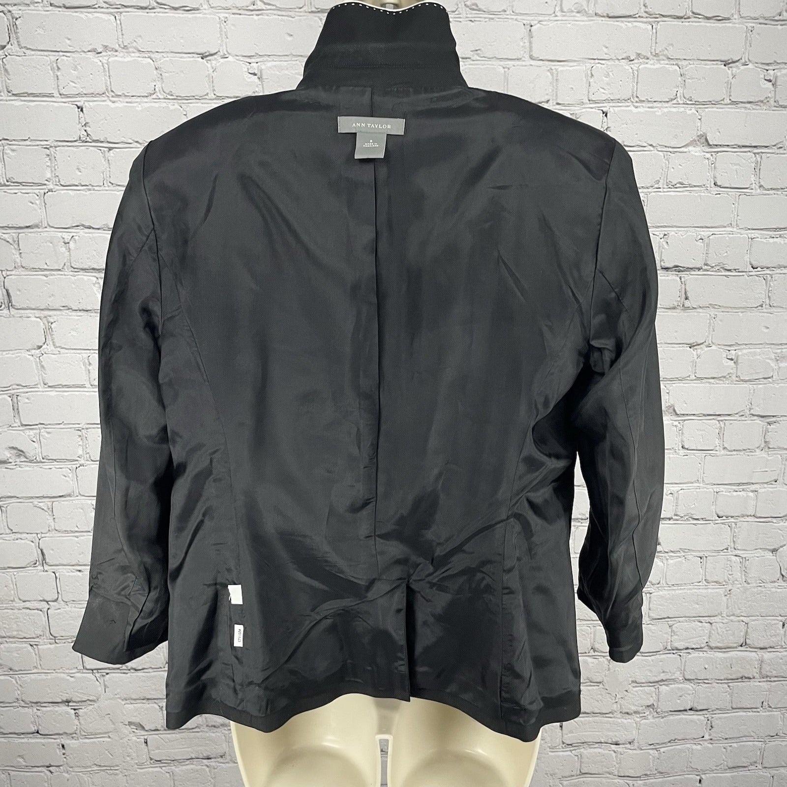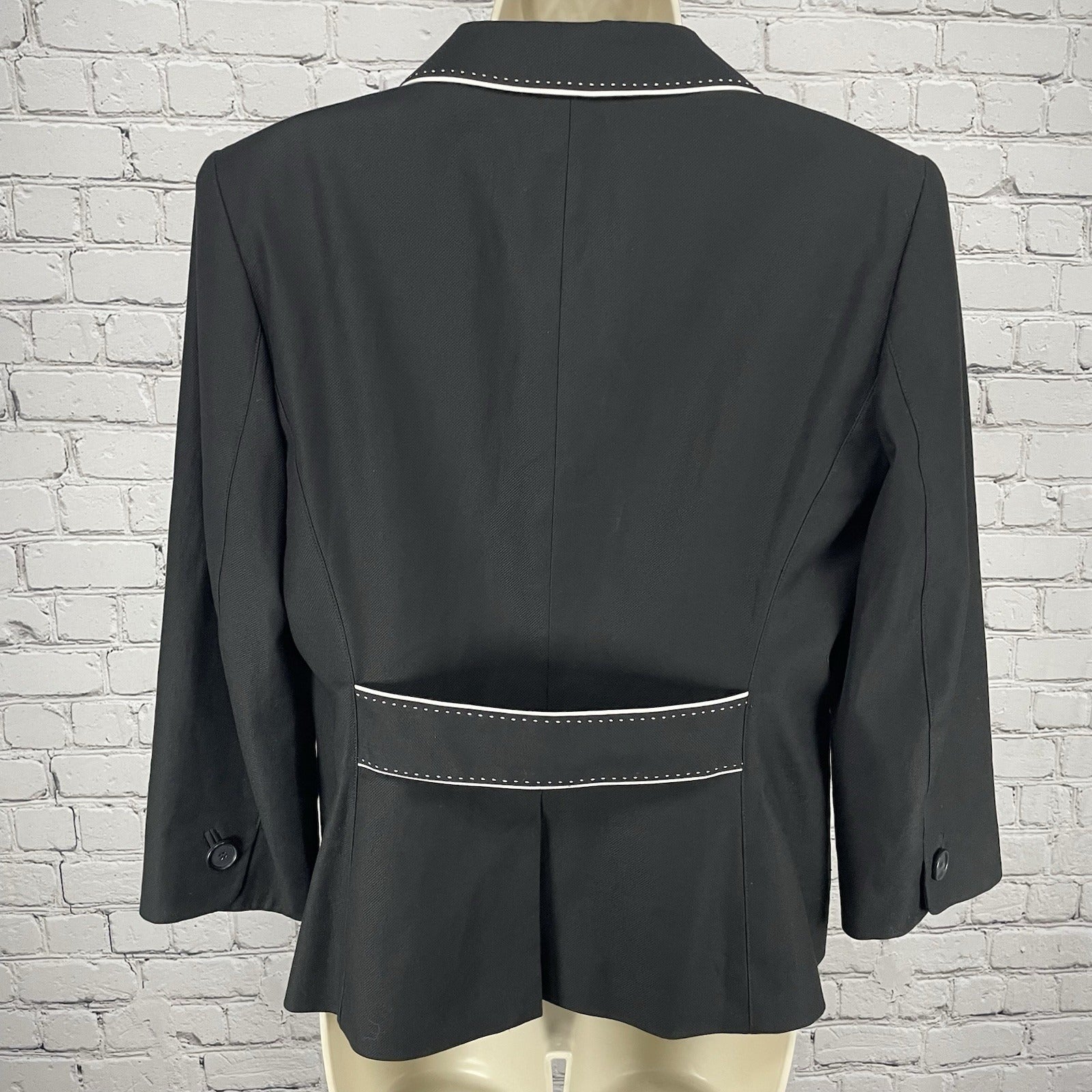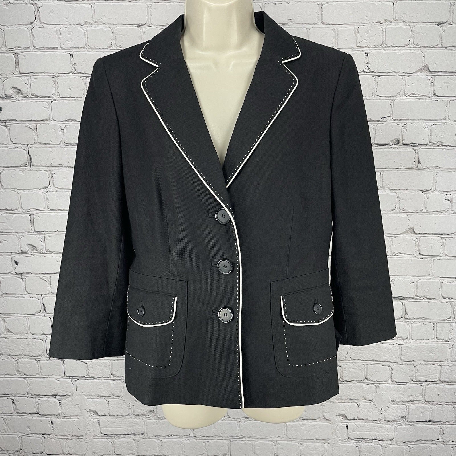 Ann Taylor Black Cotton White Trim Stitch 3 Button Blazer Jacket Stretch Size 8