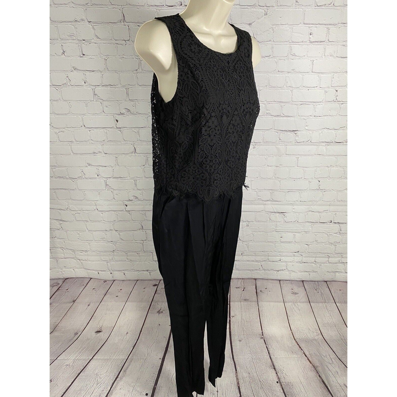 Elevate your wardrobe with this stunning black lace jumpsuit from Ann Taylor. This one-piece features a high neckline and sleeveless design, making it a versatile addition to your closet. The back zipper closure adds a touch of sophistication, making it perfect for any occasion, whether it's a wedding, party, or even a professional setting.