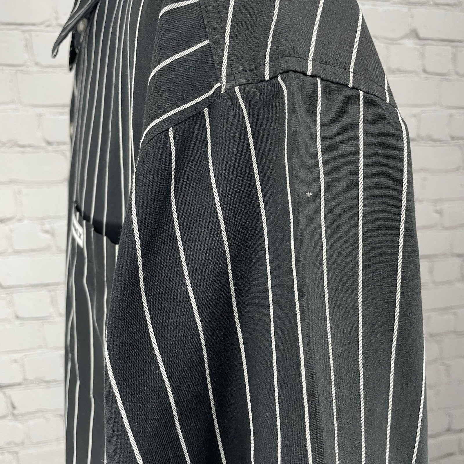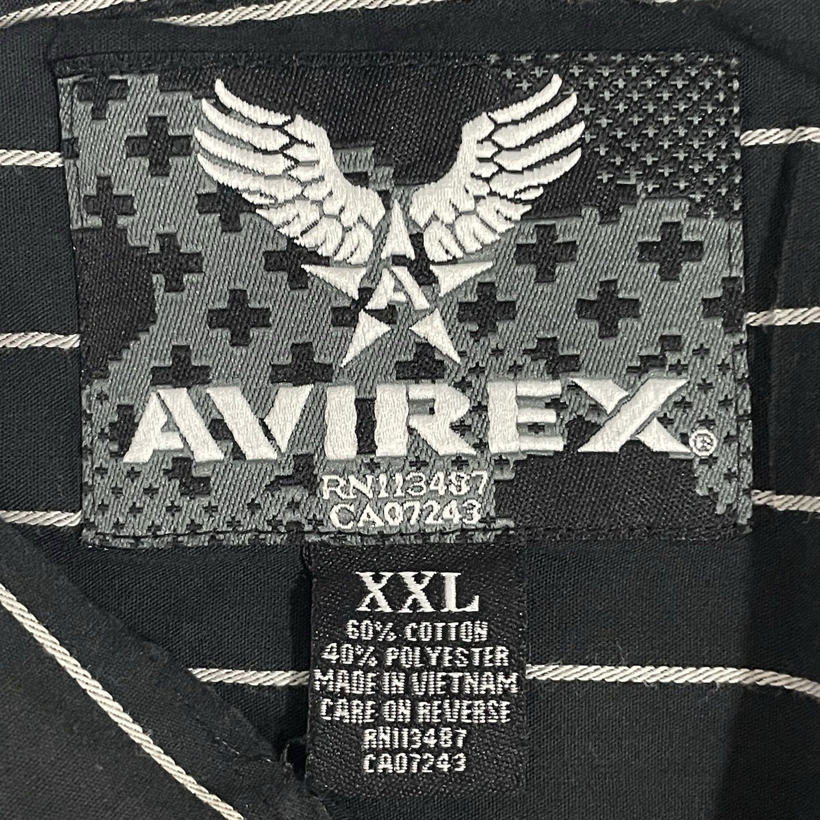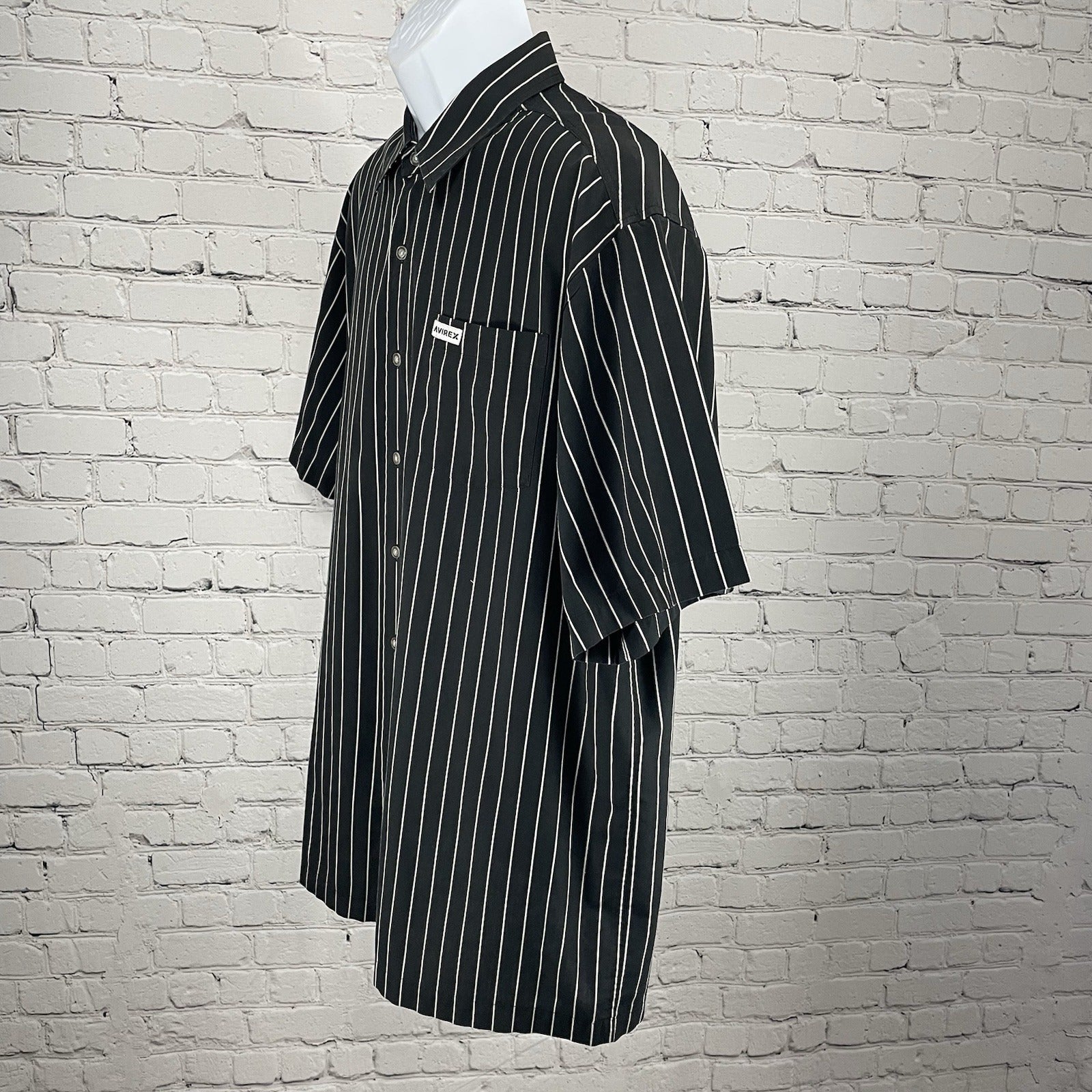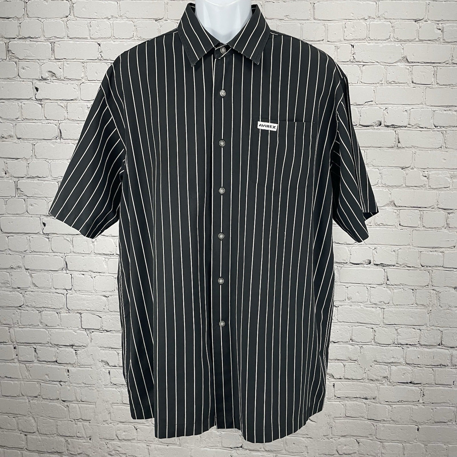This is a men's black striped button-up shirt by the brand Avirex in size XXL. It features a short sleeve design with a point collar and button closure. The shirt is made of a blend of polyester and cotton, making it lightweight and easy to care for with machine washing. Additionally, it has a chest size of 50 inches and includes pockets for added functionality. Ideal for casual wear, this shirt is perfect for adding a stylish touch to any outfit.