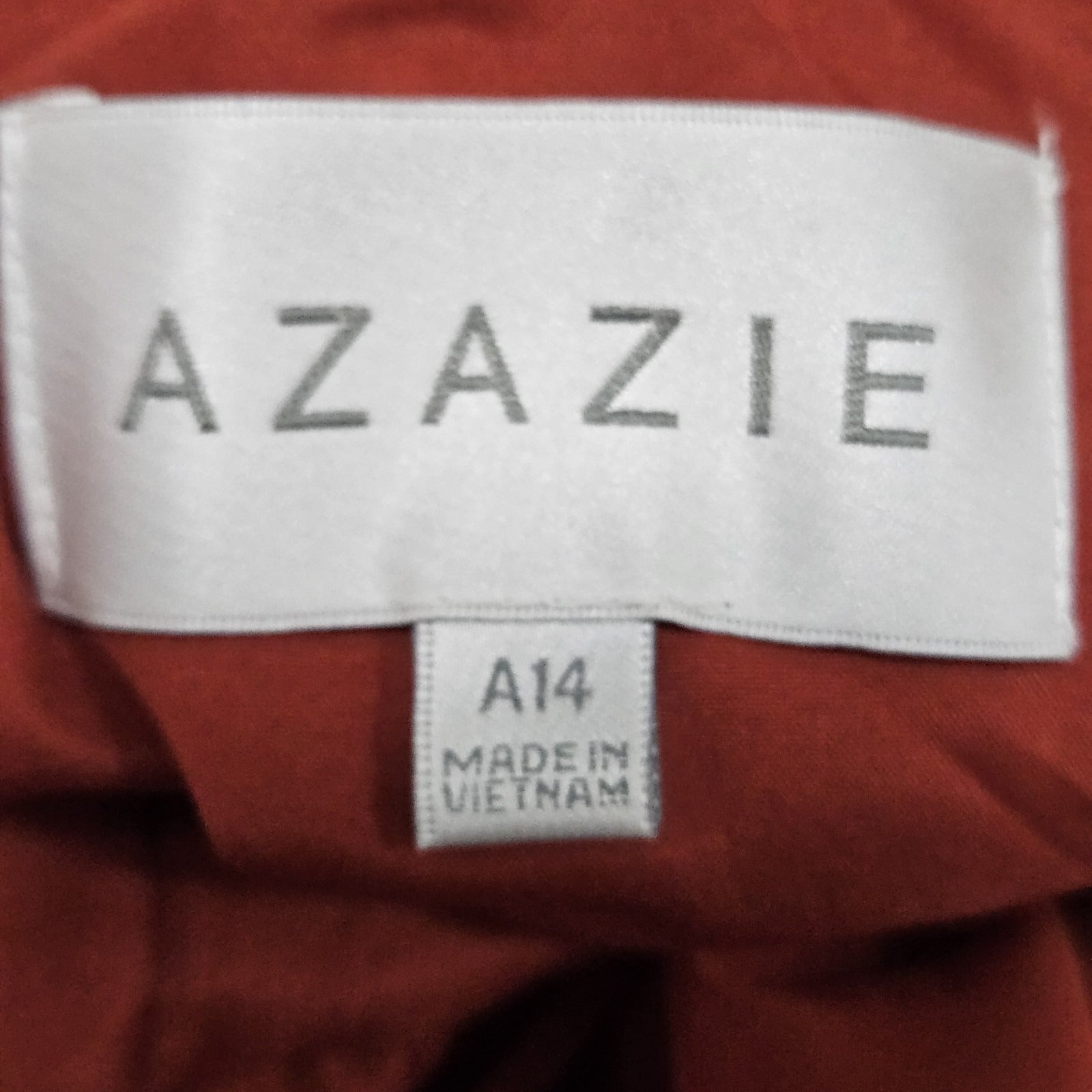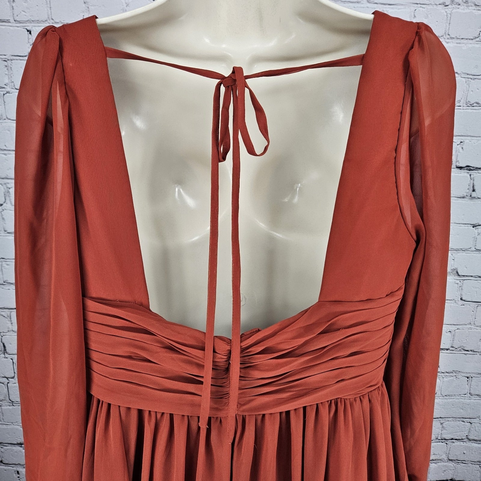 The Azazie Orange Chiffon Long Sleeve Empire Waist Pleated Backless Maxi Dress in size A14 is a stunning and elegant choice for women. The dress features a flattering empire waist design, long sleeves, and a chiffon fabric that gives it a luxurious feel. The dark orange color adds a pop of color to the outfit, while the pleated backless detail adds a touch of sophistication. Perfect for formal events or special occasions, this dress is sure to make a statement and turn heads wherever you go.