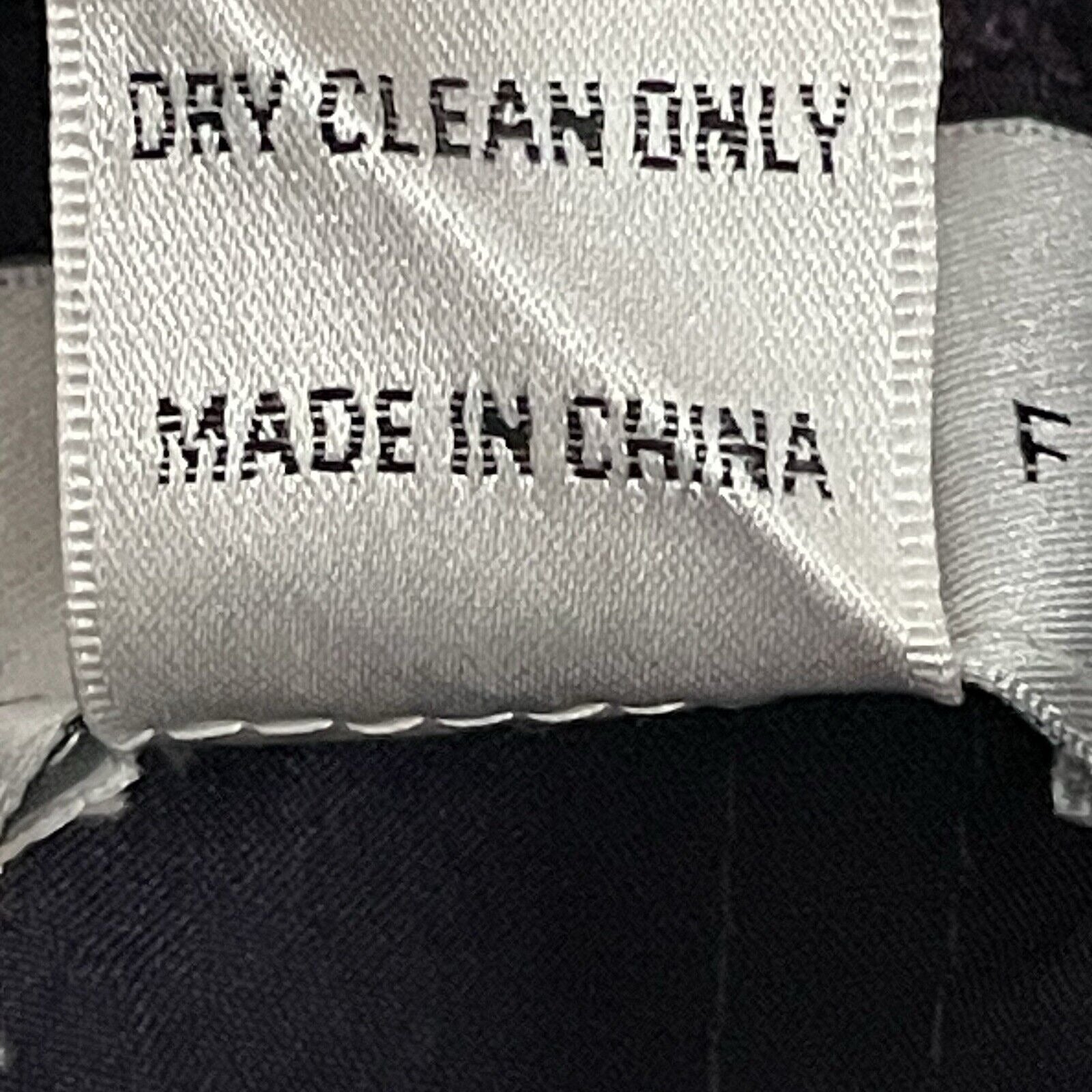 Dark staining near bottom hem front and back, and missing eye on hook & eye back closure, as pictured.