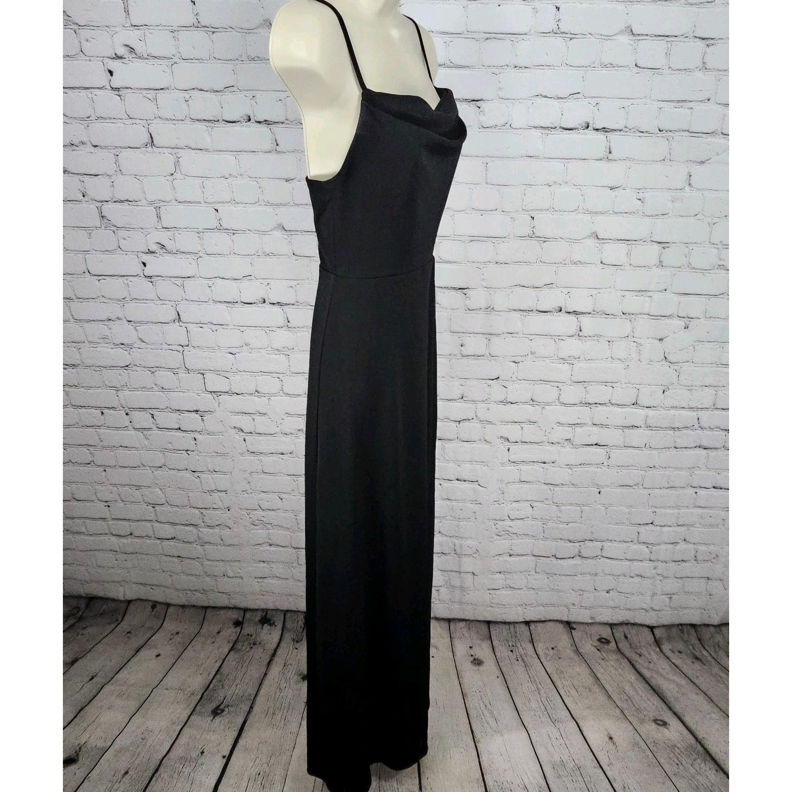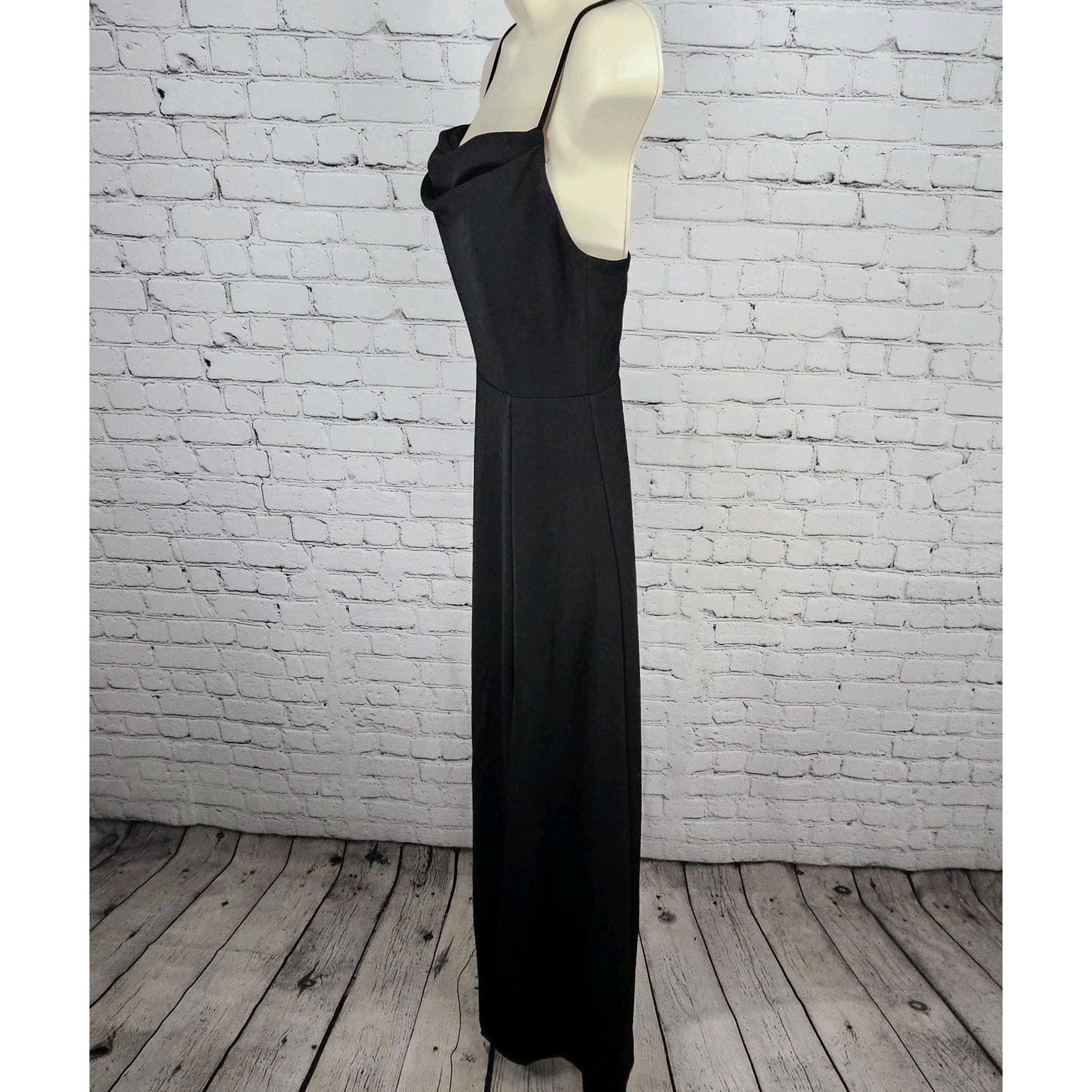 The Birdy Grey Black Strappy Side Slit Sweatheart Cowl Neck Stretch Maxi Dress in XS is a sophisticated and elegant choice for formal occasions such as weddings, parties, or cocktails. This dress features a sleeveless design with a cowl neck neckline and a side slit, adding a touch of glamour to its solid black color. Made from polyester with a stretch material, this long dress is perfect for summer, fall, or spring events. Dry clean only care instruction. Perfect for any classic or modern-themed event, this dress exudes style and sophistication.