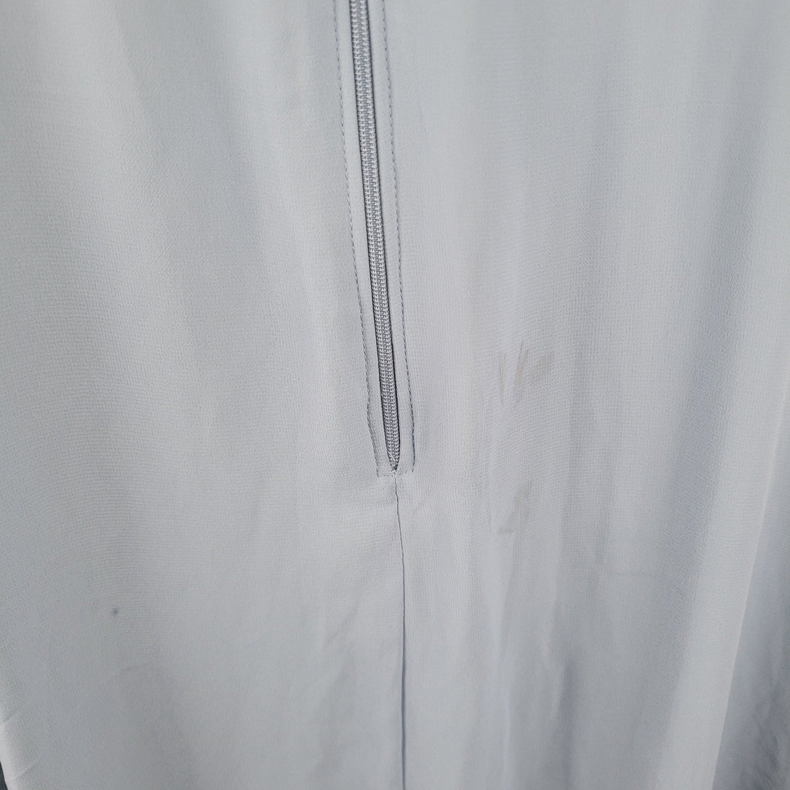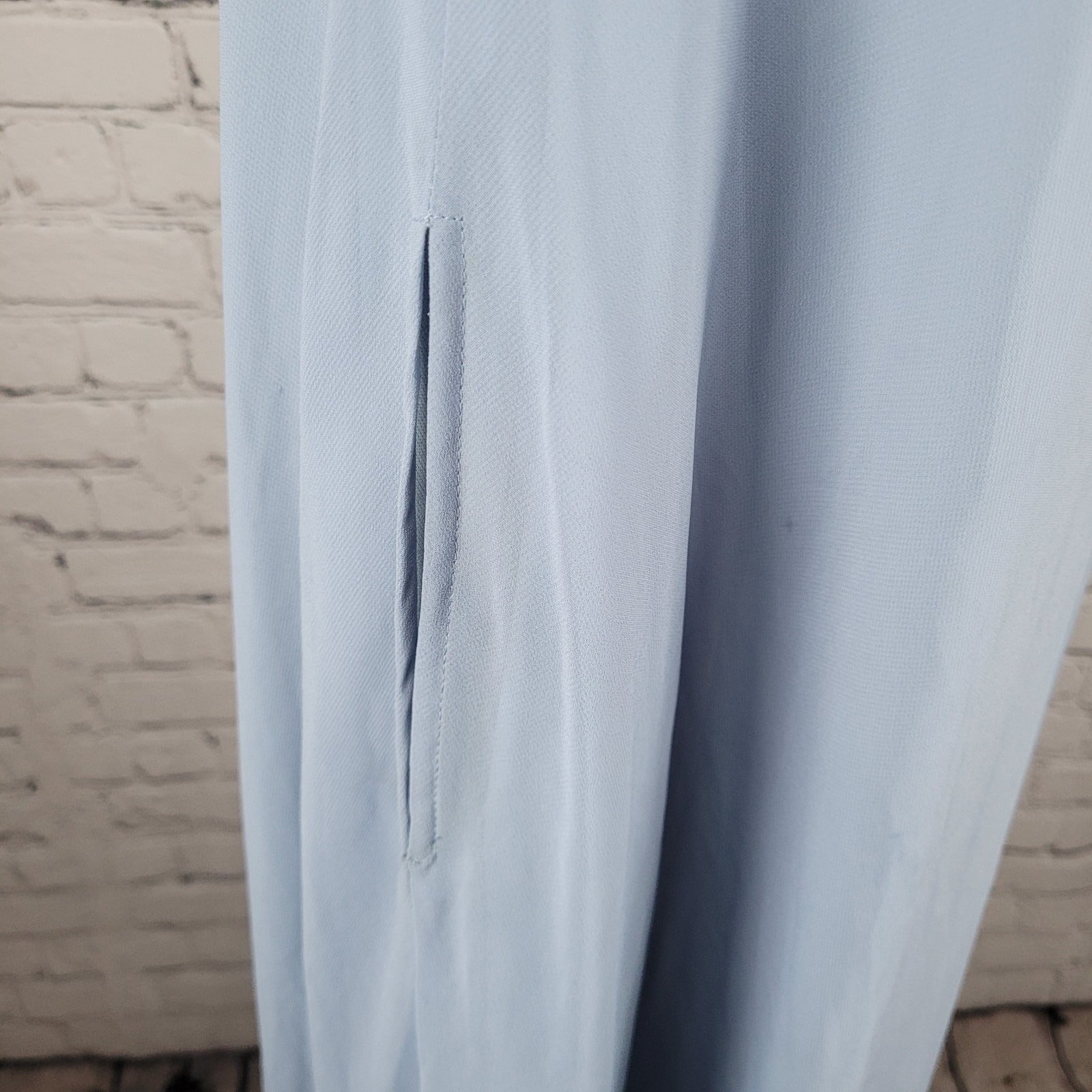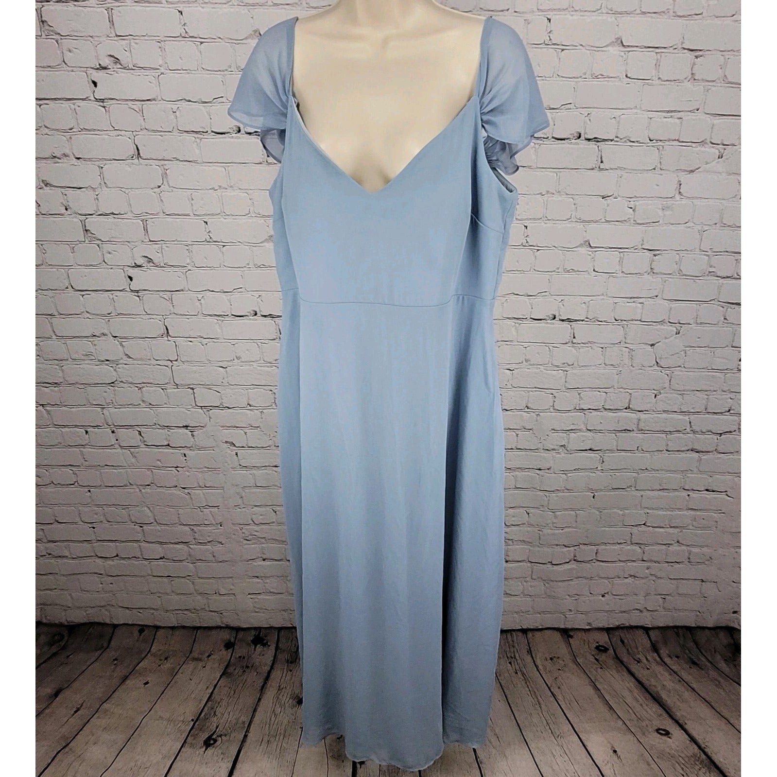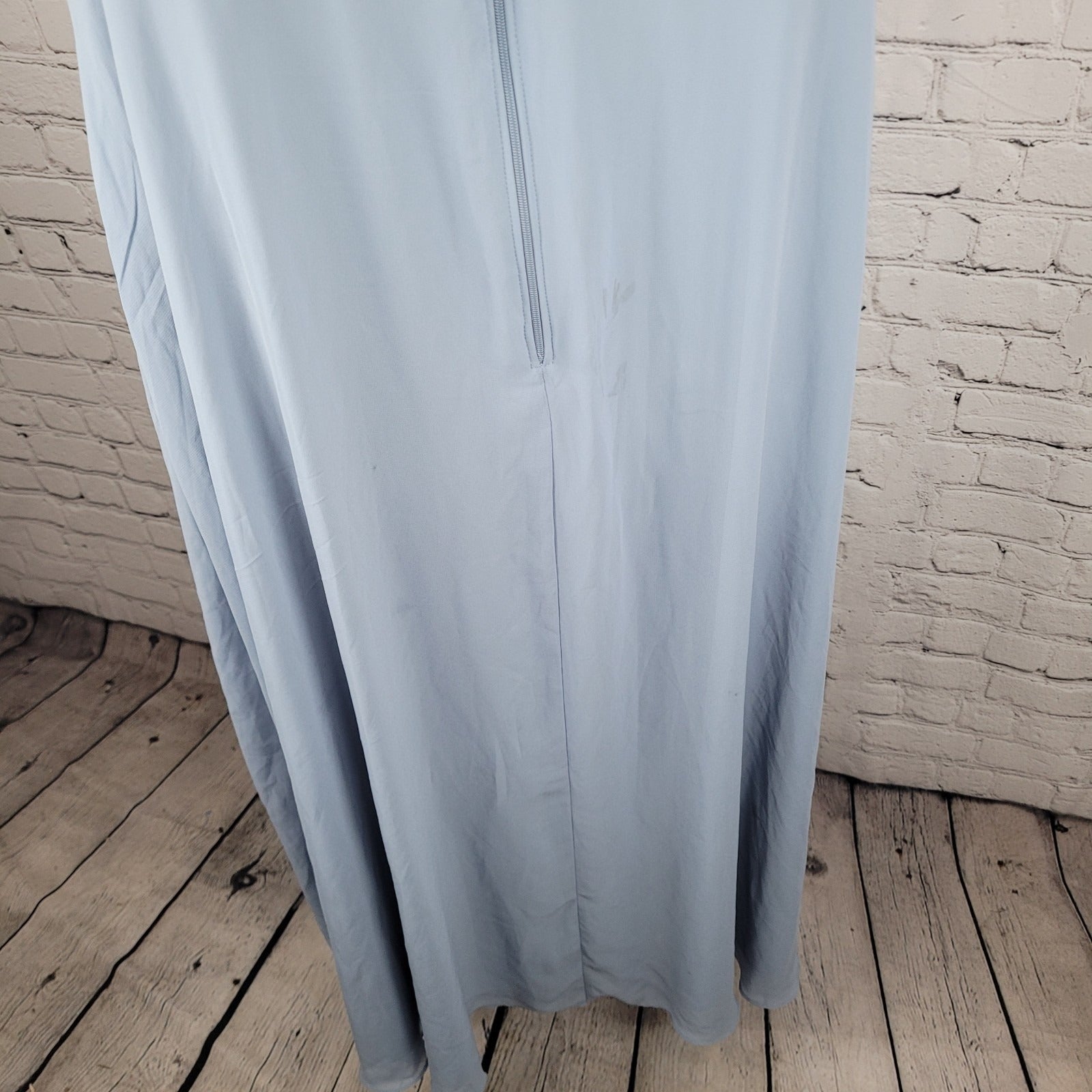 The Birdy Grey Blue Chiffon Strappy Removable Sleeves Bridesmaid Dress in size XXL is a elegant and stylish option for formal occasions like weddings, parties, or cocktails. The dress features a V-neckline, short strappy sleeves, and a zip closure for easy wear. Made from polyester chiffon, the dress has a classic A-line silhouette with a long length, making it perfect for the summer, fall, and spring seasons. Additionally, the dress is lined and includes pockets, adding both style and functionality to this beautiful garment.