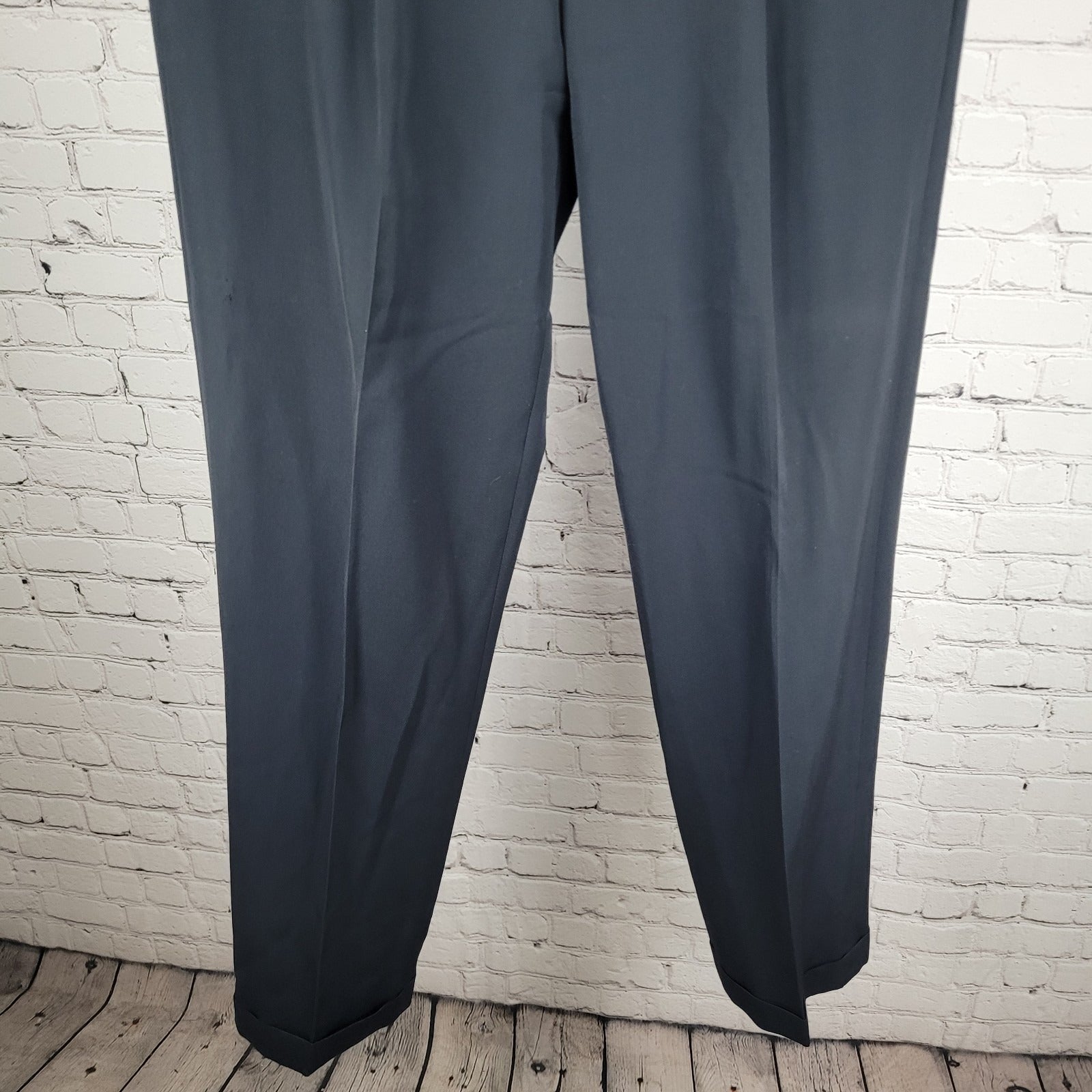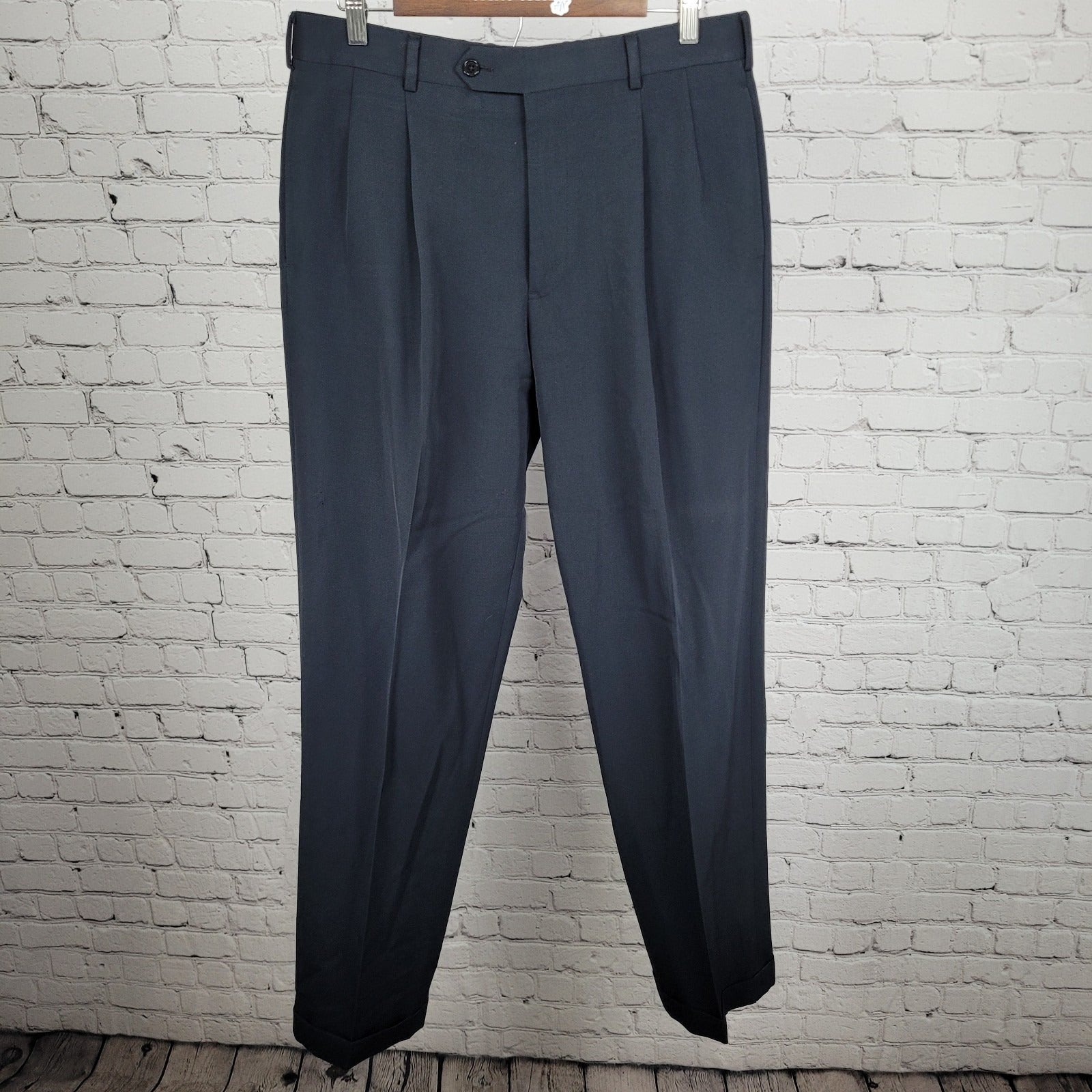 These Brooks Brothers Navy 100% Wool Pleated Cuffed Straight Dress Pants in Size 34x34 are a sophisticated choice for various occasions such as formal events, business meetings, or even a party. Made from high-quality wool, these pants feature a solid blue color, a pleated front, and a straight leg style. The mid-rise waist and cuffed hem add to the classic and preppy look of the garment. With slash pockets and a breathable material, these pants offer both style and comfort for the modern man.