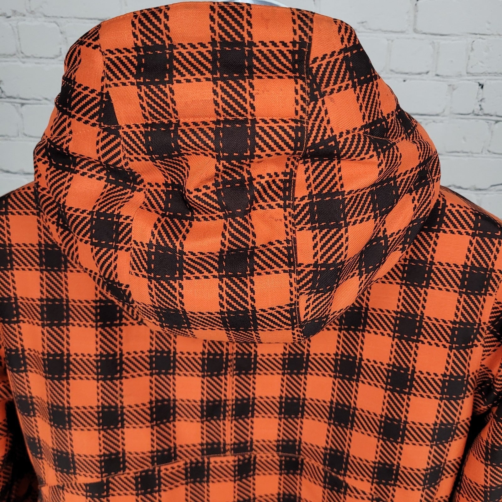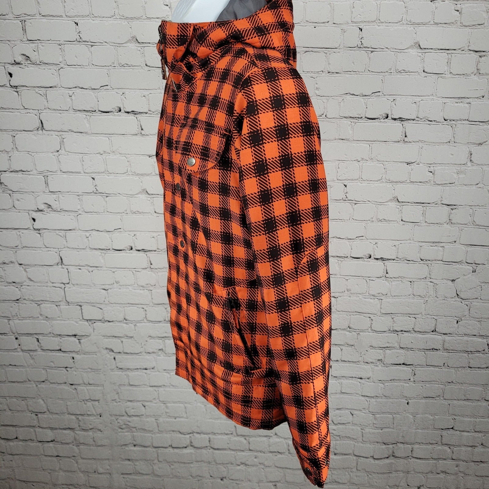 The Burton DryRide Orange Check Hooded Insulated Full Zip Jacket in size Medium is a stylish and functional outerwear piece perfect for travel, casual outings, or workwear. Made of polyester with a cozy polyester lining, this short jacket features a zipper and snap closure, zipped pockets, a hood, and a full zip design. It is designed for the colder seasons of winter, fall, and spring, making it a versatile addition to any man's wardrobe. The vibrant orange color and ski, outdoor, and sports theme add a fun and adventurous touch to this high-quality Burton jacket.