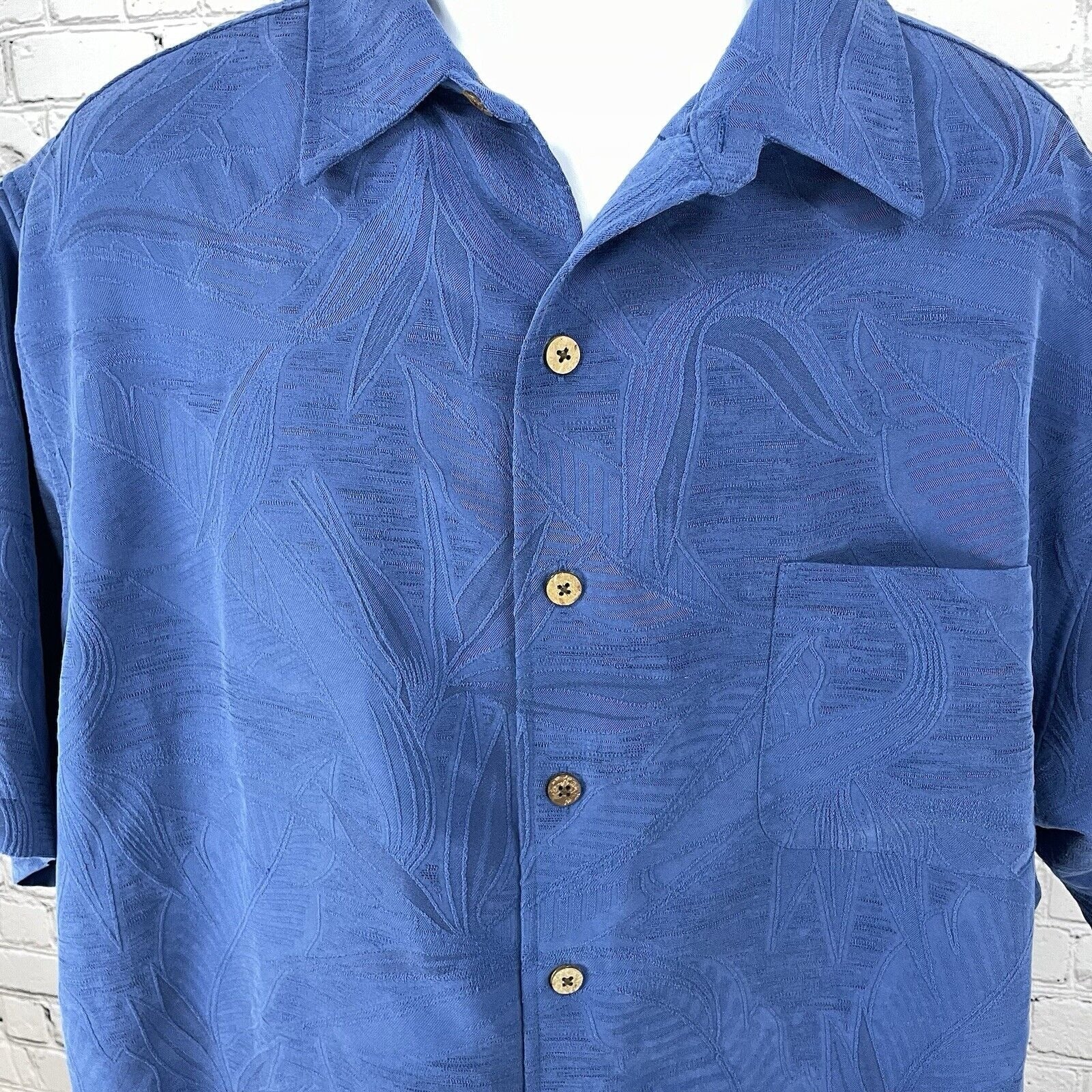 This Caribbean Blue Leaf Button-Up Short Sleeve Shirt in Big & Tall Size 2XT is perfect for a tropical or casual look. Made of polyester and modal, it features a relaxed fit with a collared neckline and a button closure. The Hawaiian and tropical theme is complemented by the leaf pattern and lightweight material, ideal for summer or spring occasions. With a chest size of 52 inches and a point collar style, this shirt offers both style and comfort, making it a versatile choice for travel, parties, or everyday wear.