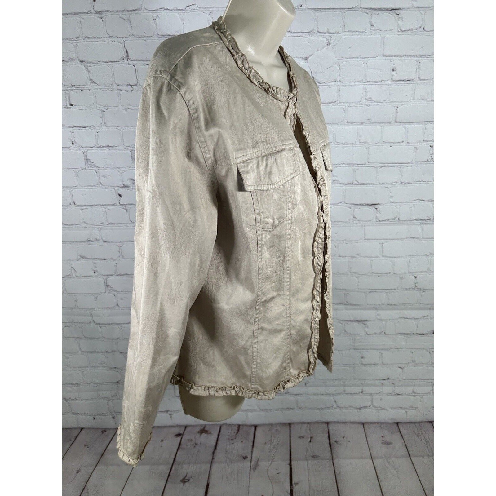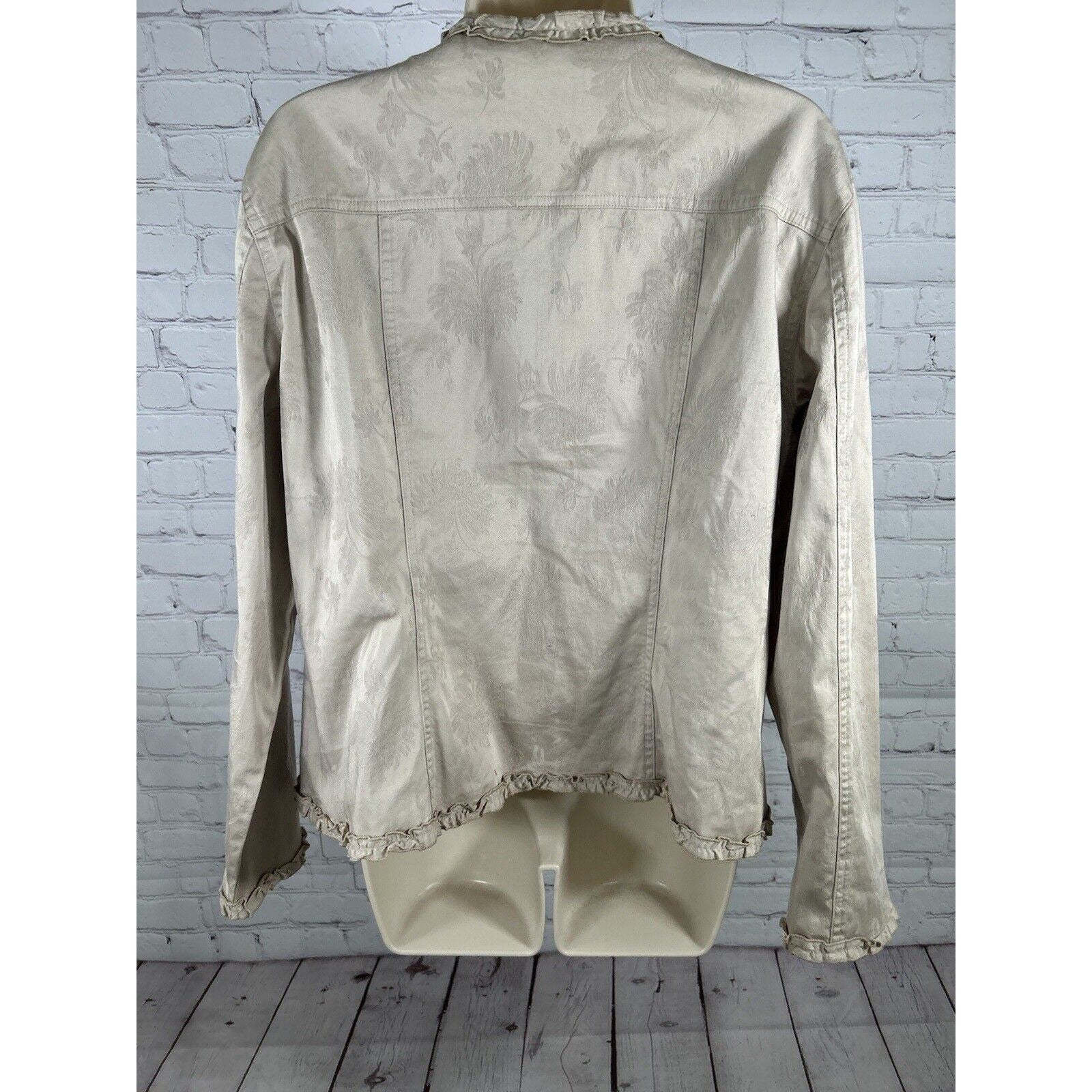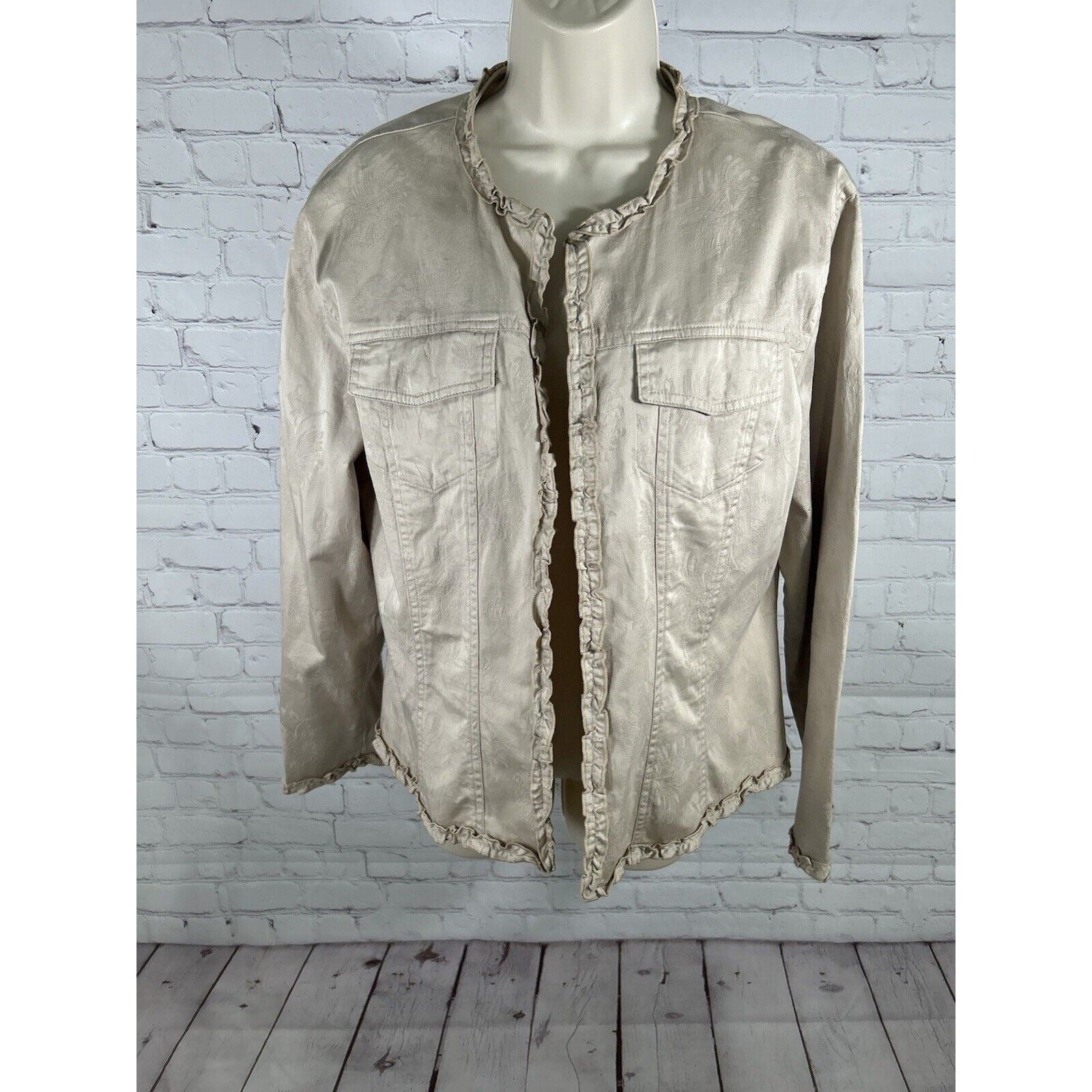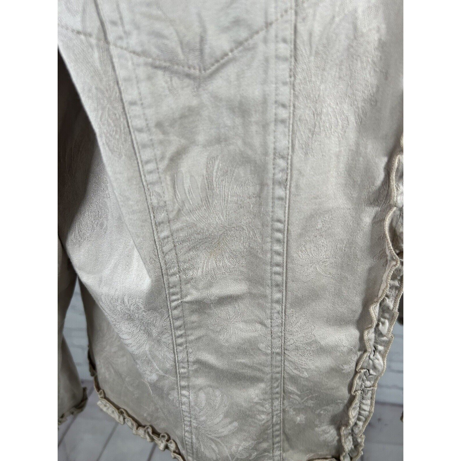 Chico’s Beige Long Sleeve Open Front Ruffle Trim Faint Floral Pattern Jacket M