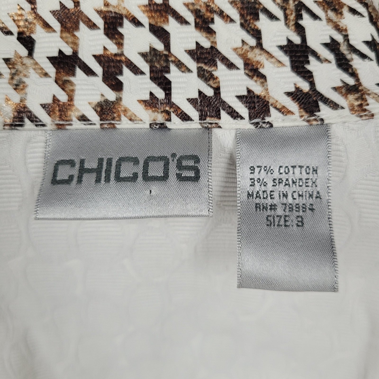 The Chico's Brown Metallic Houndstooth Lightweight Full Zip Moto Jacket in size 3 (US 16) is a stylish and versatile outerwear option for women. Made from a cotton blend with a houndstooth pattern, this short jacket features long sleeves, a zip closure, and zipped pockets for added convenience. With a collared neckline and a lightweight, stretchy design, it is suitable for various occasions including travel, parties, casual outings, and workwear. The brown color and basic jacket style make it a classic addition to any wardrobe, perfect for layering during all seasons.
