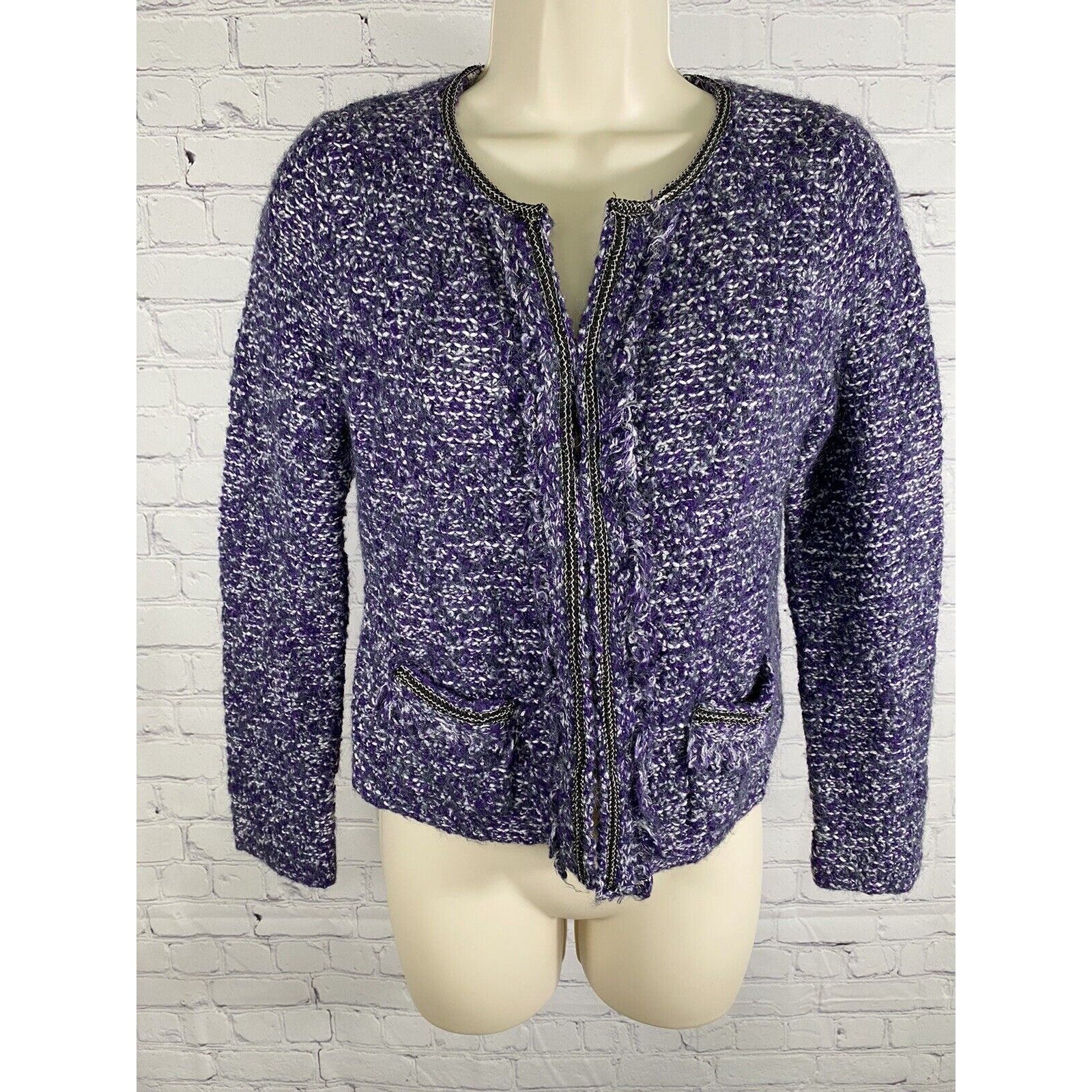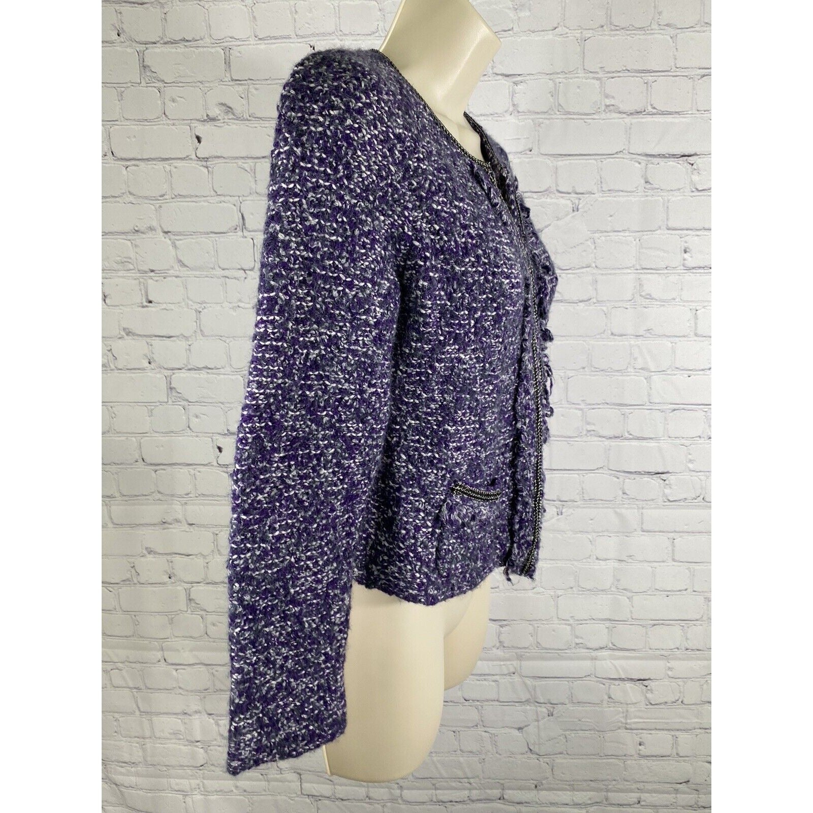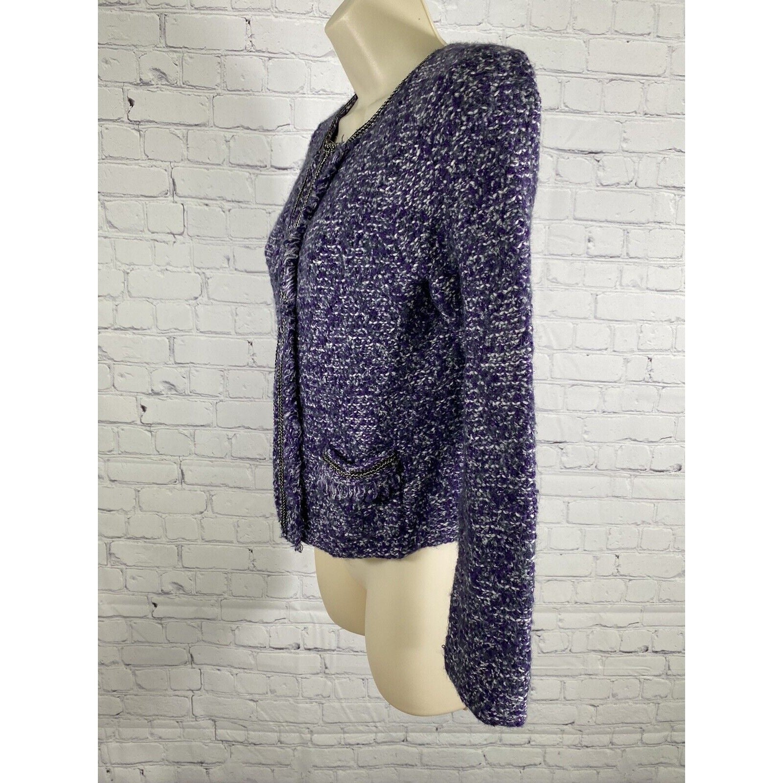 Chicos Purple White Gray Wool Blend Knit Sweater Jacket Hook Eye Closure XS
