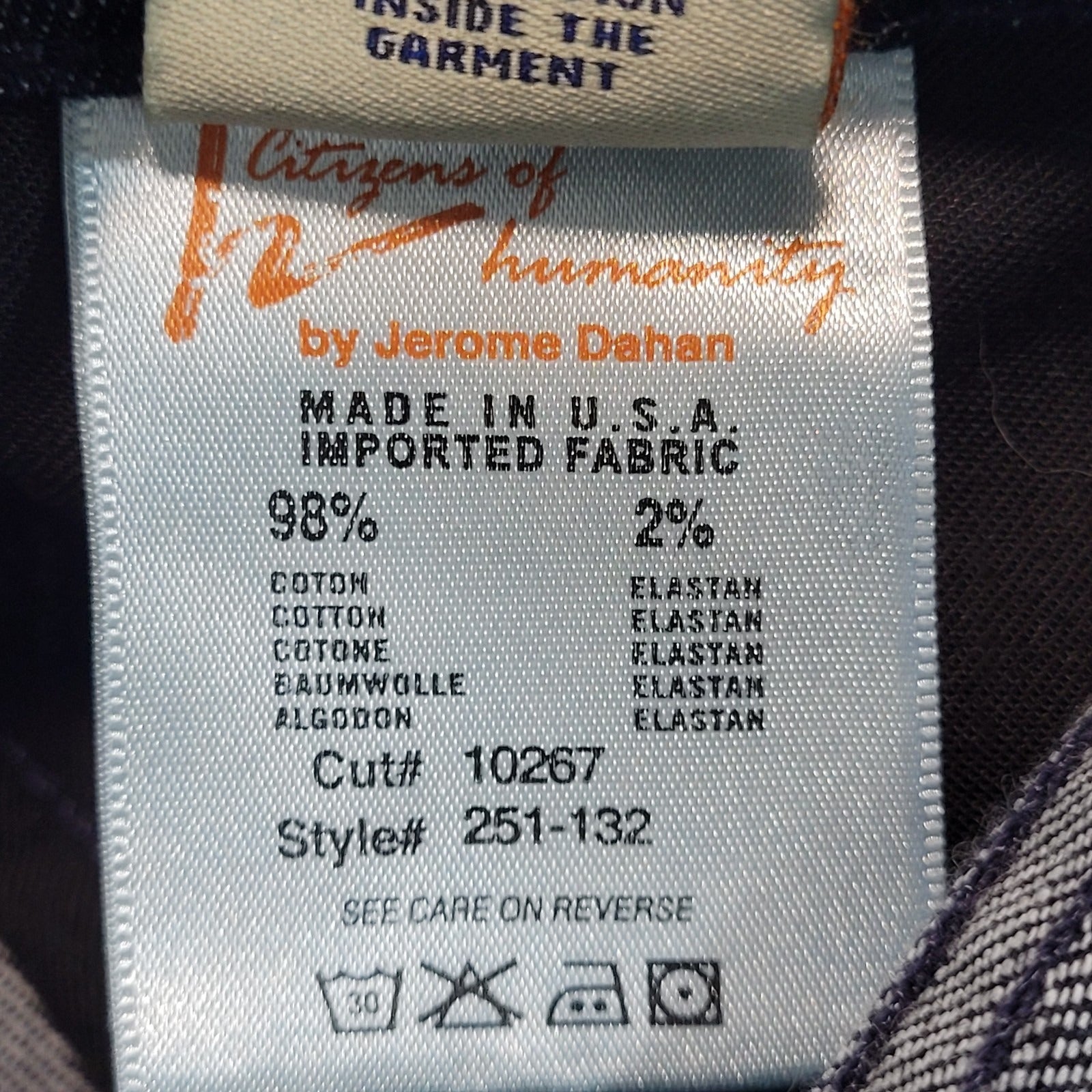 The Citizens of Humanity Blue Hutton #251 High Rise Wide Leg Stretch Jeans are a stylish and comfortable choice for women. Made with a blend of spandex and cotton, these jeans feature a dark wash and solid blue color. With a mid rise and 5-pocket design, these wide-leg jeans provide a flattering fit and are perfect for any season. The zip and button closure, along with the machine washable fabric, make these jeans easy to wear and care for. Made in the USA, these jeans showcase the brand's logo accents, making them a chic and versatile addition to any wardrobe.