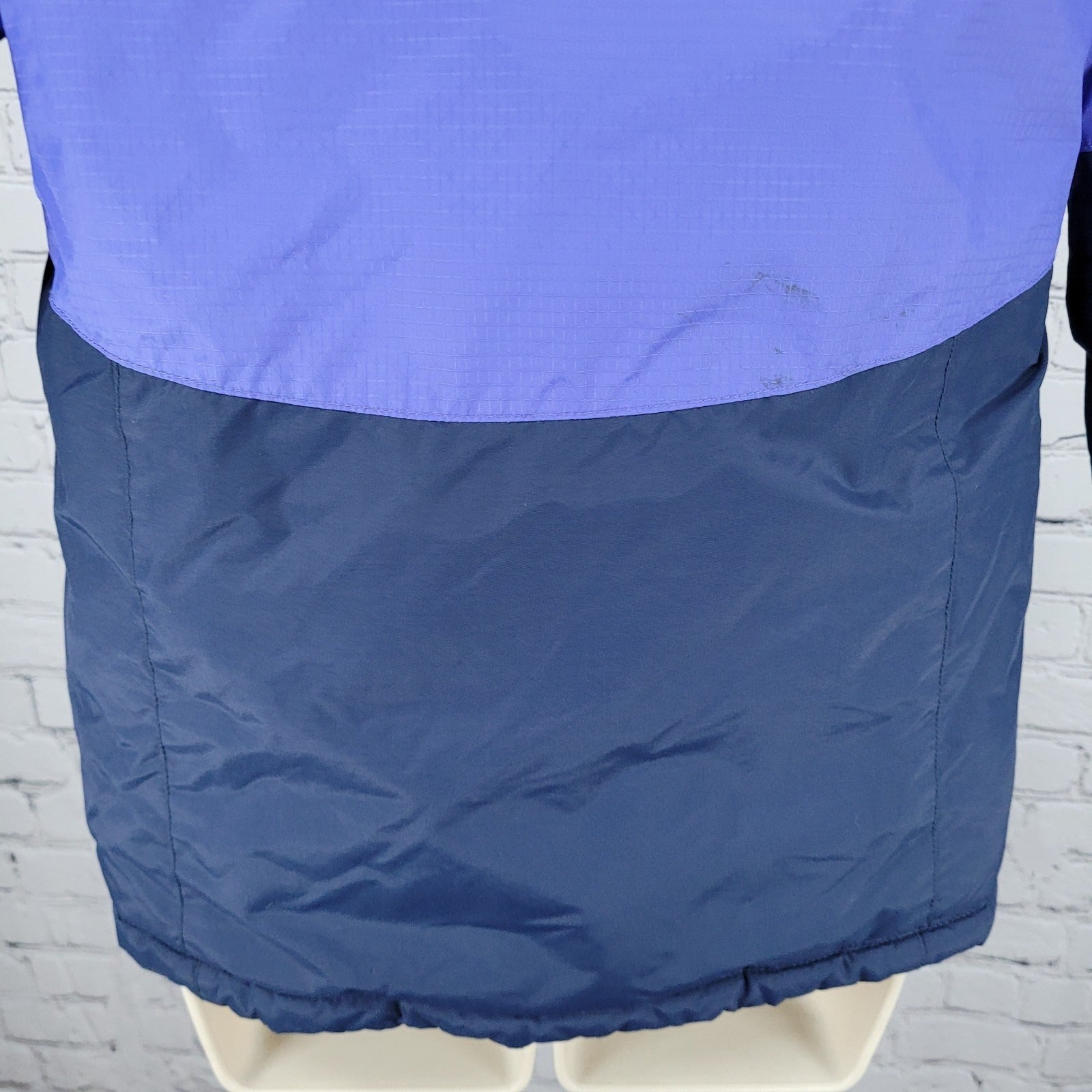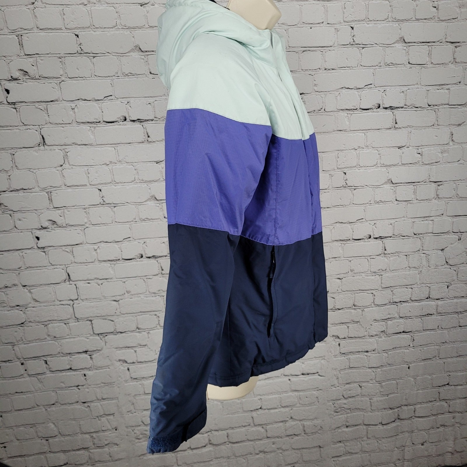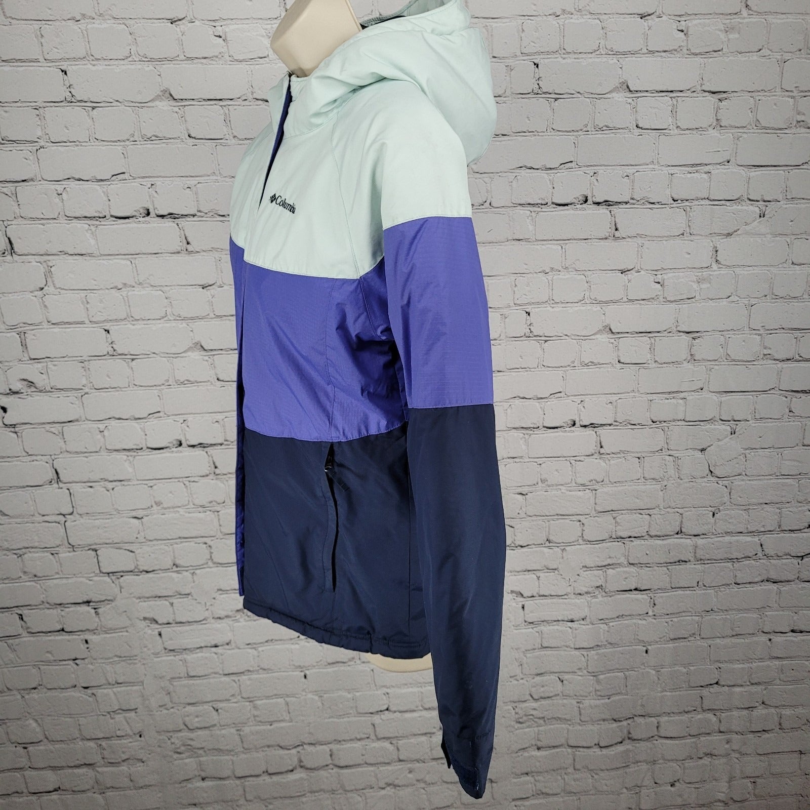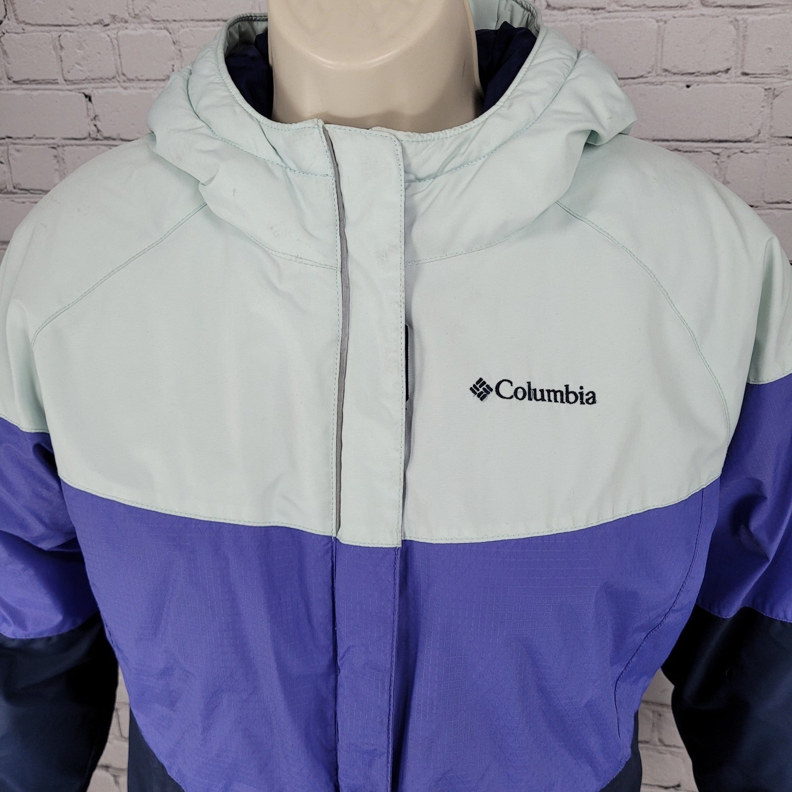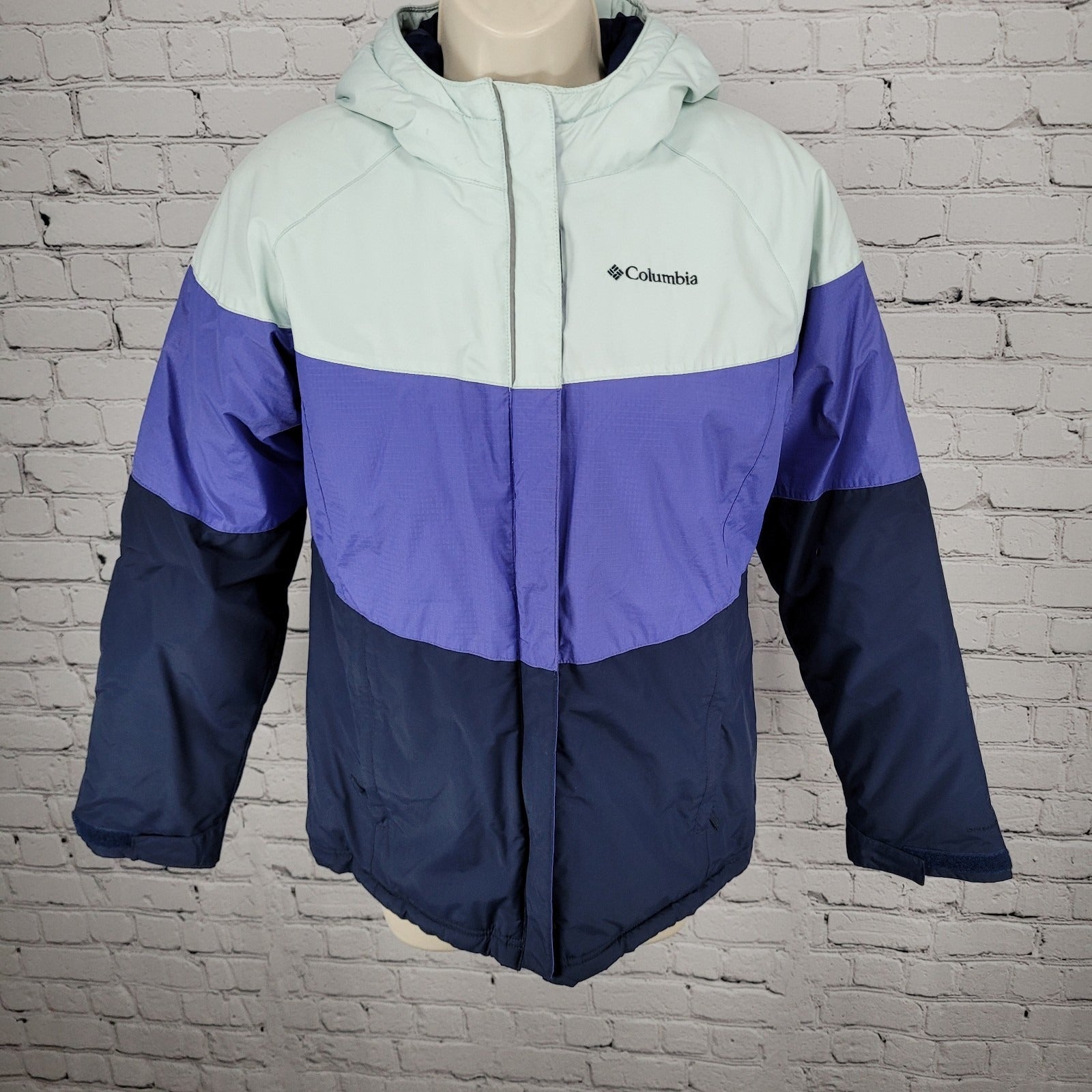The Columbia Omni Shield Purple & Blue Insulated Hooded Jacket in youth size Large is a stylish and functional outerwear option for kids. Made with 100% polyester outer shell and 100% nylon lining, this jacket is perfect for travel, activewear, or casual occasions. The colorblock design with embroidered logo accents adds a fun touch to this basic jacket, which features zipped pockets, a hood, and a full zip closure for easy wear. With a chest size of 36 inches and a size of L, this Columbia jacket is a great choice for the winter, fall, and spring seasons.