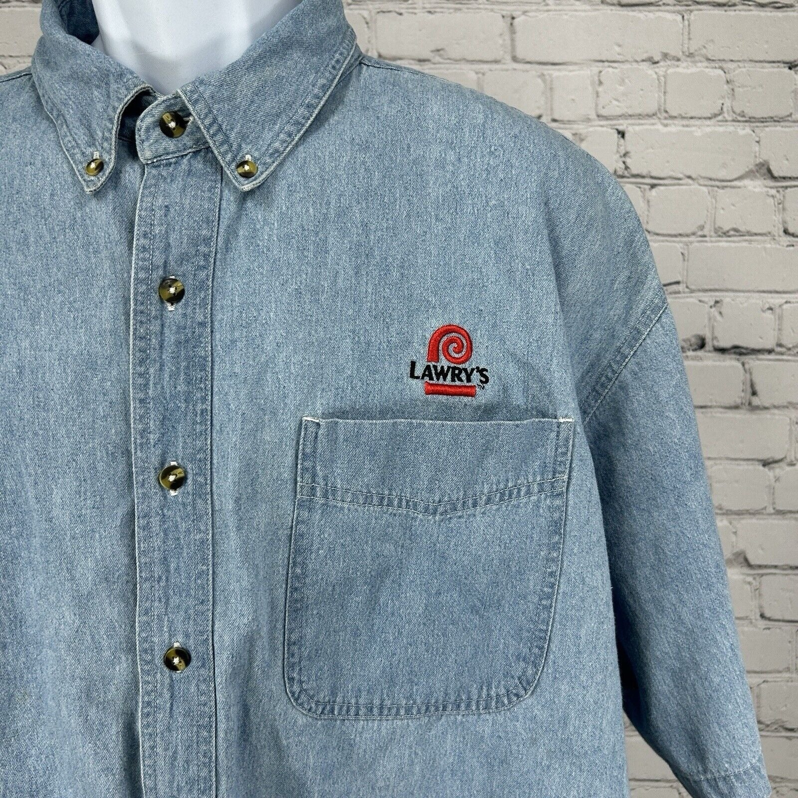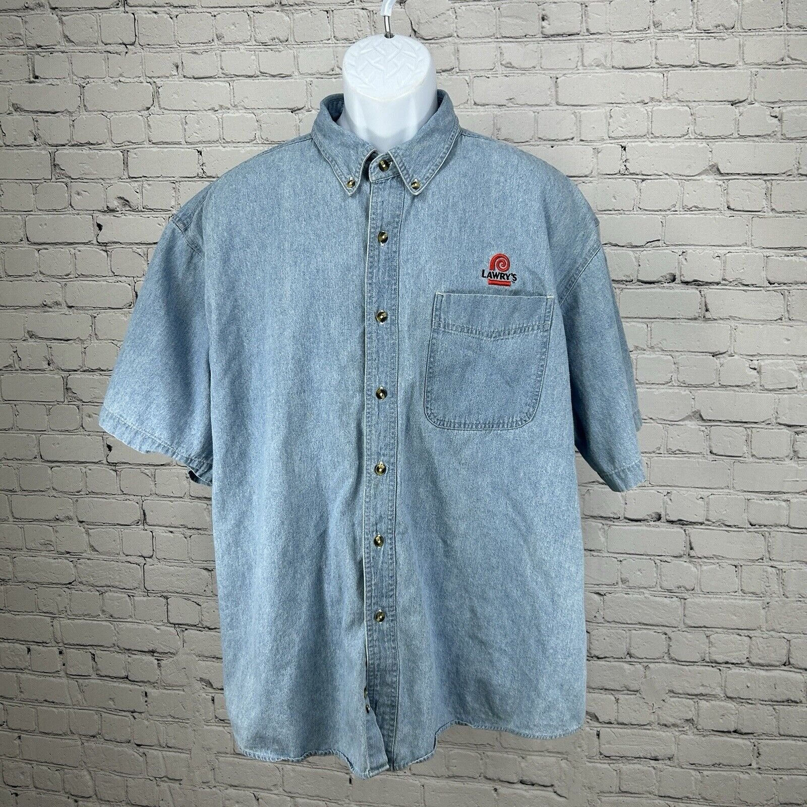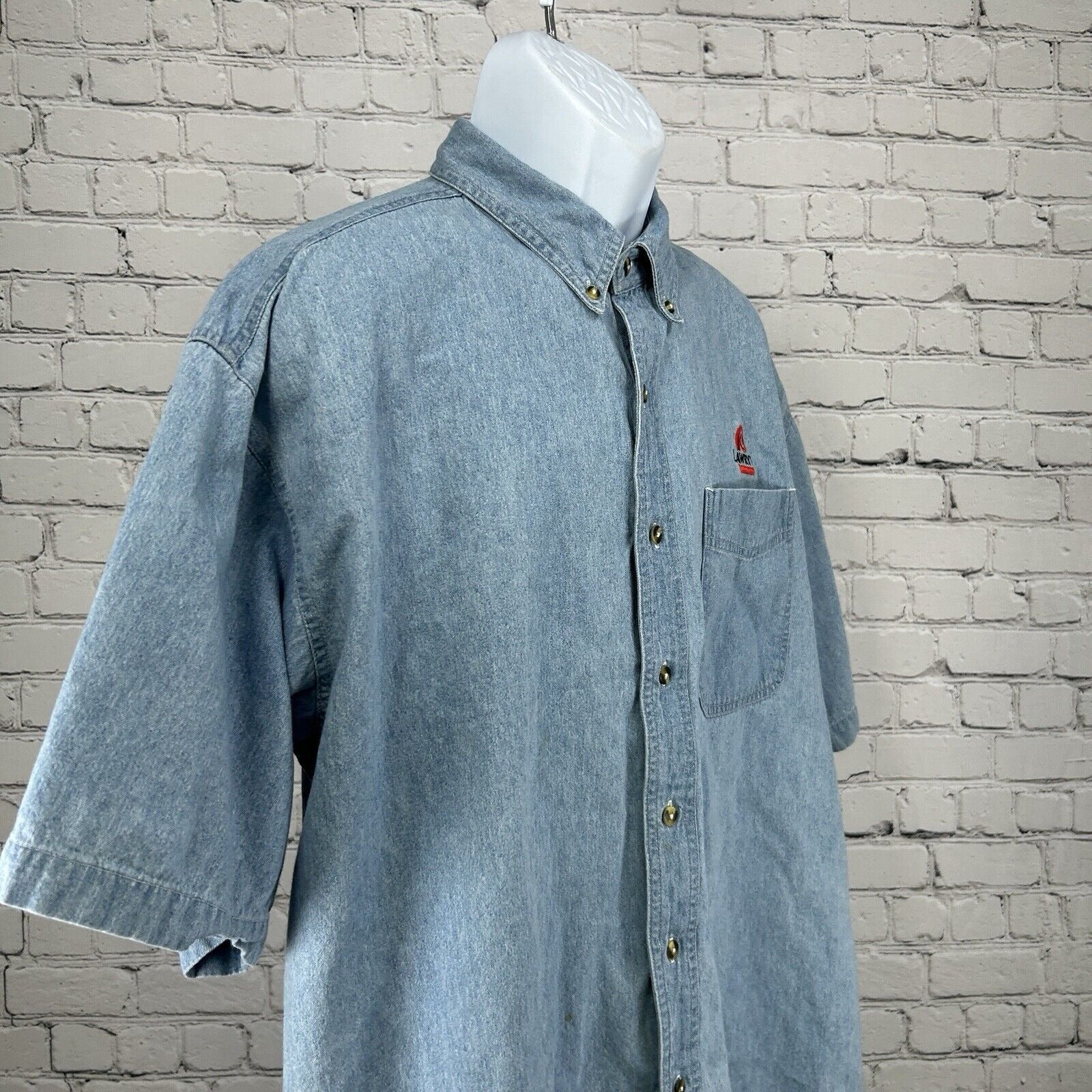 The Copa Banana Lawrys shirt is a casual button-down shirt designed for men in size XL. Made of 100% cotton denim fabric, this short sleeve shirt features a collared neckline with a button-down collar style. The blue jean shirt includes button accents, an embroidered logo, and convenient pockets. With a solid pattern and a regular fit, this easy-care shirt is perfect for a variety of occasions, including casual outdoor activities or classic cooking events.