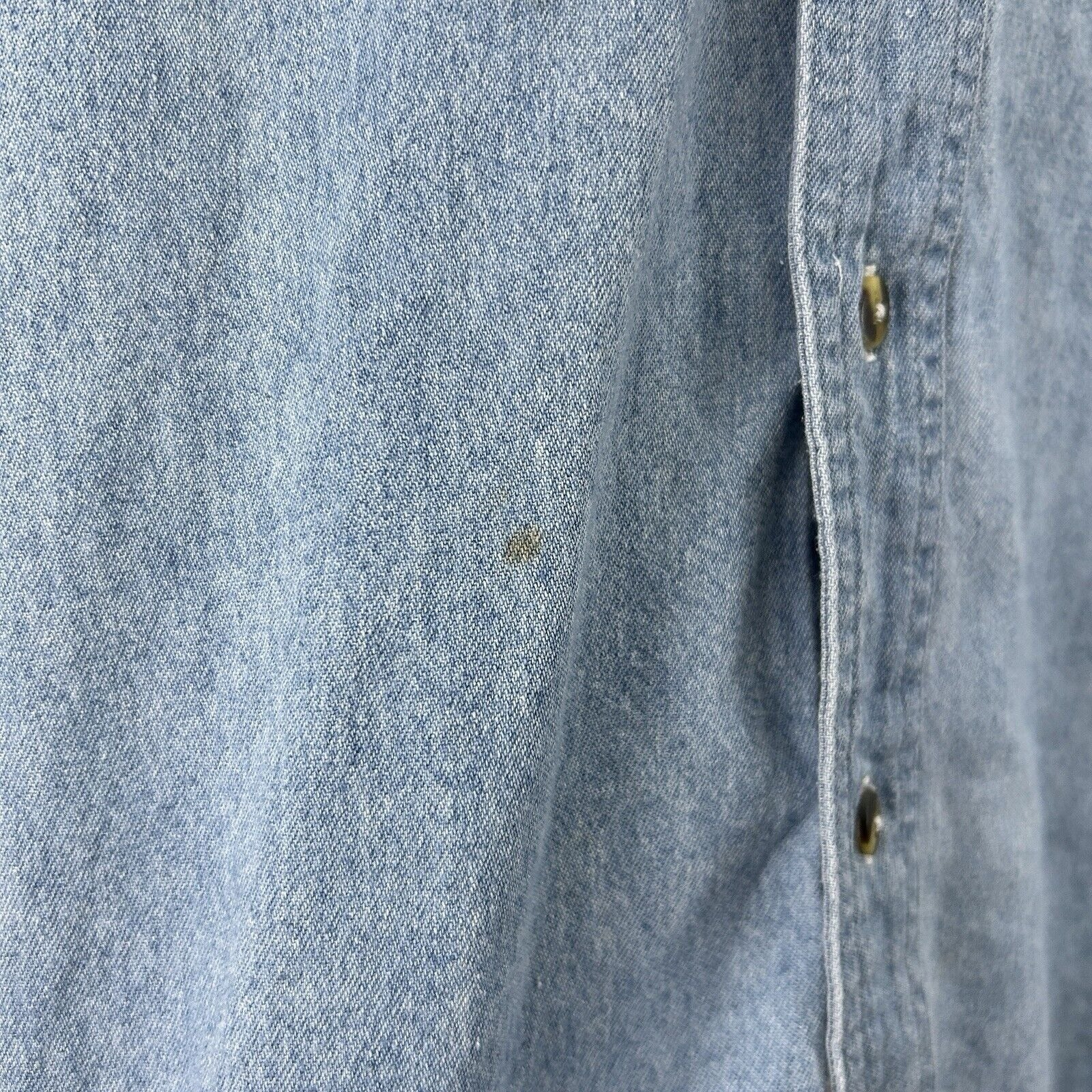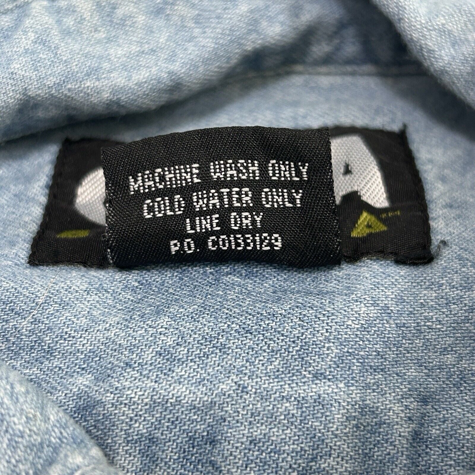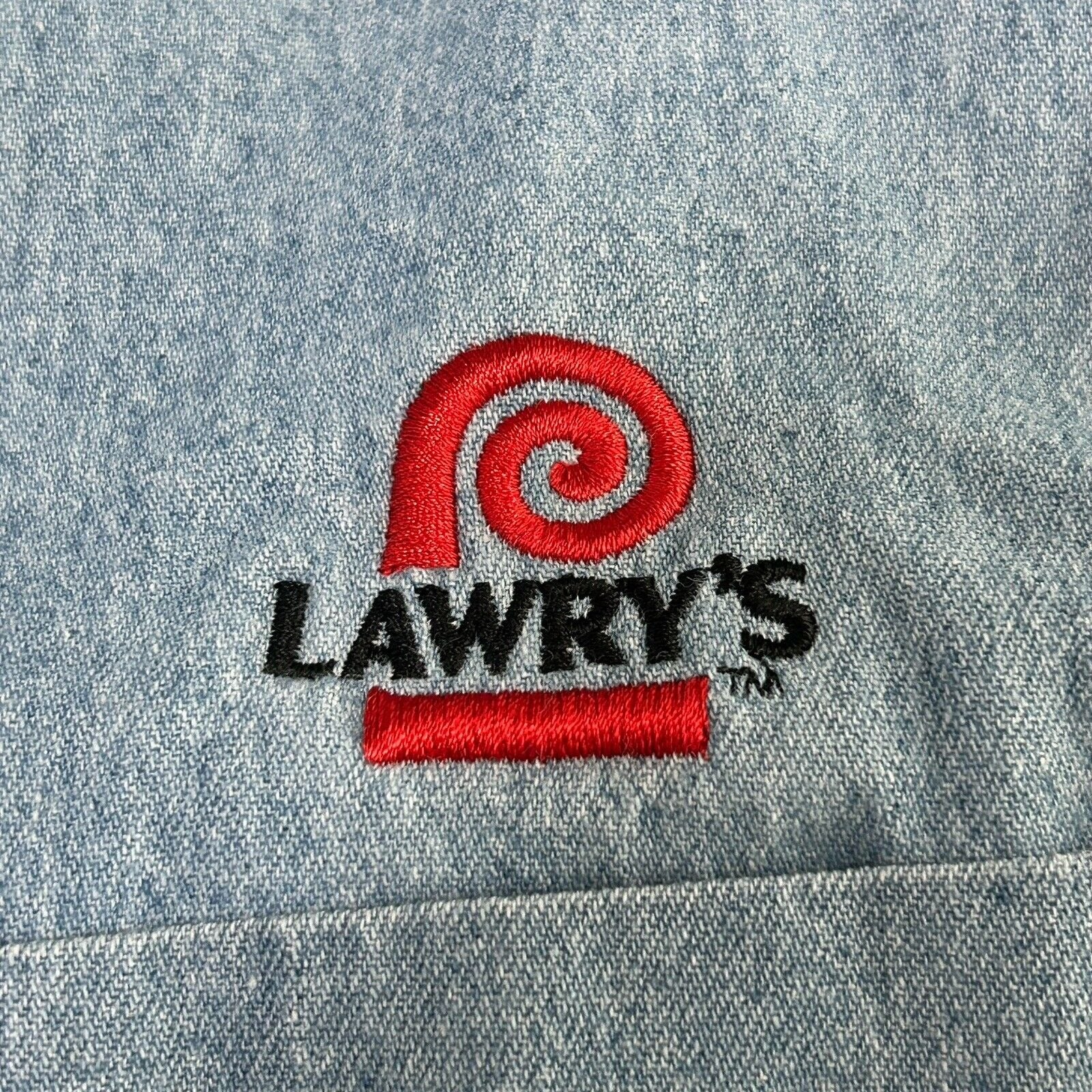 The Copa Banana Lawrys shirt is a casual button-down shirt designed for men in size XL. Made of 100% cotton denim fabric, this short sleeve shirt features a collared neckline with a button-down collar style. The blue jean shirt includes button accents, an embroidered logo, and convenient pockets. With a solid pattern and a regular fit, this easy-care shirt is perfect for a variety of occasions, including casual outdoor activities or classic cooking events.