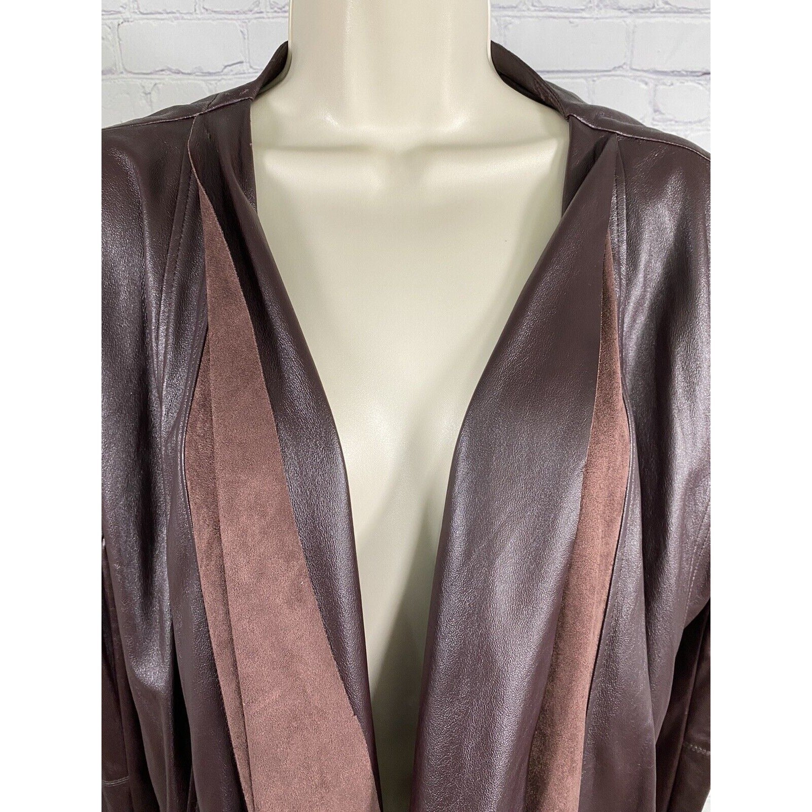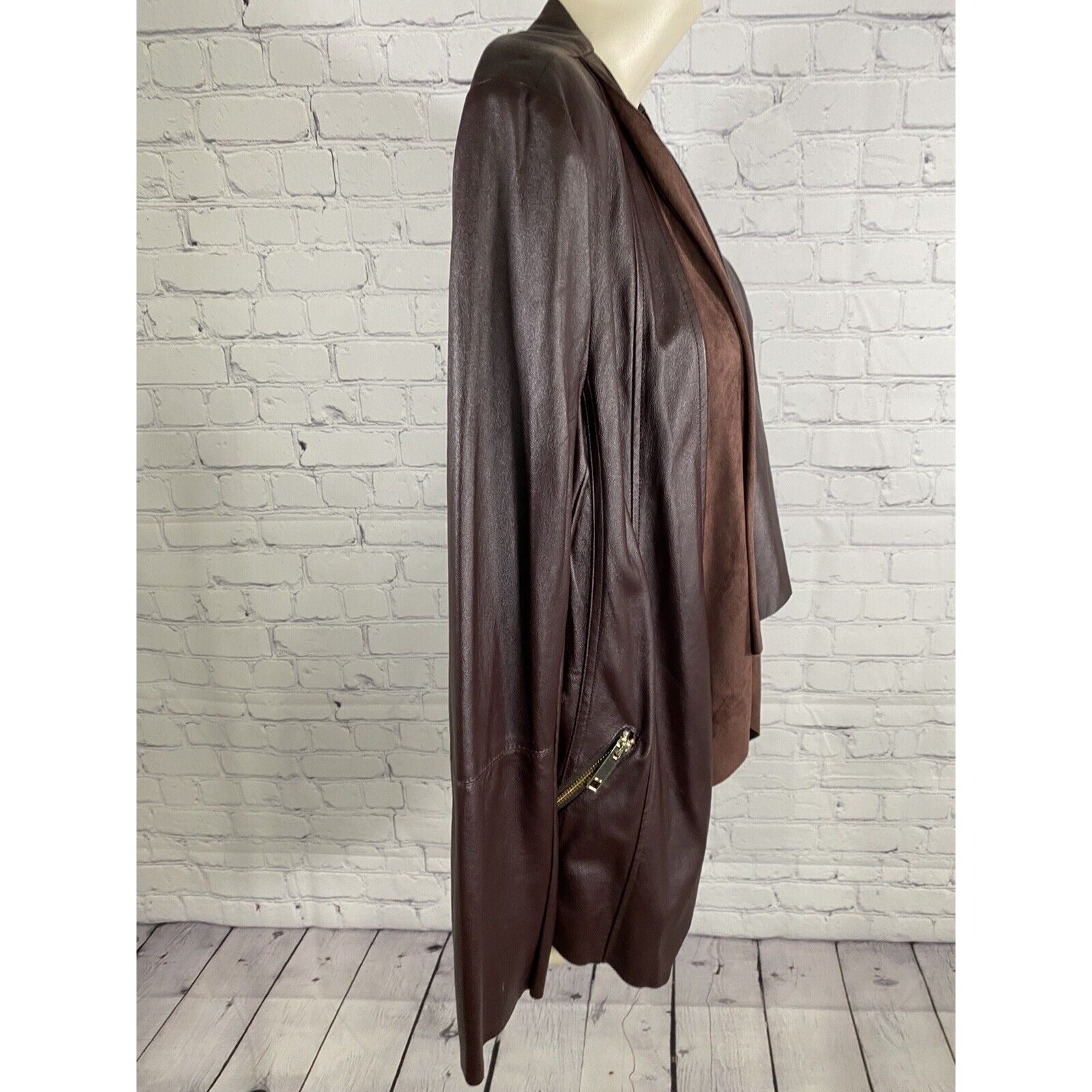 Dolce Cabo Brown Open Drapey Front Soft Vegan Leather Zipper Pockets Jacket M