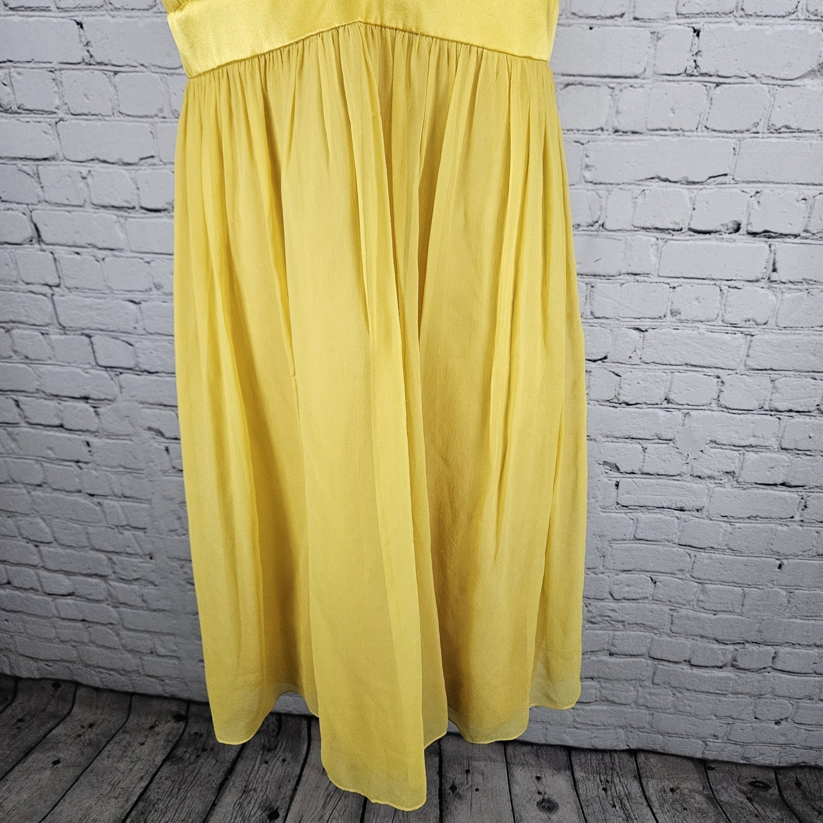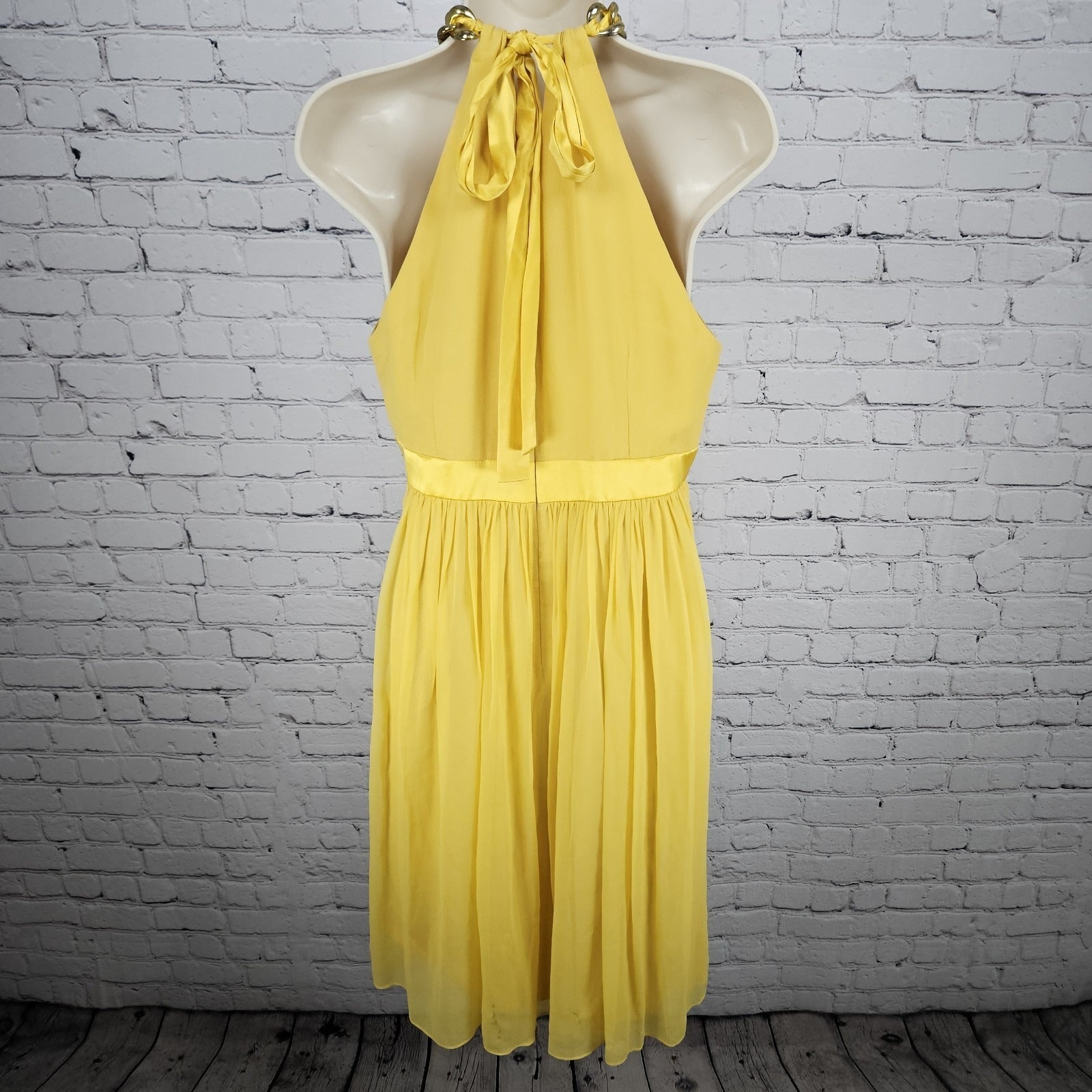 Donna Morgan Yellow 100% Silk Chiffon Gold Chain Halter Tie Knee Length Dress 10