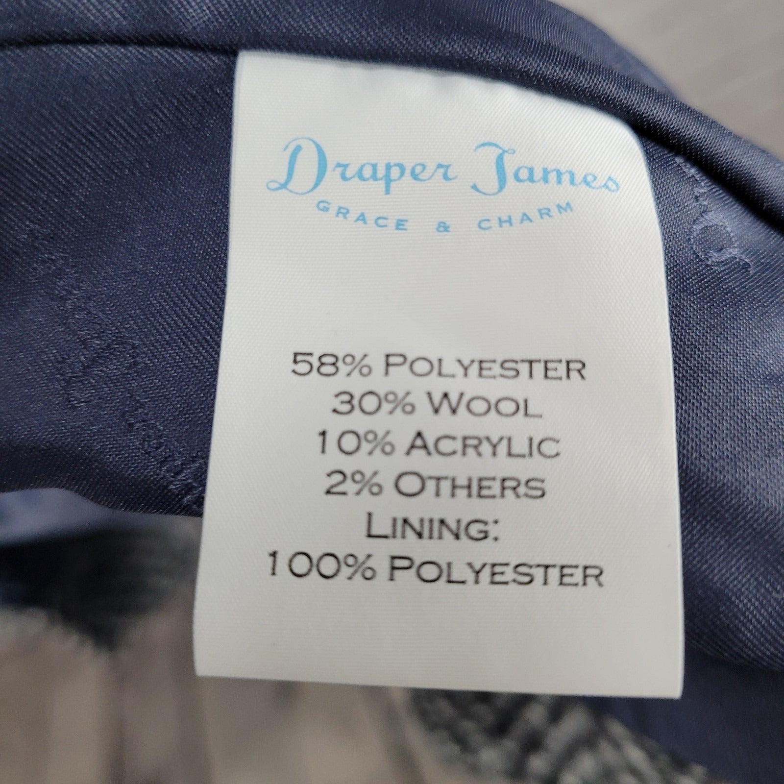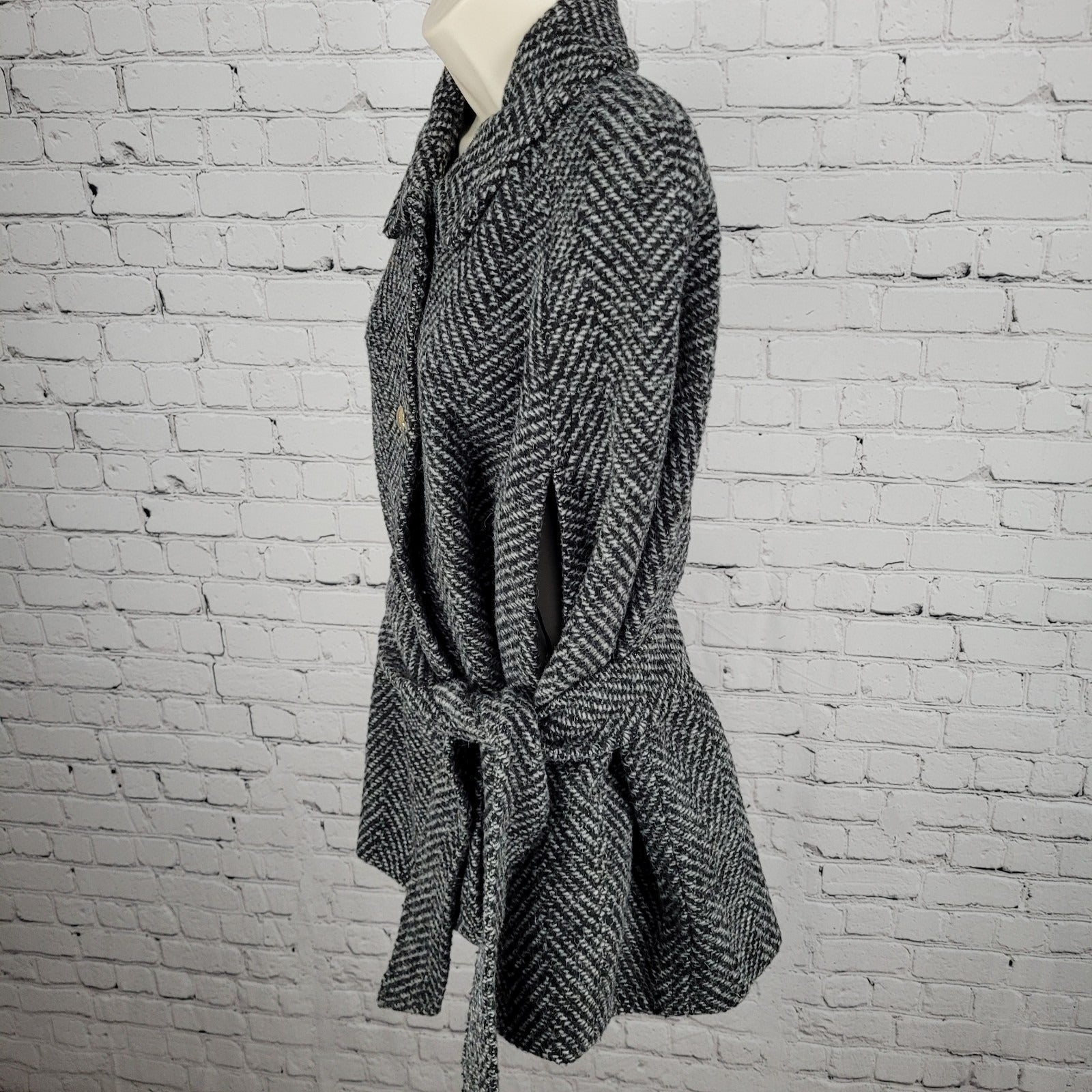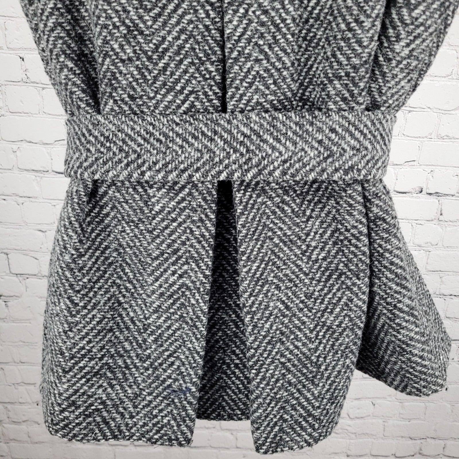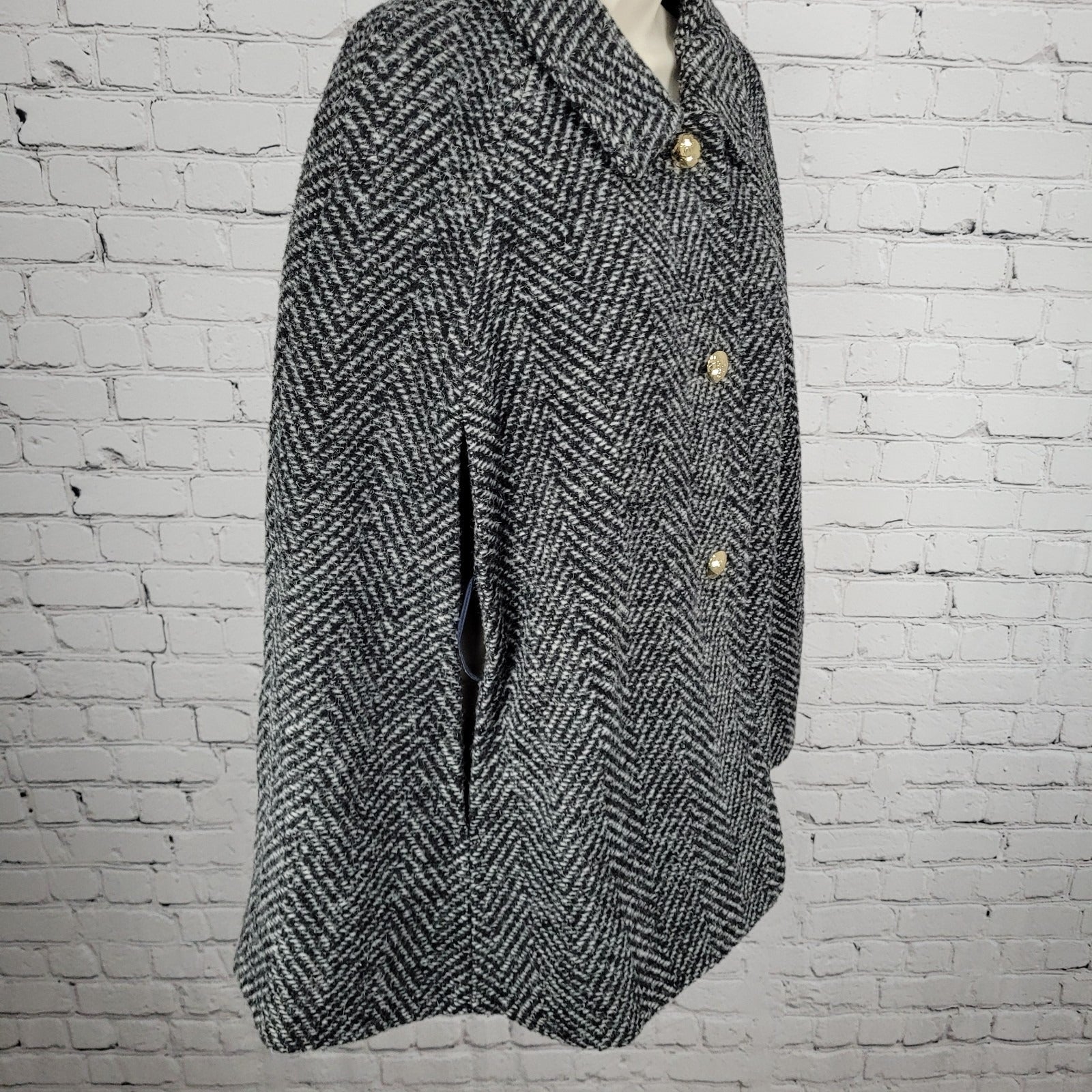 The Draper James Black White Wool Blend Tweed Belted Sleeveless Cape Coat in size M/L is a stylish and versatile outerwear piece for women. Made from a herringbone patterned wool tweed fabric, this mid-length coat features a button closure, collar, and lining for added sophistication. Perfect for various occasions including workwear, casual outings, parties, or travel, this classic black and white coat is a fashionable choice for the winter, fall, or spring seasons. The belted design adds a flattering touch to the overall look.