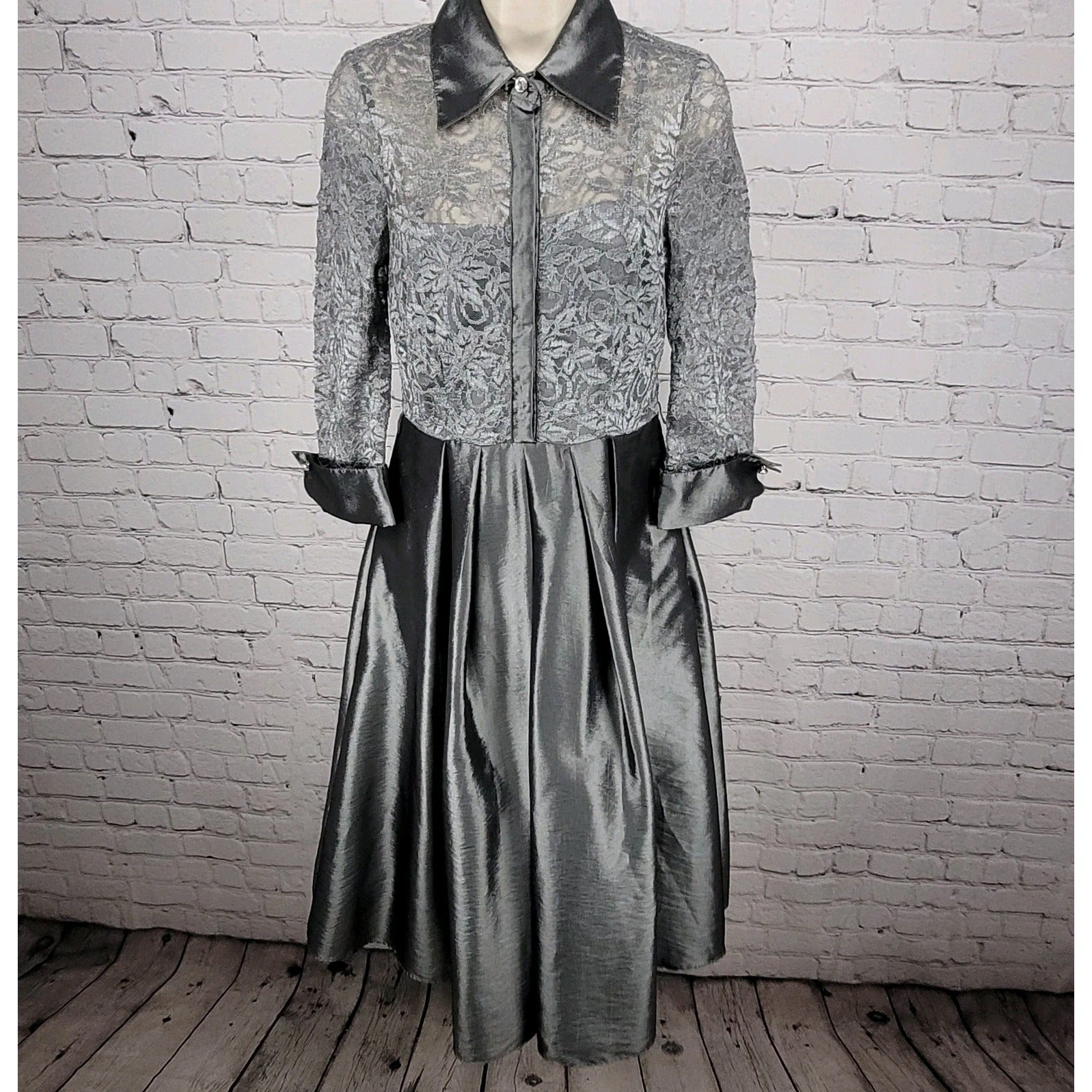 The Eliza J Grey Silver Lace 3/4 Sleeve Rhinestone Button A-Line Dress 2 is a stylish and elegant choice for women looking for a sophisticated outfit. The dress features a beautiful lace fabric and collared neckline, adding a touch of glam to the classic A-line silhouette. The 3/4 sleeves and button closure add a feminine and eye-catching detail to this dress, making it perfect for various occasions such as formal events or special occasions. The dress is lined for added comfort and quality, making it a luxurious addition to any wardrobe.