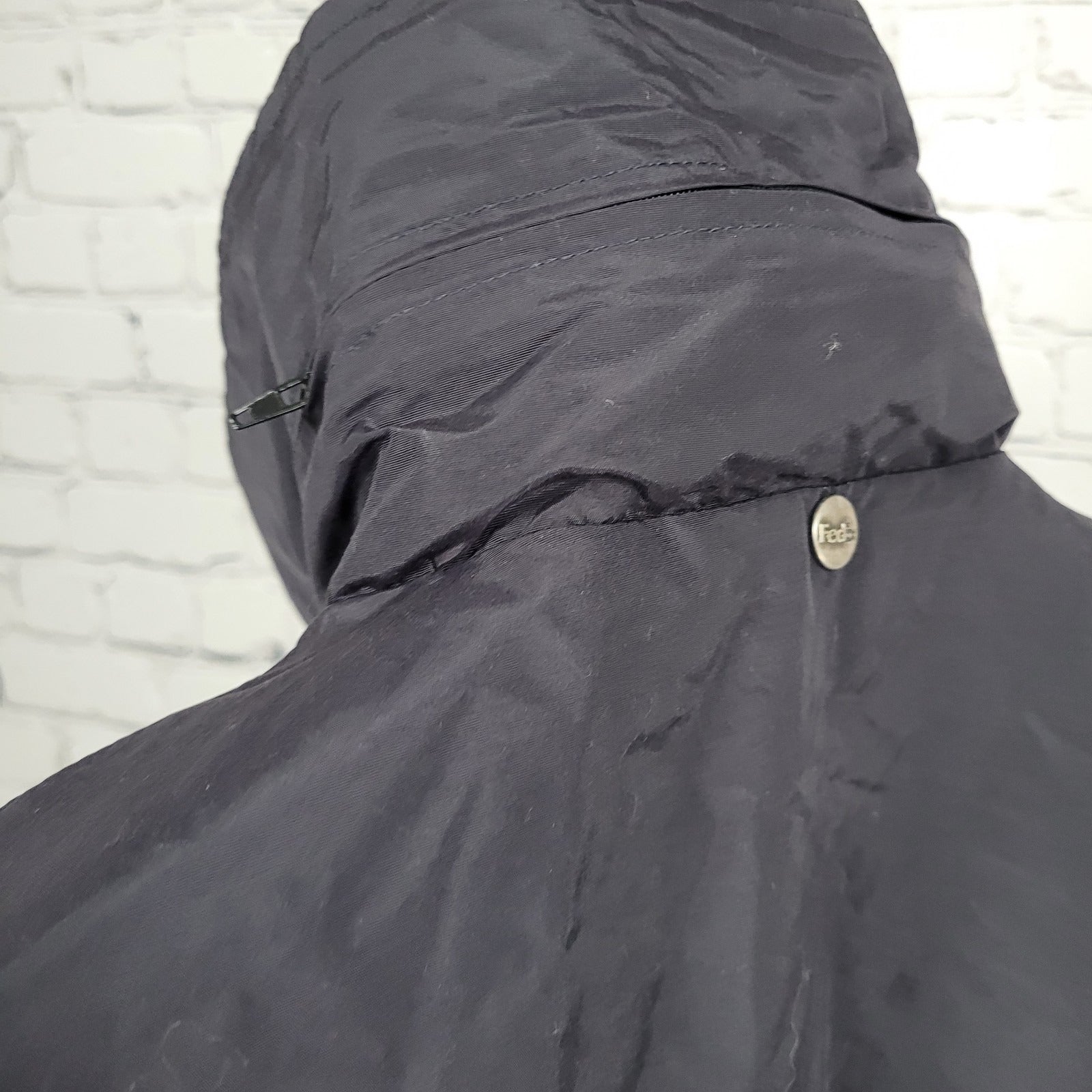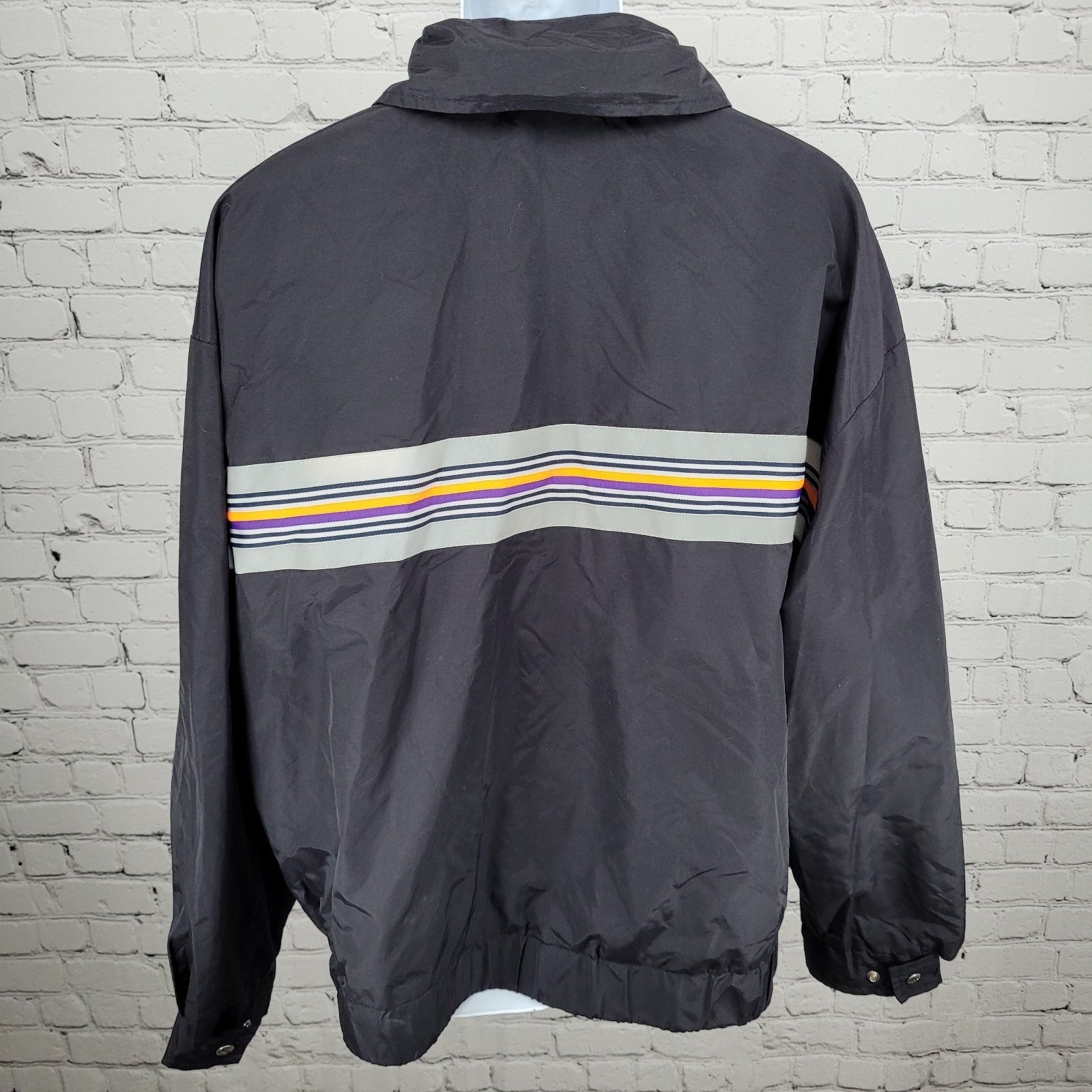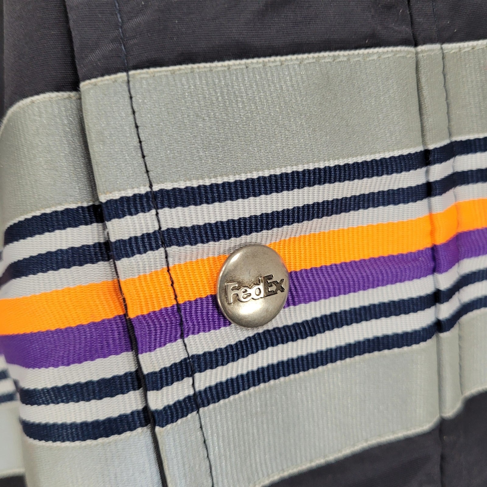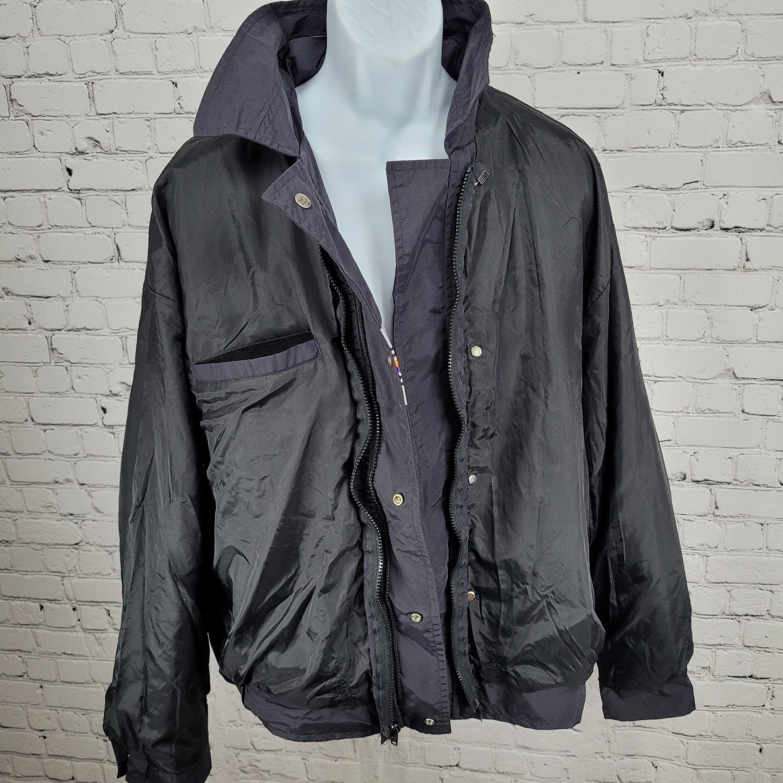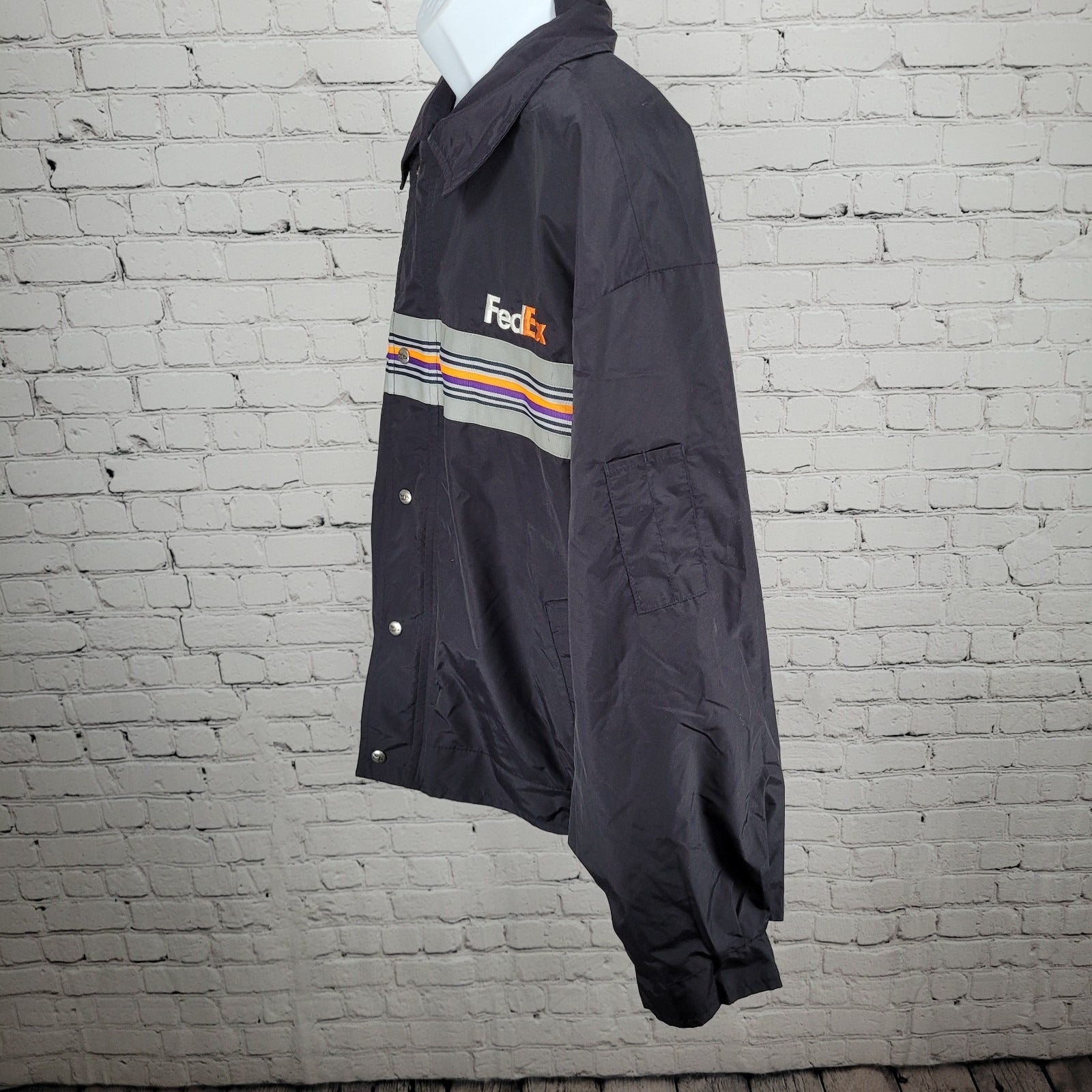 The Fedex Black Double Zip Snap Hideable Hood Workwear Windbreaker Jacket in size 3XL is a versatile and practical outerwear option for men. Made of durable nylon with a mid-length design, it features a solid black color with reflective accents for added safety. This windbreaker jacket is perfect for travel, casual wear, and work, with a hood for added protection and a lightweight, packable design for easy transport. With a zip and snap closure, lined interior, and multiple pockets, this jacket is designed for comfort and functionality in all seasons.