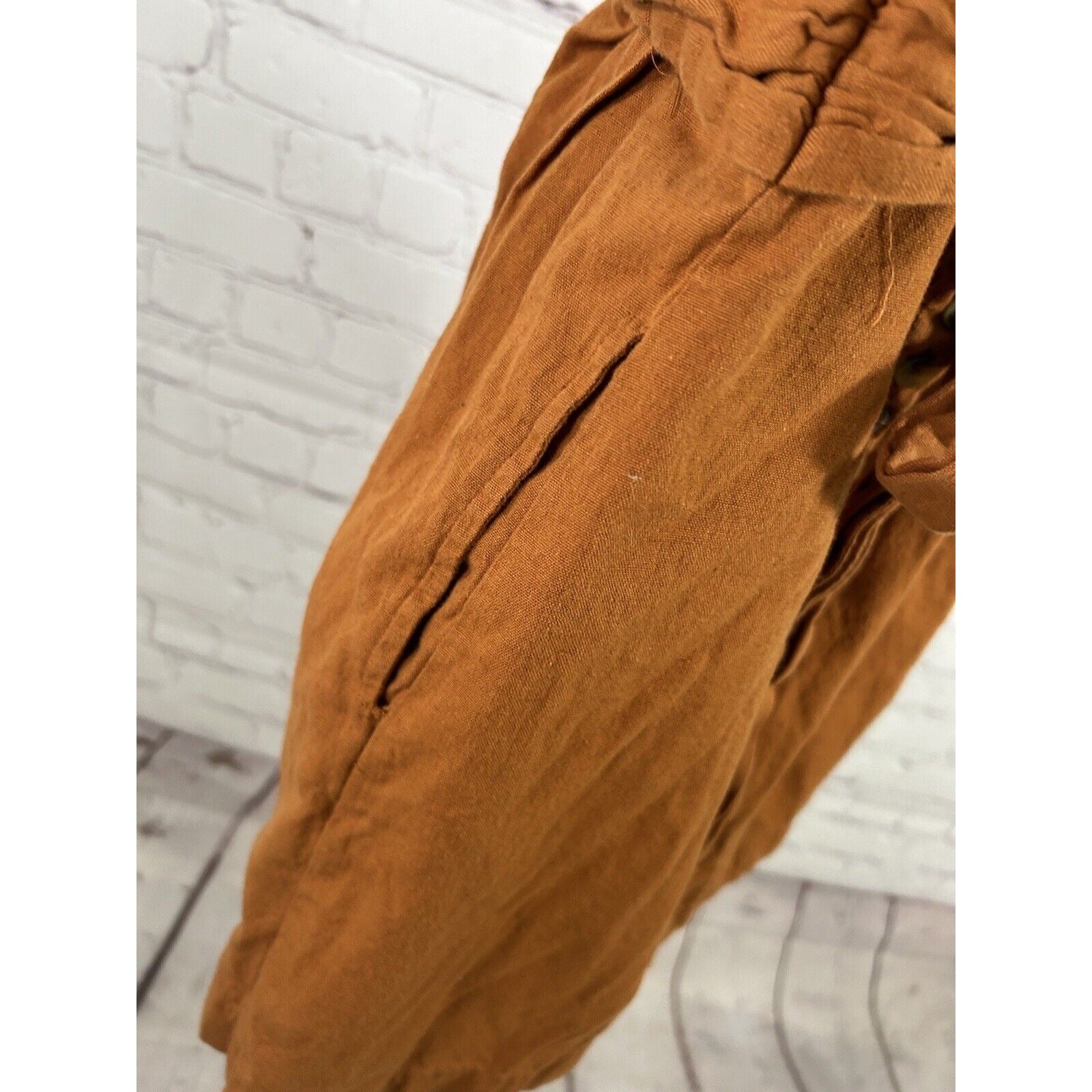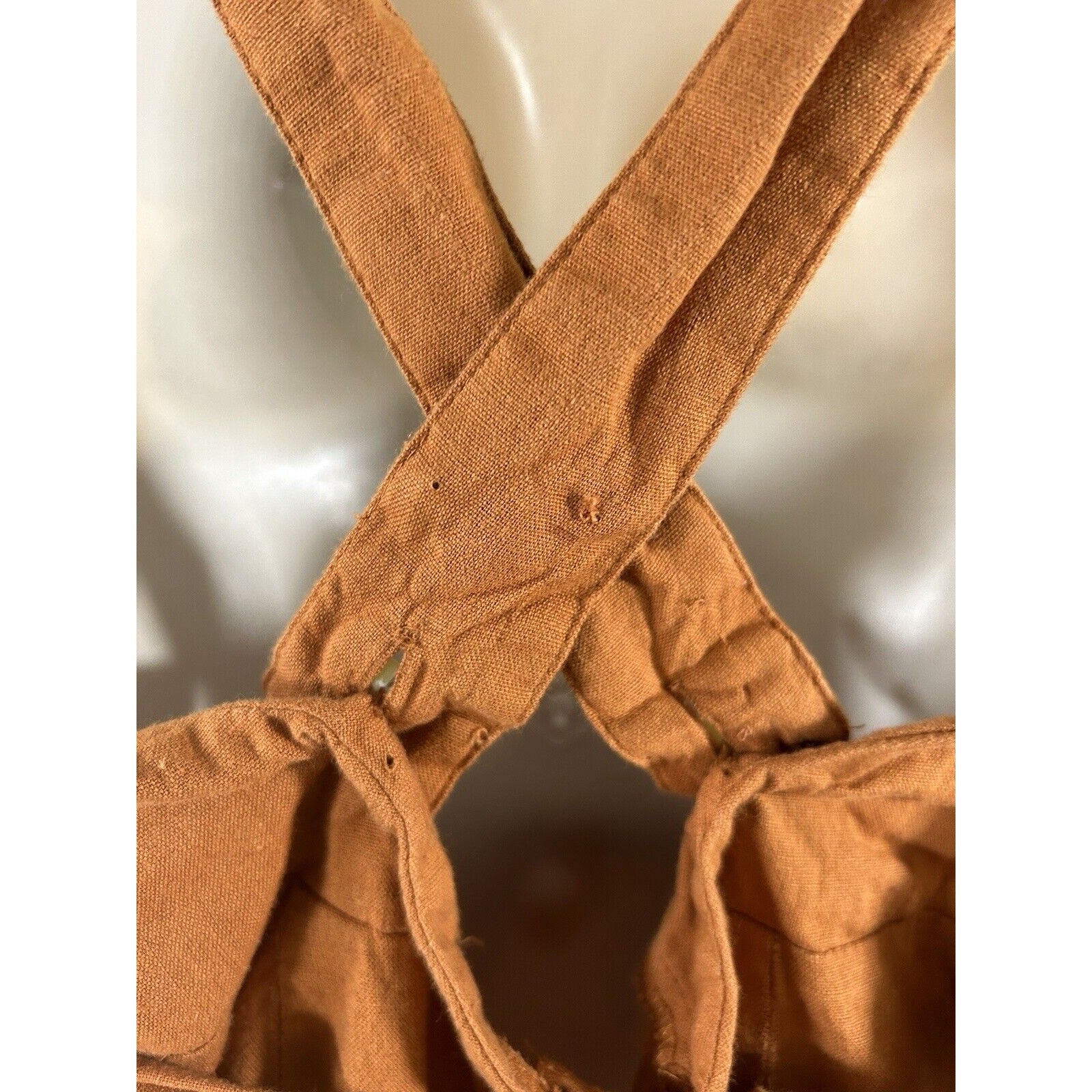 Several pin sized holes on straps near back. Eye for hook and eye closure is missing. See photos for reference.