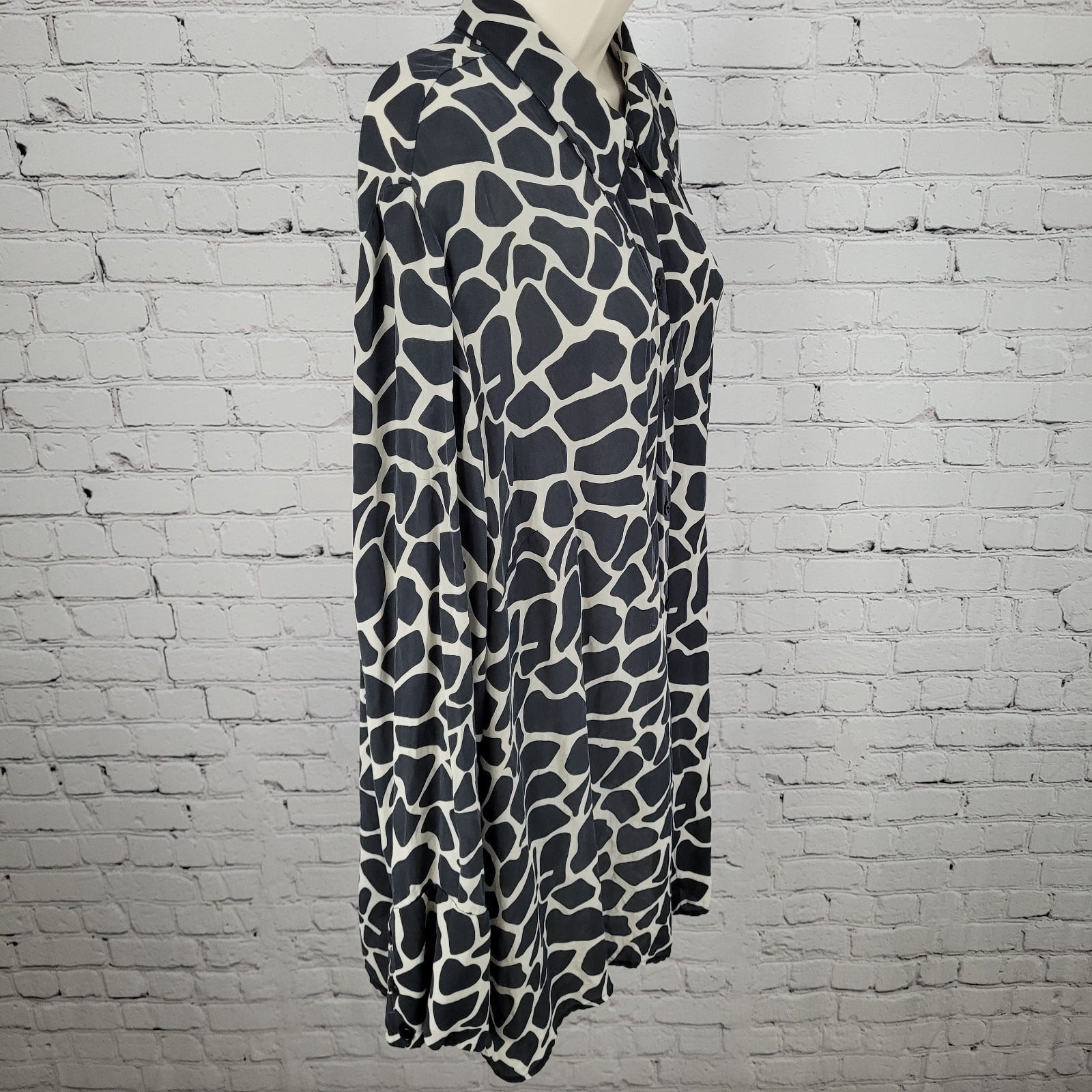 The INC Black 100% Silk Animal Print Button Up Long Sleeve Blouse Shirt in size 22W is a stylish and versatile top for women. Made from luxurious silk material, this blouse features a striking animal print pattern, perfect for adding a touch of flair to any outfit. The long sleeves and button-up style make it a classic and chic option for both casual and dressy occasions. With its bold design and high-quality material, this blouse is sure to make a statement in any wardrobe.