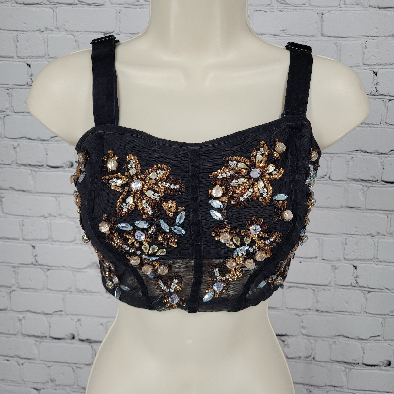 Intimately Free People Black Rhinestone Sequin Mesh Crop Top Bustier Size XS