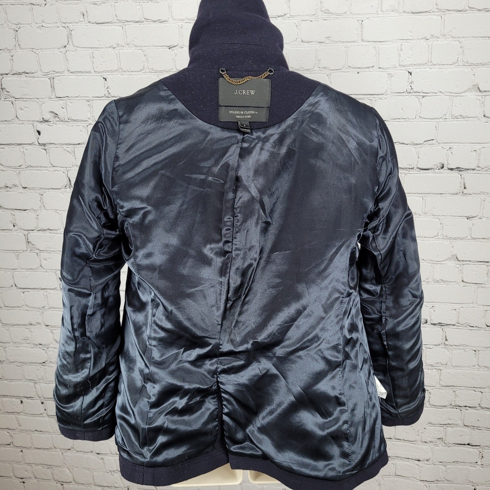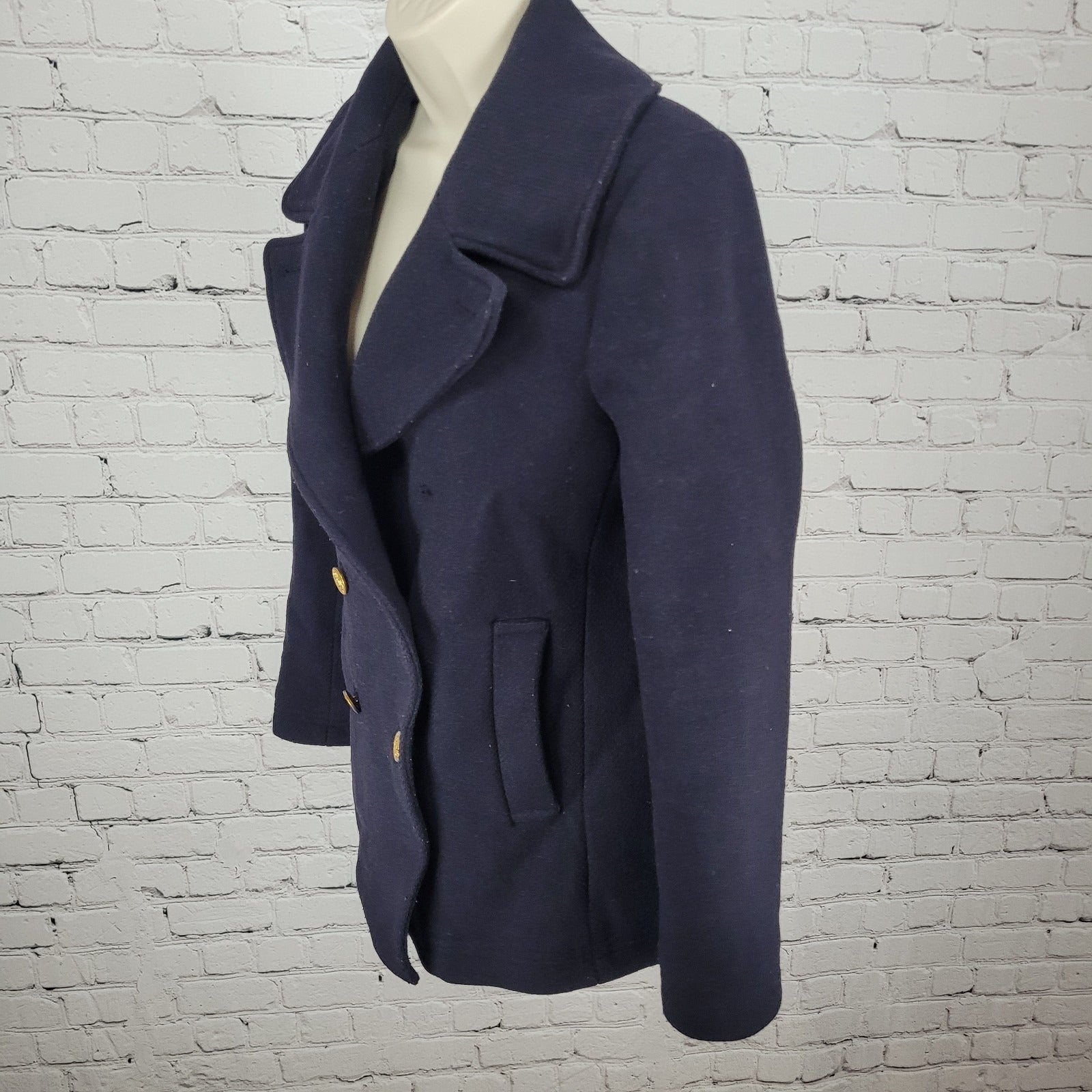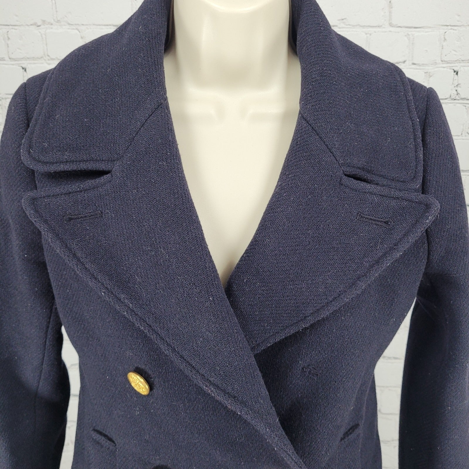 The J.CREW Stadium Cloth By Nello Gori Navy Wool Blend Buttoned Pea Coat in size 2 is a stylish and versatile outerwear piece perfect for various occasions. Made with wool and featuring a solid blue color, this mid-length coat has long sleeves, a collared neckline, and a button closure. The classic and preppy design, along with the lined interior and pockets, make it a fashionable choice for winter, fall, and even spring. Crafted by J.CREW, this coat is a timeless addition to any woman's wardrobe, offering both sophistication and practicality.