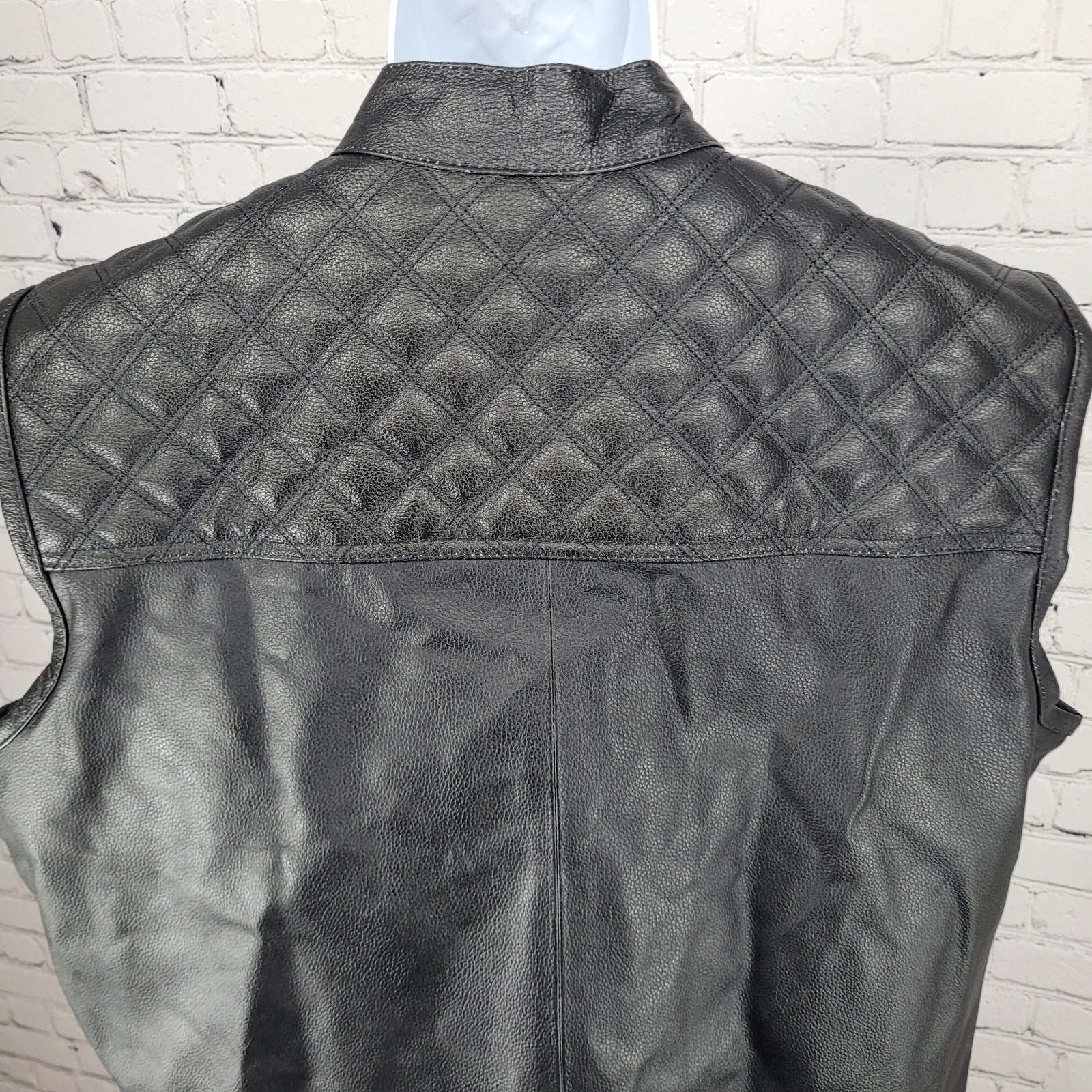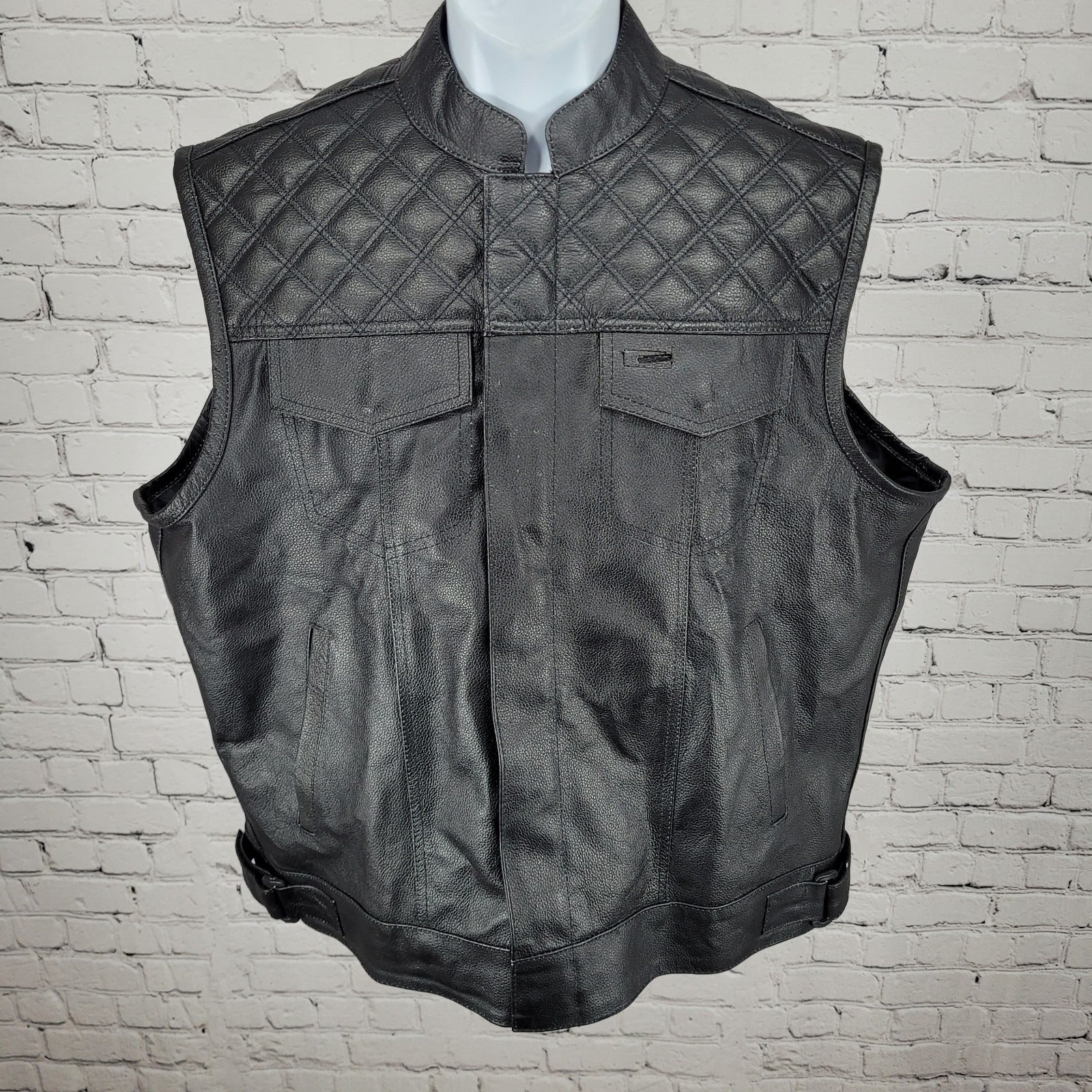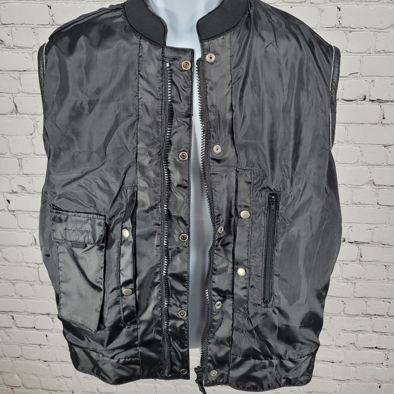 This black faux leather biker vest in size XL is designed for men who love motorcycles. Made with a regular fit and snap closure, it features multiple inner pockets for added convenience including a concealed carry pocket. The quilted accents and lined design make it both stylish and functional for motorcycle riding or casual wear. Perfect for those who embrace the biker culture and want a sleek and comfortable outerwear option.