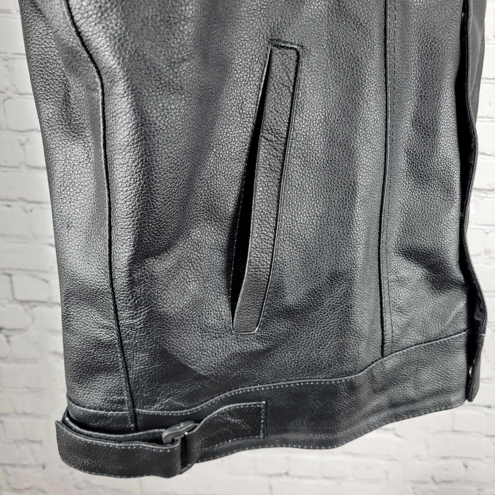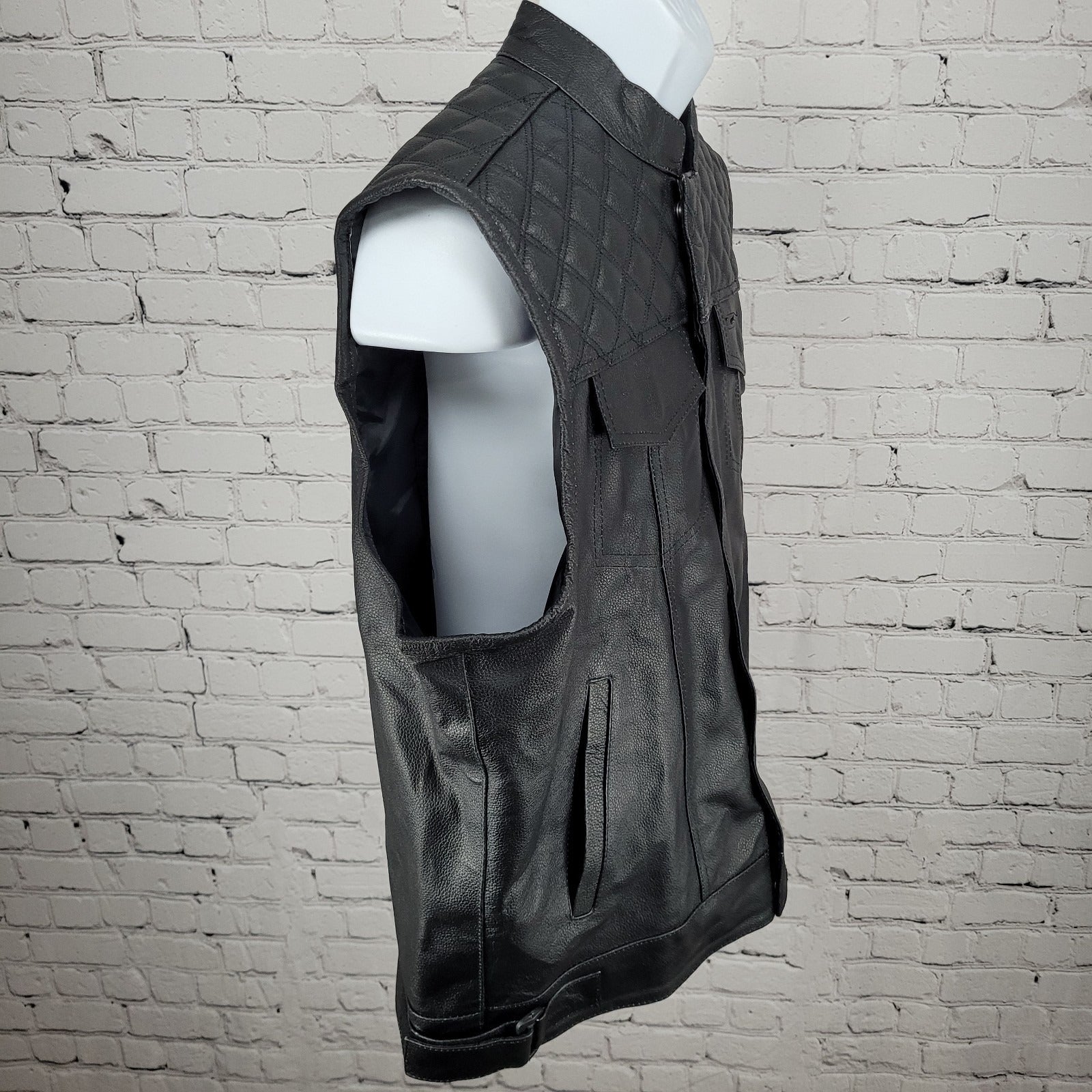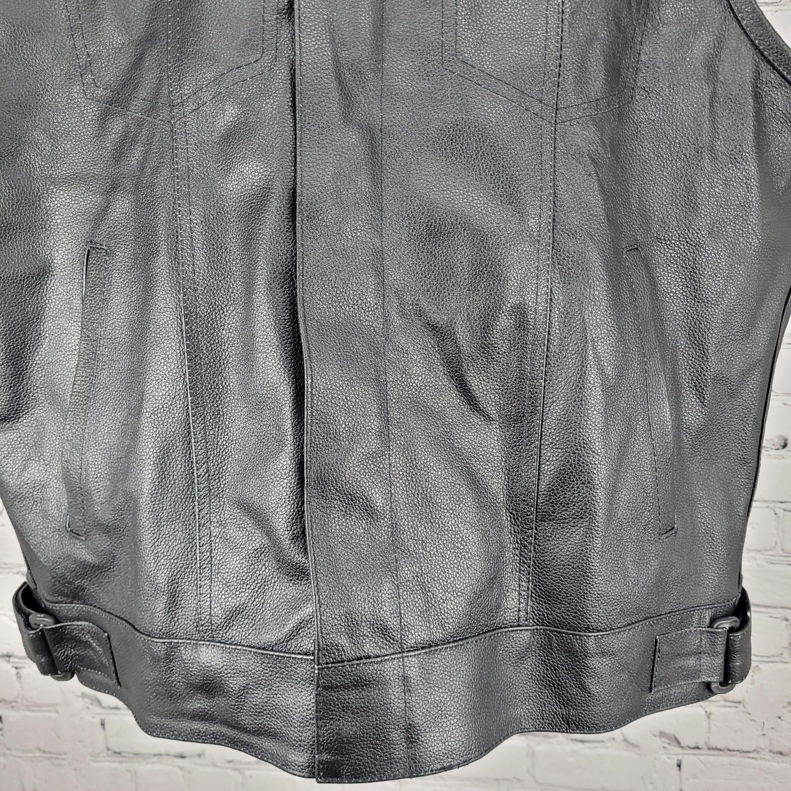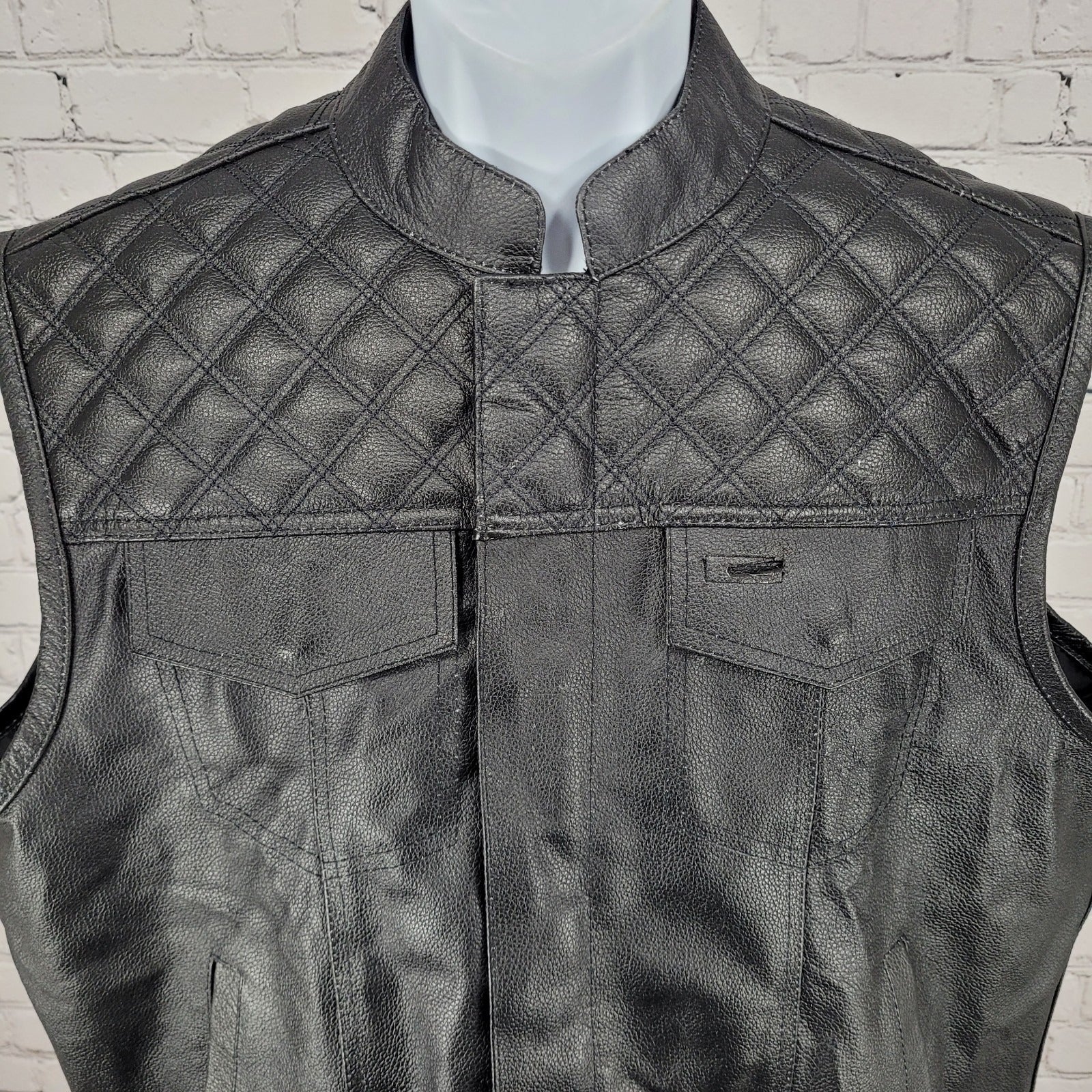 This black faux leather biker vest in size XL is designed for men who love motorcycles. Made with a regular fit and snap closure, it features multiple inner pockets for added convenience including a concealed carry pocket. The quilted accents and lined design make it both stylish and functional for motorcycle riding or casual wear. Perfect for those who embrace the biker culture and want a sleek and comfortable outerwear option.