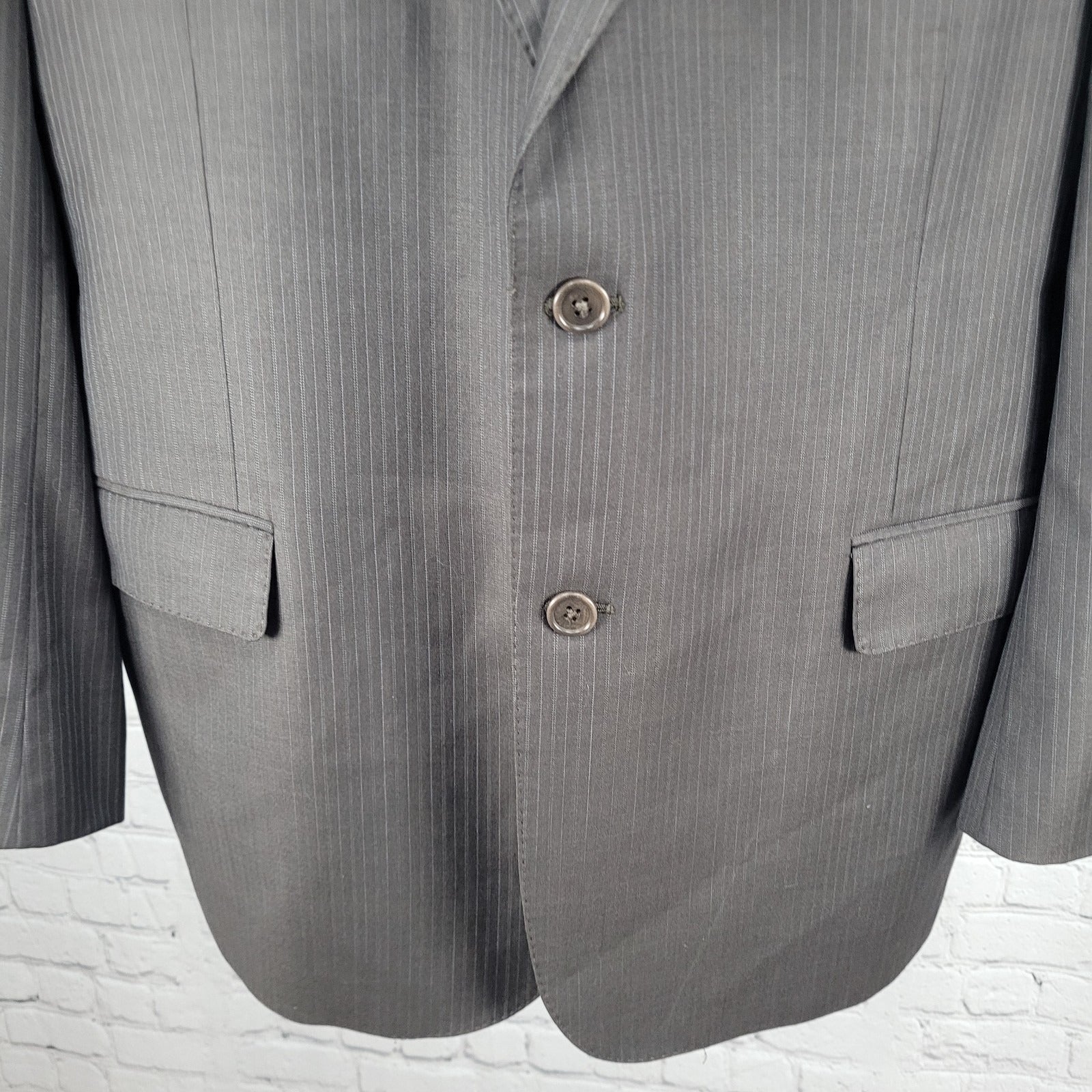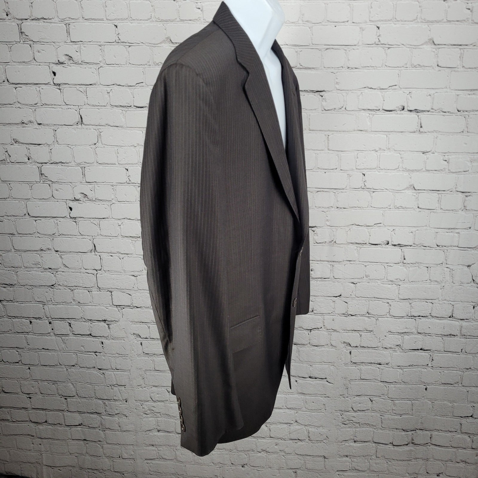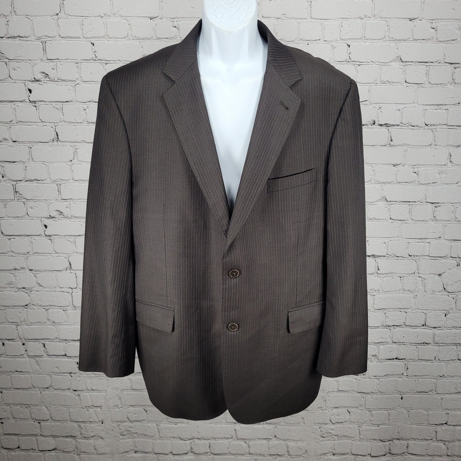 This Jos A Bank Brown 100% Wool Gordon Signature Gold Notch Blazer Sport Coat is a classic and versatile piece suitable for various occasions such as travel, weddings, parties, and business events. Made from high-quality wool, it features a stylish notch lapel and four-button sleeve closure. The regular length sport coat in size 46R also includes inner pockets and a single-breasted front closure. This timeless blazer in a rich brown color with a striped pattern adds a touch of sophistication to any formal or casual outfit.