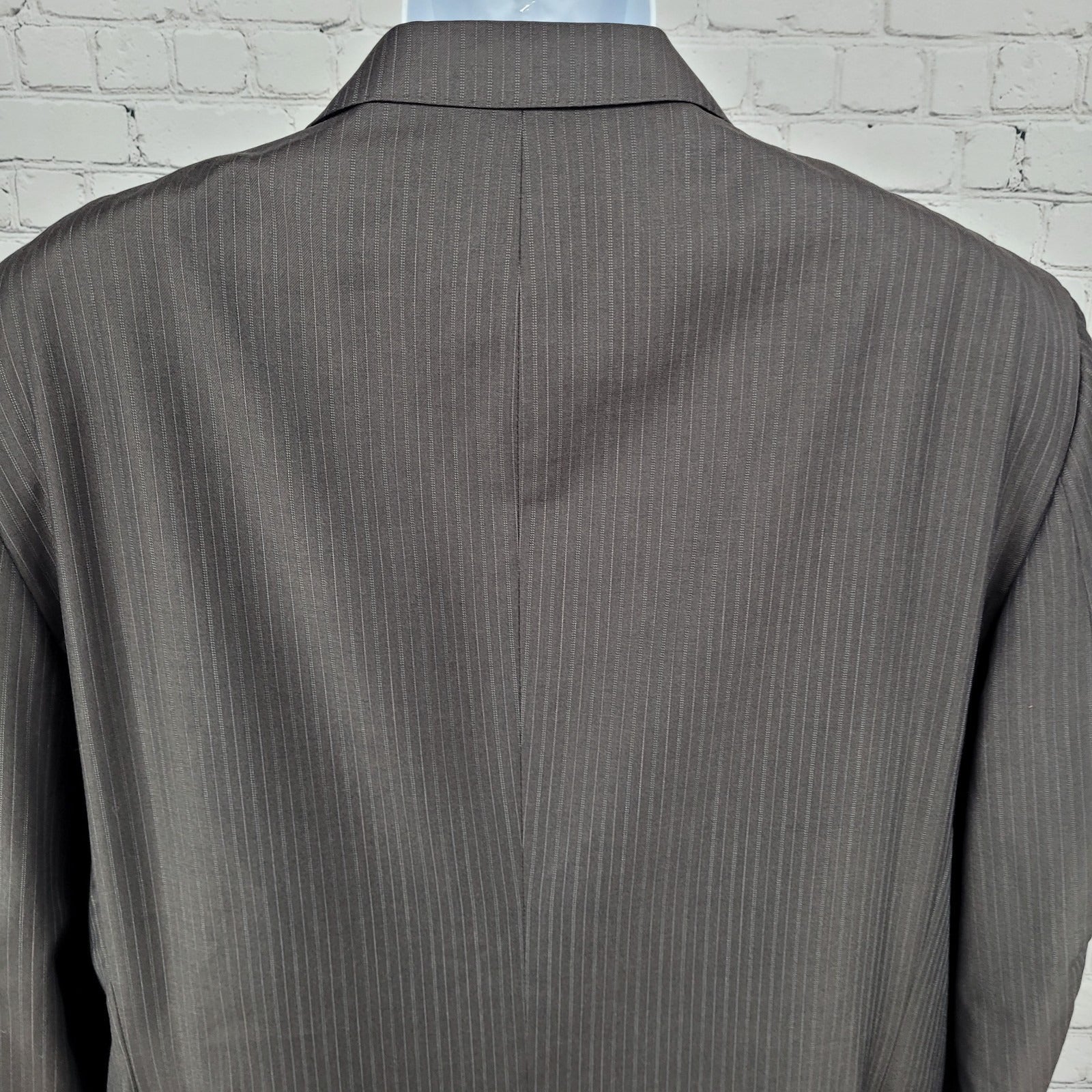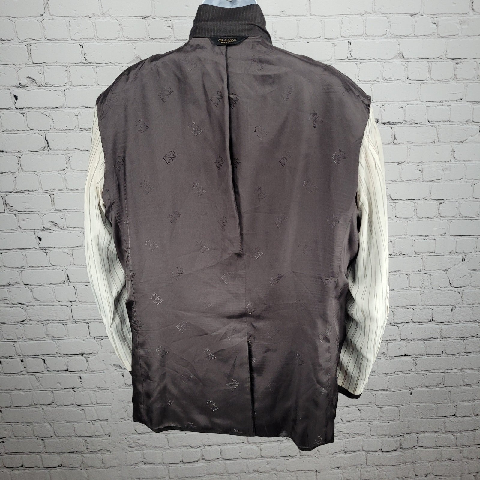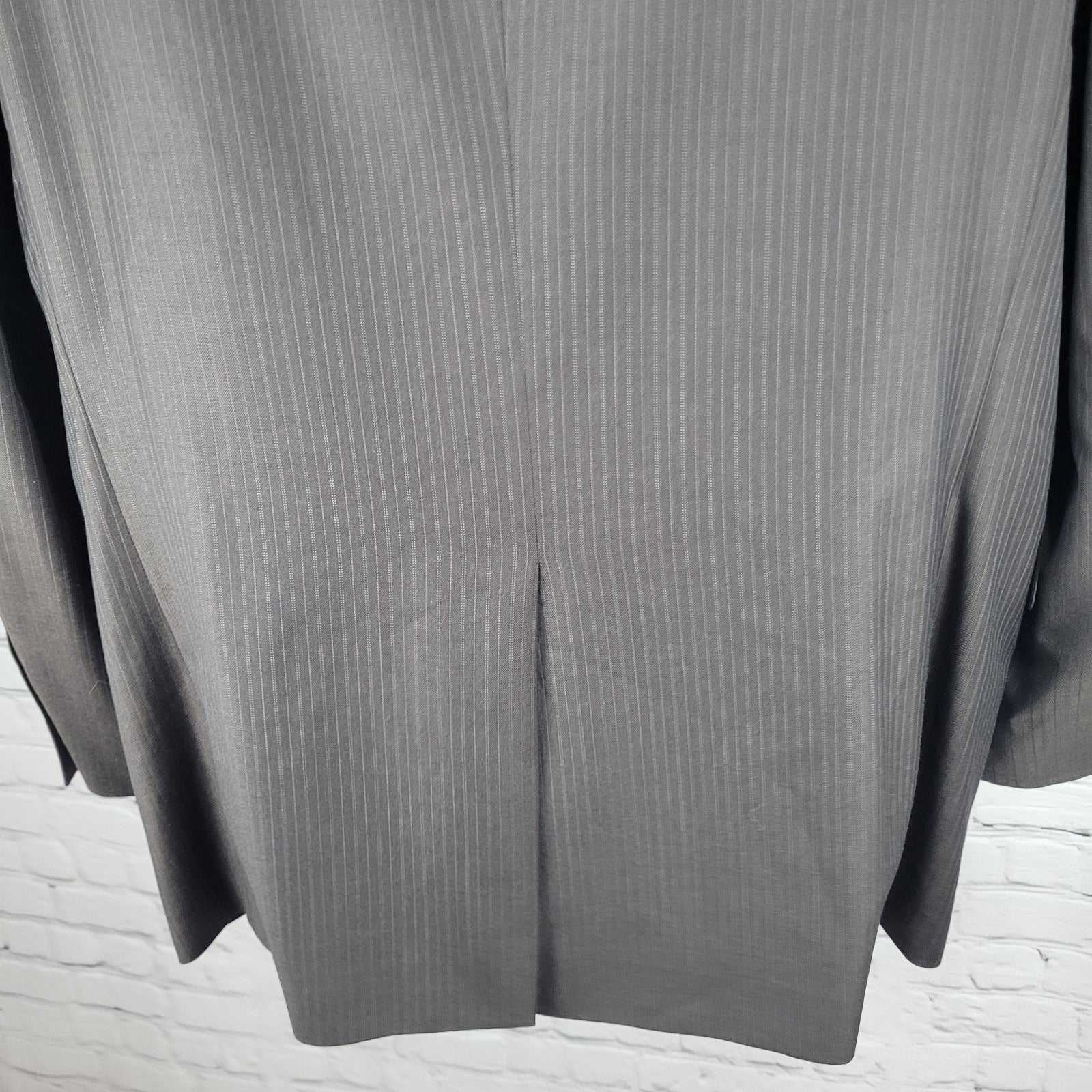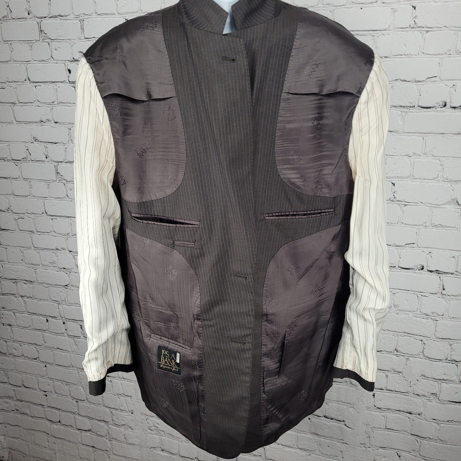This Jos A Bank Brown 100% Wool Gordon Signature Gold Notch Blazer Sport Coat is a classic and versatile piece suitable for various occasions such as travel, weddings, parties, and business events. Made from high-quality wool, it features a stylish notch lapel and four-button sleeve closure. The regular length sport coat in size 46R also includes inner pockets and a single-breasted front closure. This timeless blazer in a rich brown color with a striped pattern adds a touch of sophistication to any formal or casual outfit.