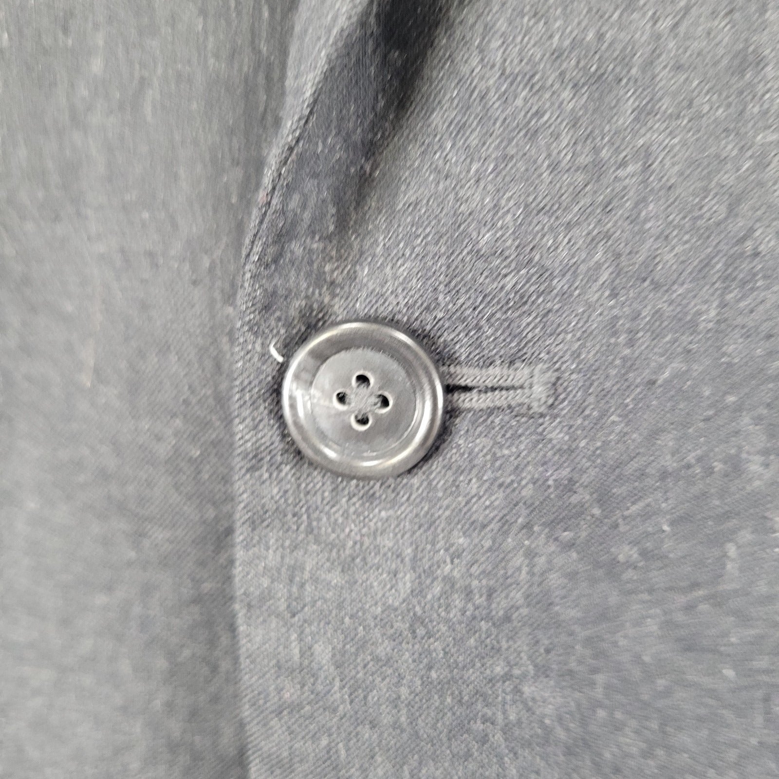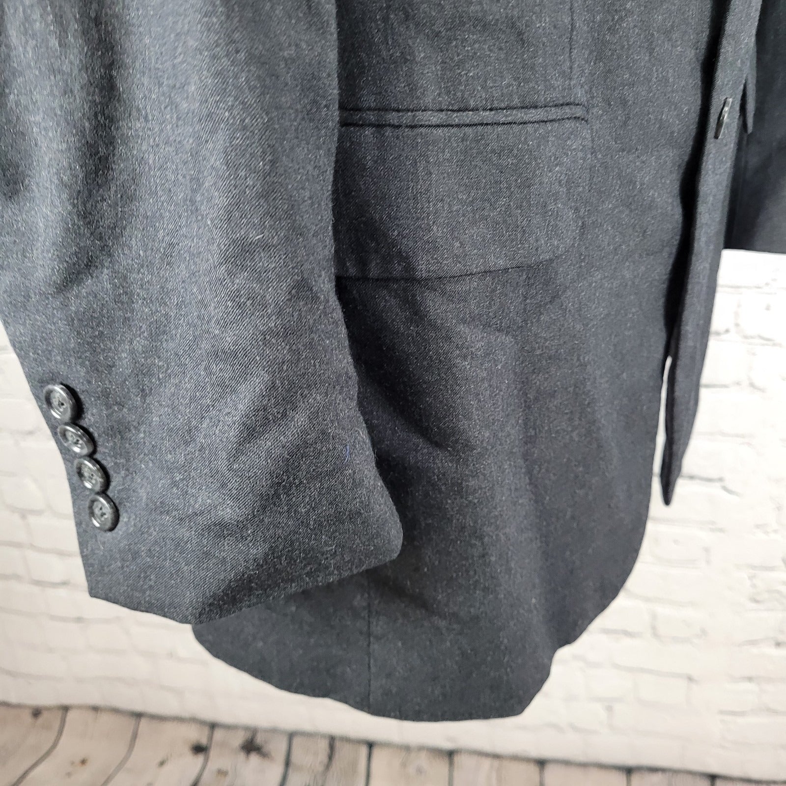 The Jos A Bank Grey Wool Cashmere 2 Button Vented Notch Blazer Sport Coat in size 43L is a sophisticated and classic addition to any man's wardrobe. Made from a luxurious blend of cashmere and wool, this long sport coat features a four-button sleeve, single-breasted front, and single vented back for a stylish and tailored look. The grey color and solid pattern make it versatile for formal occasions, business meetings, or even a night out for drinks. With its timeless design and high-quality material, this blazer is sure to impress.