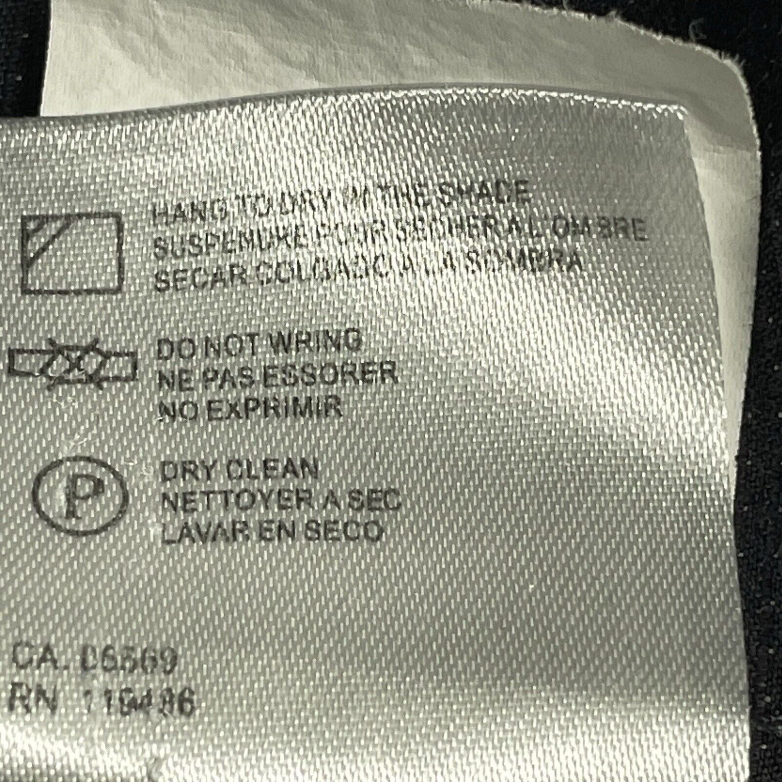 Missing collar buttons. Stain on right cuff and discoloration right arm elbow, as pictured.