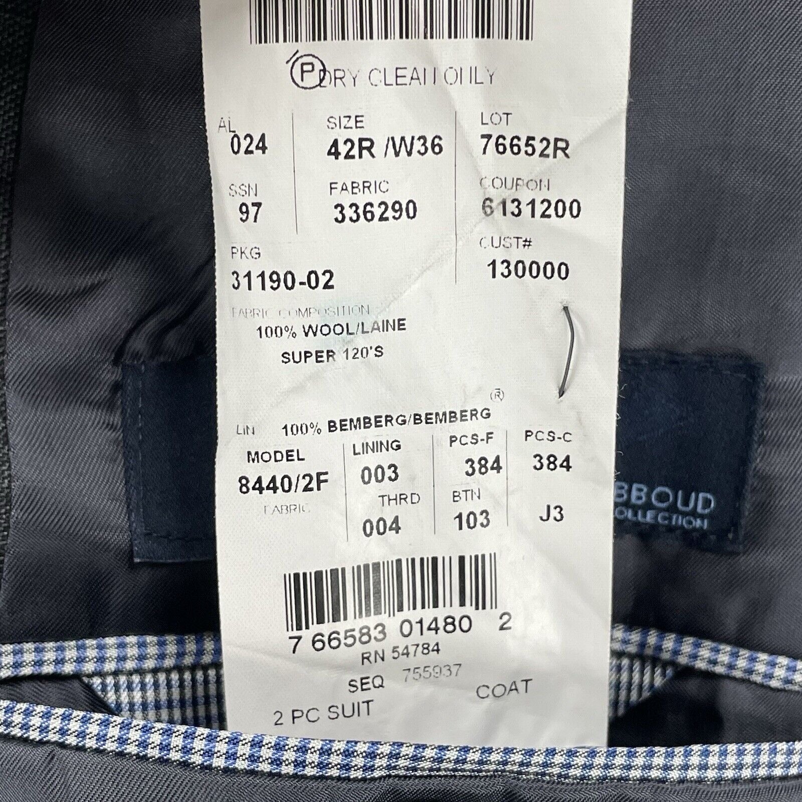 This is a classic Joseph Abboud grey wool suit blazer jacket made in the USA, featuring a check pattern and a regular fit. The jacket is designed with a notch lapel style, a four-button sleeve, and a two-button front button style. It has a double-vented back and inner pockets, making it suitable for various occasions such as travel, parties, business meetings, and casual wear. The size is 42R with a chest size of 44, perfect for the fall, winter, and spring seasons. The lining material is Bemberg, adding to the quality of the blazer.