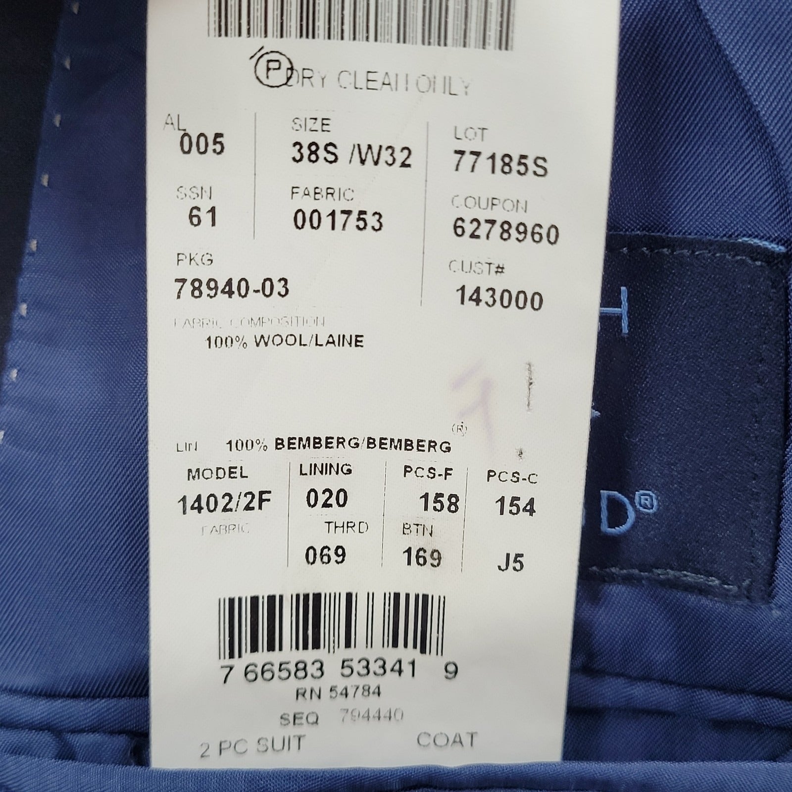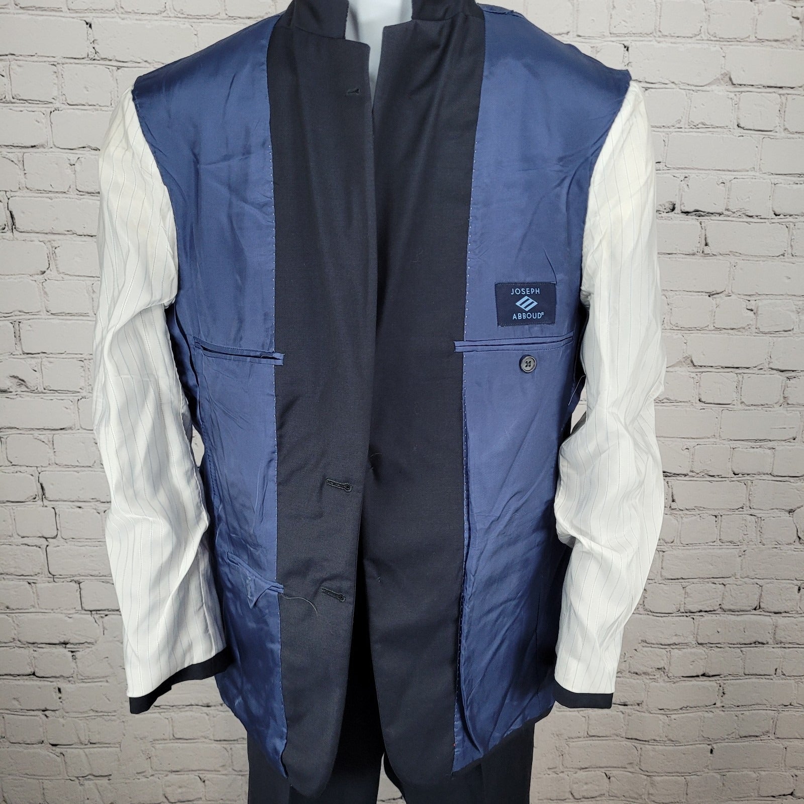 The product is a Joseph Abboud navy blue 100% wool full suit set, consisting of a two-piece blazer and pants. This suit is designed for men and features a classic style, perfect for a formal or professional setting. The high-quality wool material and American theme make it a sophisticated and patriotic choice for any occasion. The size of 38S/W32 (32x29) ensures a tailored fit for a polished and put-together look.