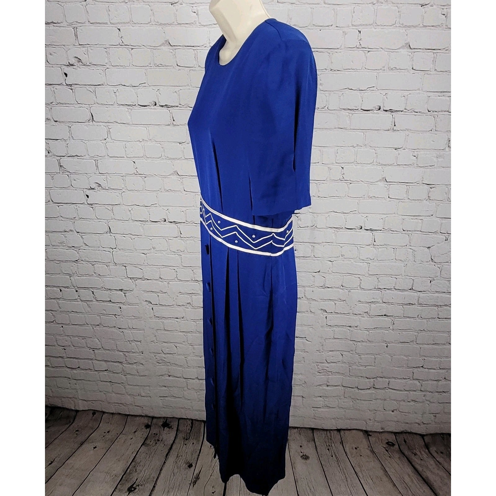 Julian Taylor Blue Beaded Pleated Short Sleeve Buttoned Long Sheath Dress USA 12