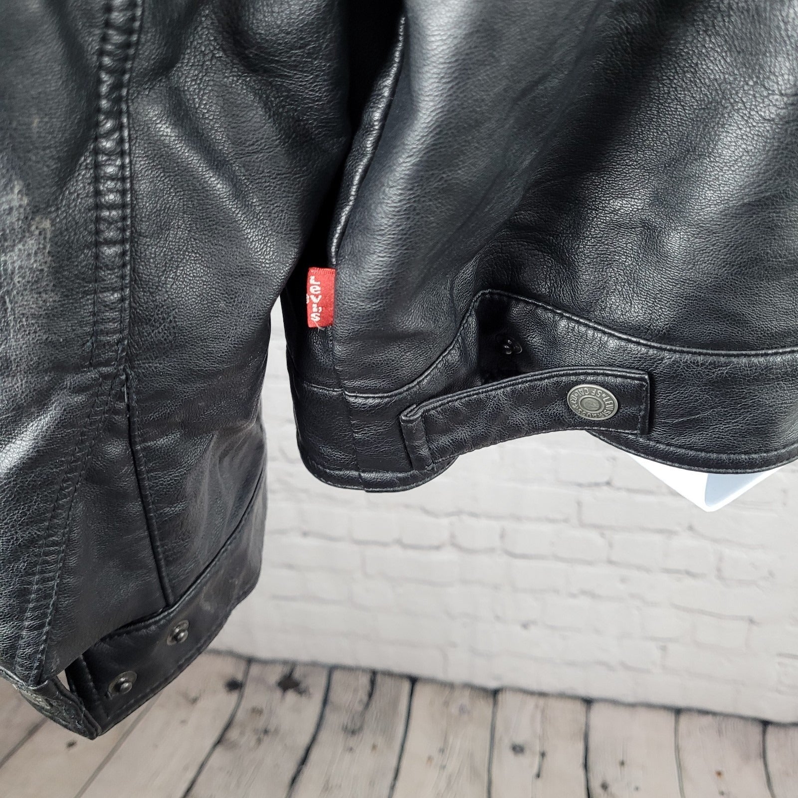 This Levi Strauss Black Faux Leather Motorcycle Jacket in size XXL is a stylish and versatile addition to any man's wardrobe. With a short length, solid black color, and classic biker theme, this jacket is perfect for casual wear, workwear, or for a party or travel. The full zip and snap closure, along with multiple pockets and a lined interior, make it both practical and comfortable. Made from durable faux leather with a polyester lining, this jacket is machine washable for easy care and maintenance.