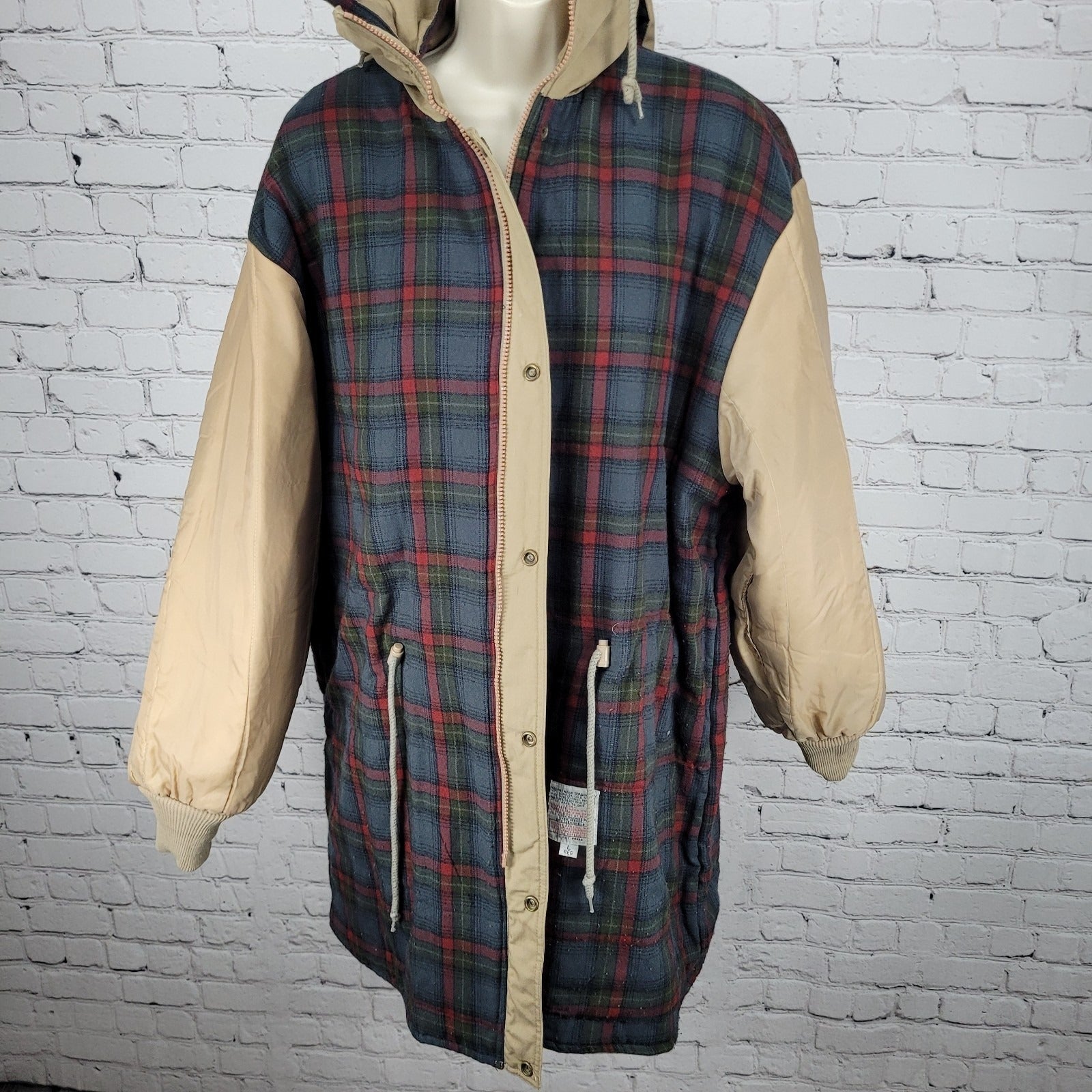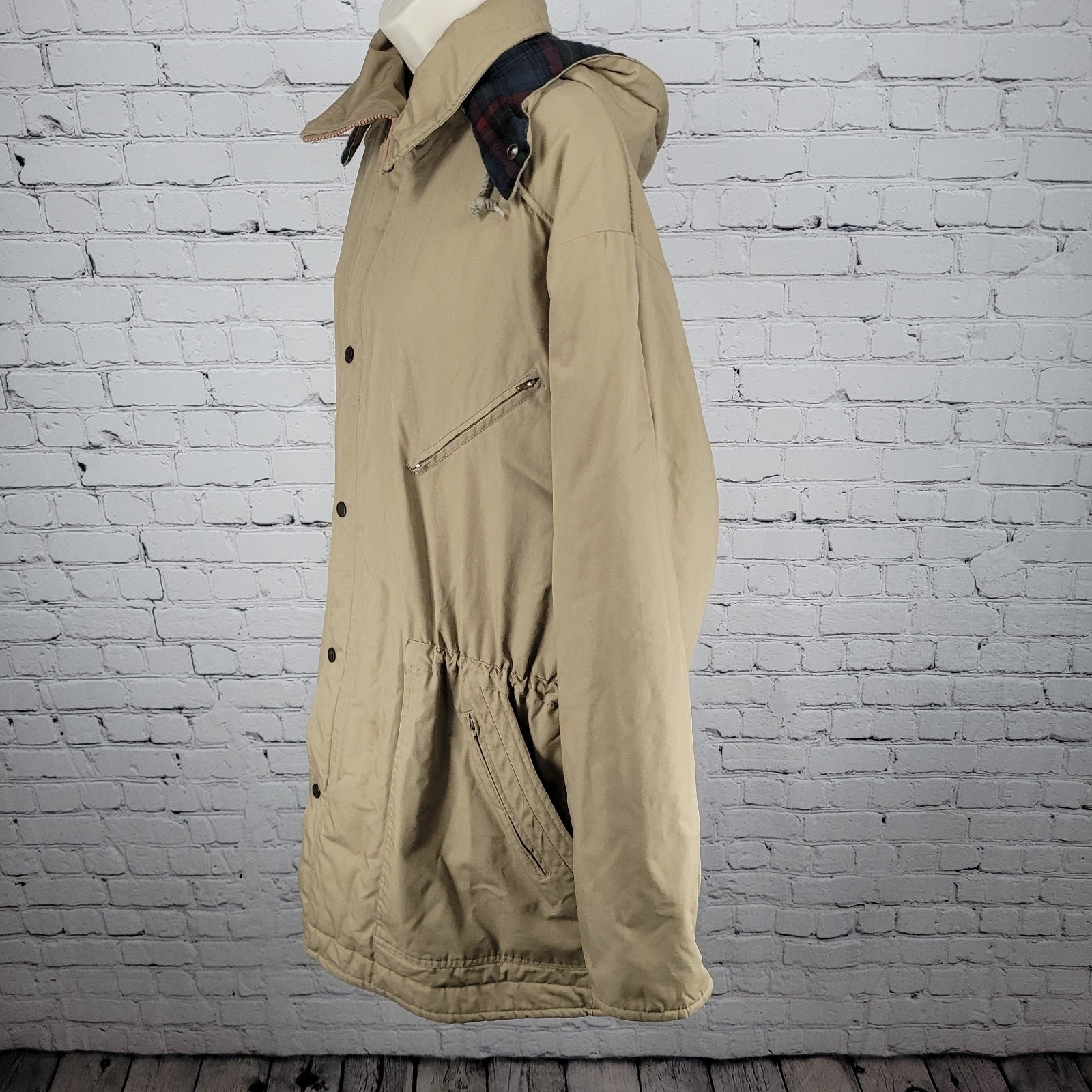 London Fog Towne Tan Removable Hood Plaid Lined Full Zip Coat Size Large L
