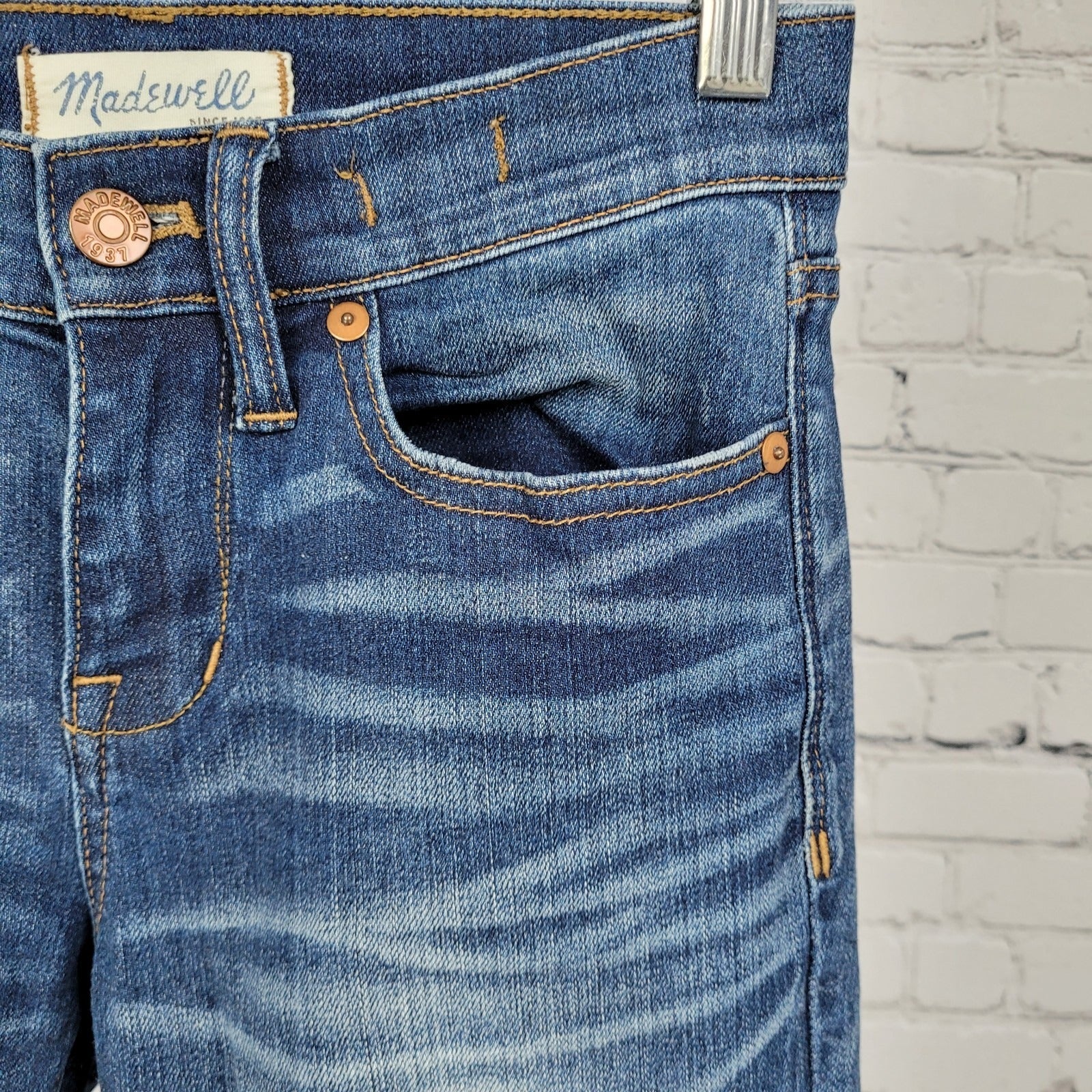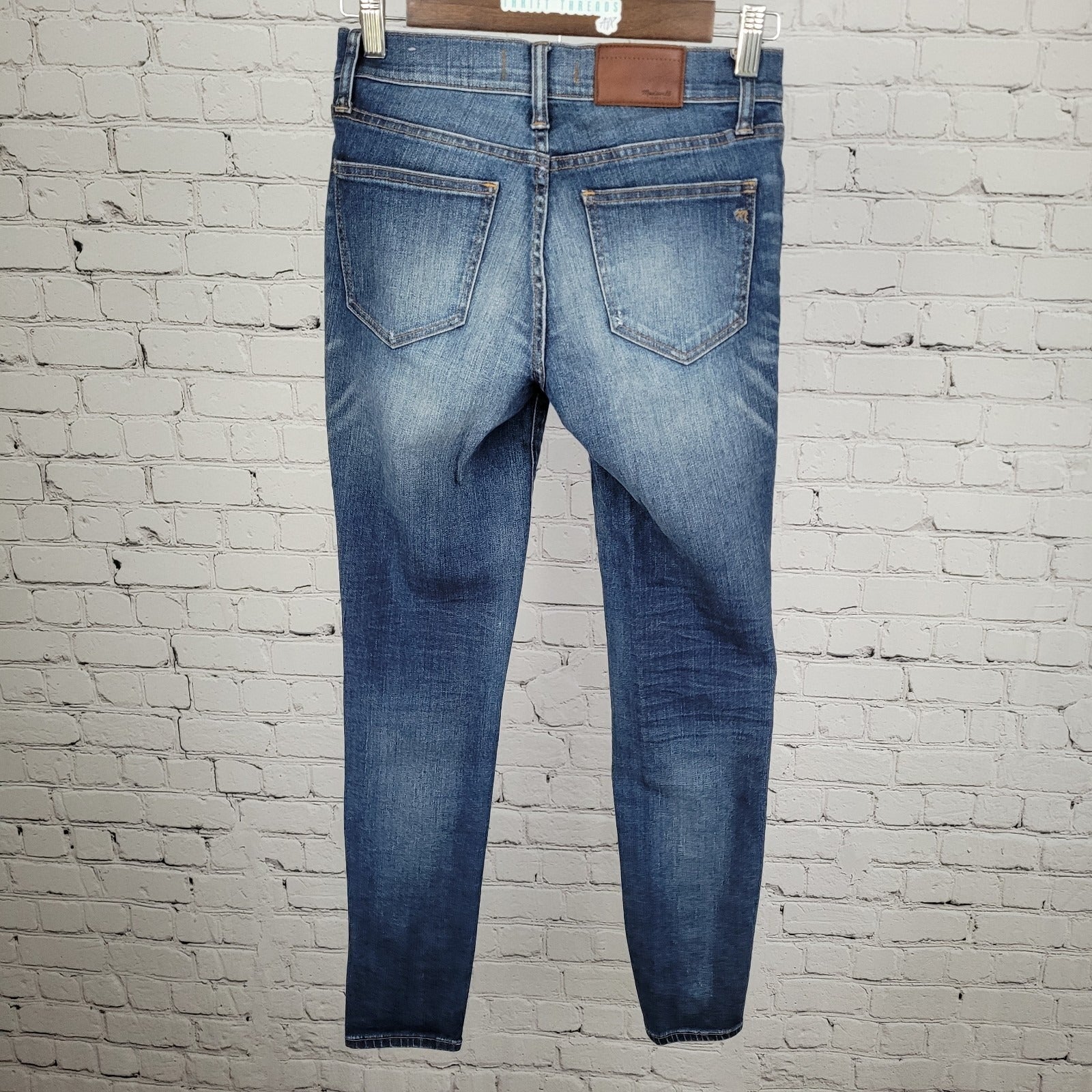 The Madewell Blue Skinny Skinny Distressed Low Rise Stretch Jeans in size 26 are a stylish and versatile addition to any woman's wardrobe. Made from a comfortable cotton-spandex blend with a medium wash, these jeans feature a slim fit and a low rise. The distressed detailing adds a trendy touch, while the stretch fabric ensures a comfortable and flattering silhouette. With a classic 5-pocket design and a length of 28 inches, these jeans are perfect for both casual and dressier occasions in the seasons of summer, fall, and spring. Easy to care for with machine washable instructions.