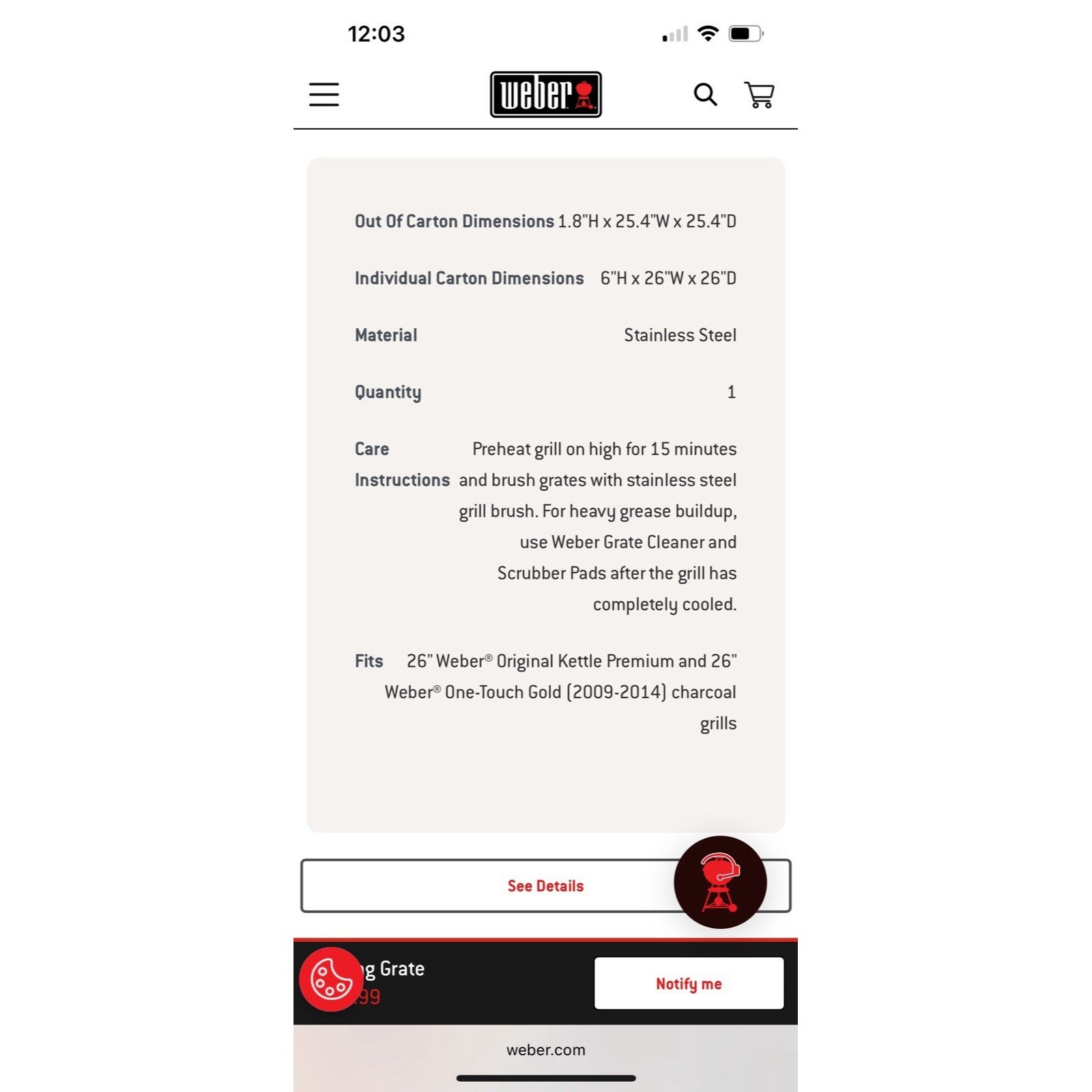 NIB Weber 26” Hinged Replacement Charcoal Grill Cooking Grate