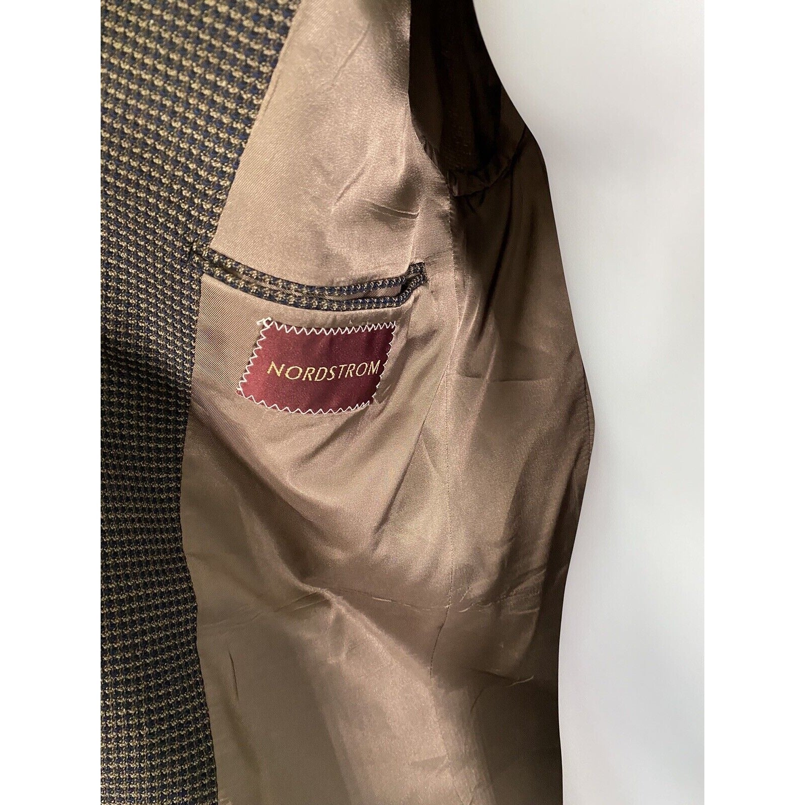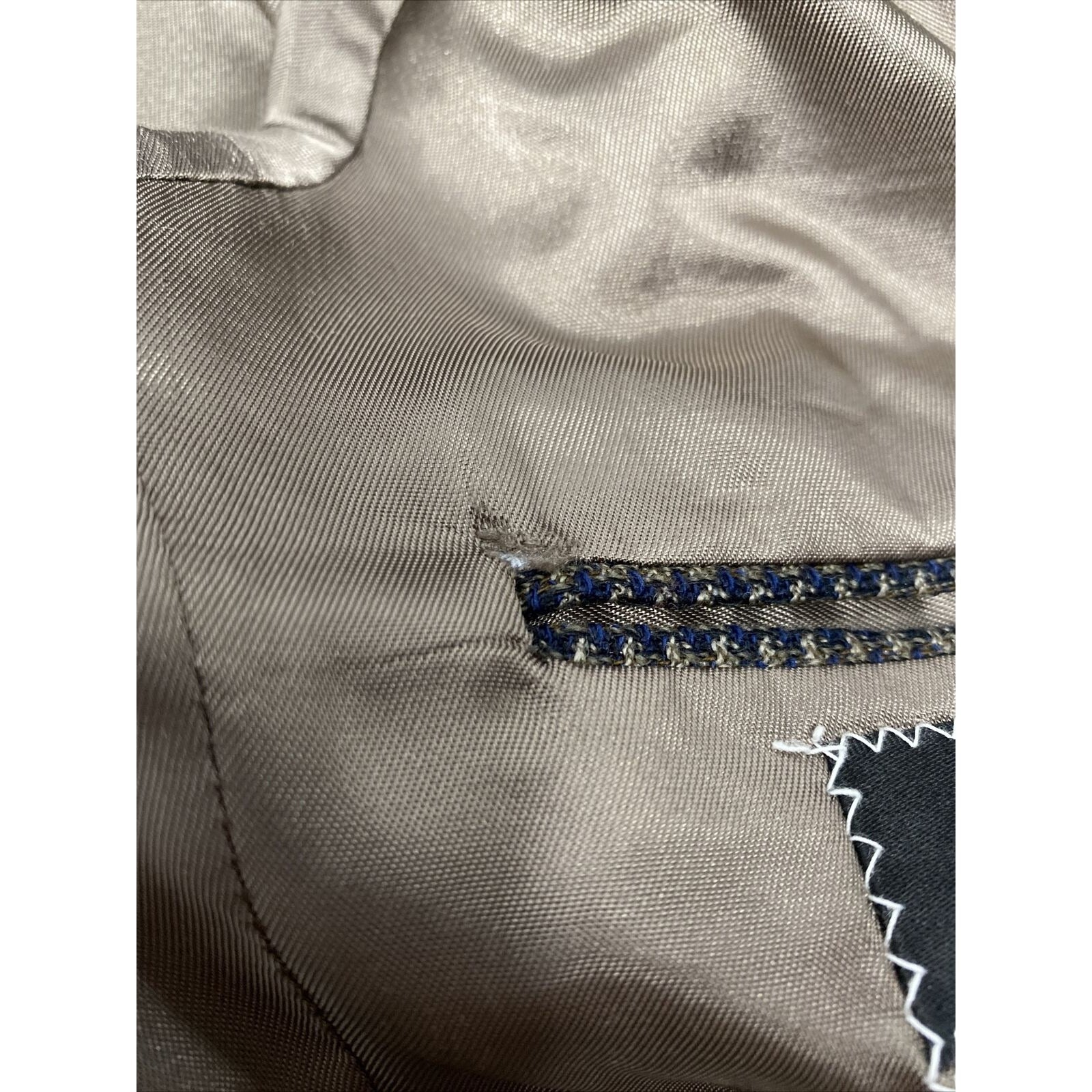 Small tear in corner of left inner breast pocket. See photos for reference.