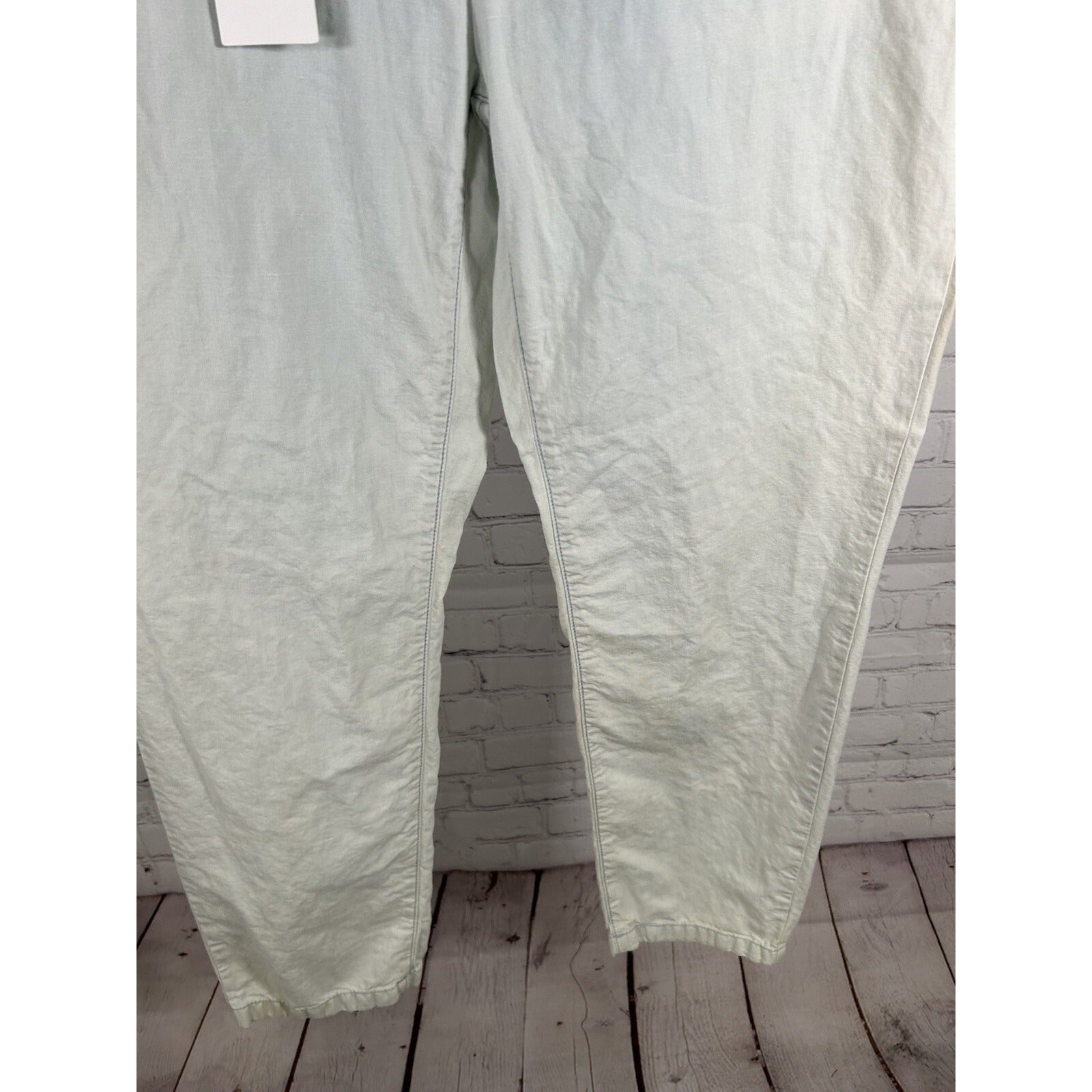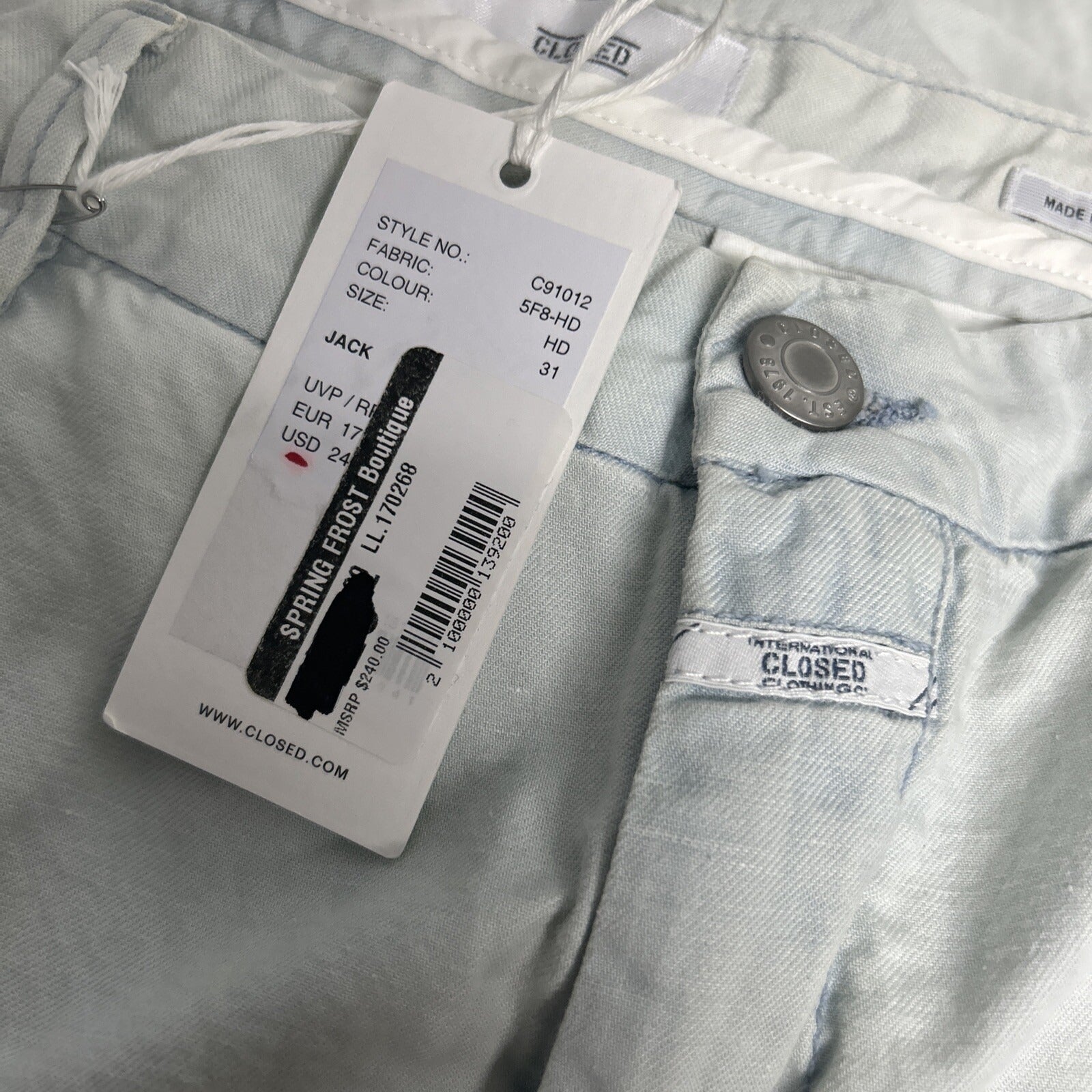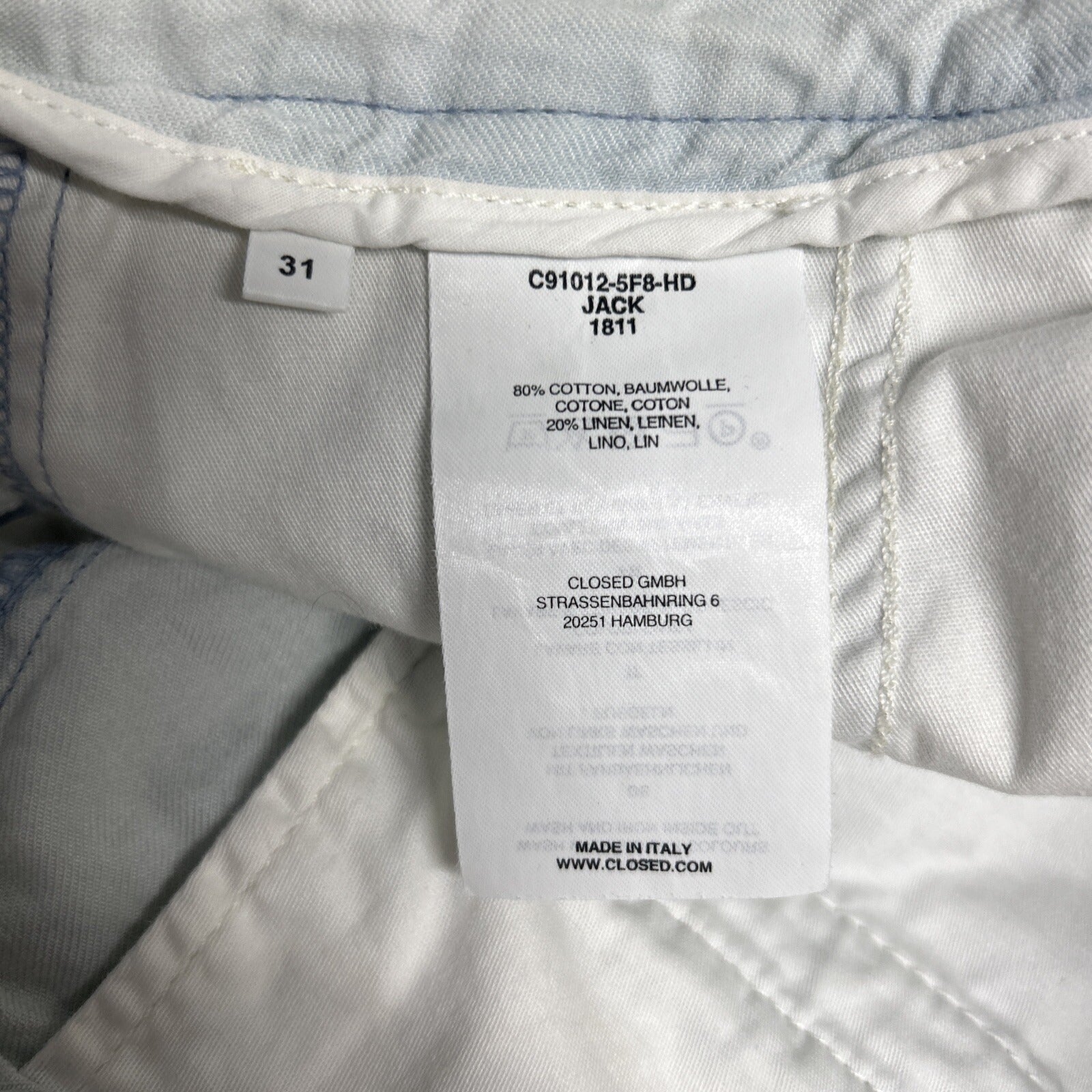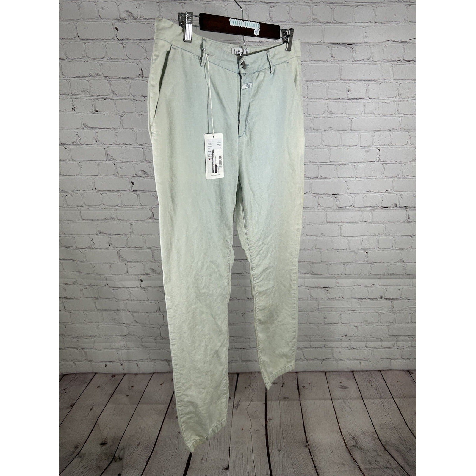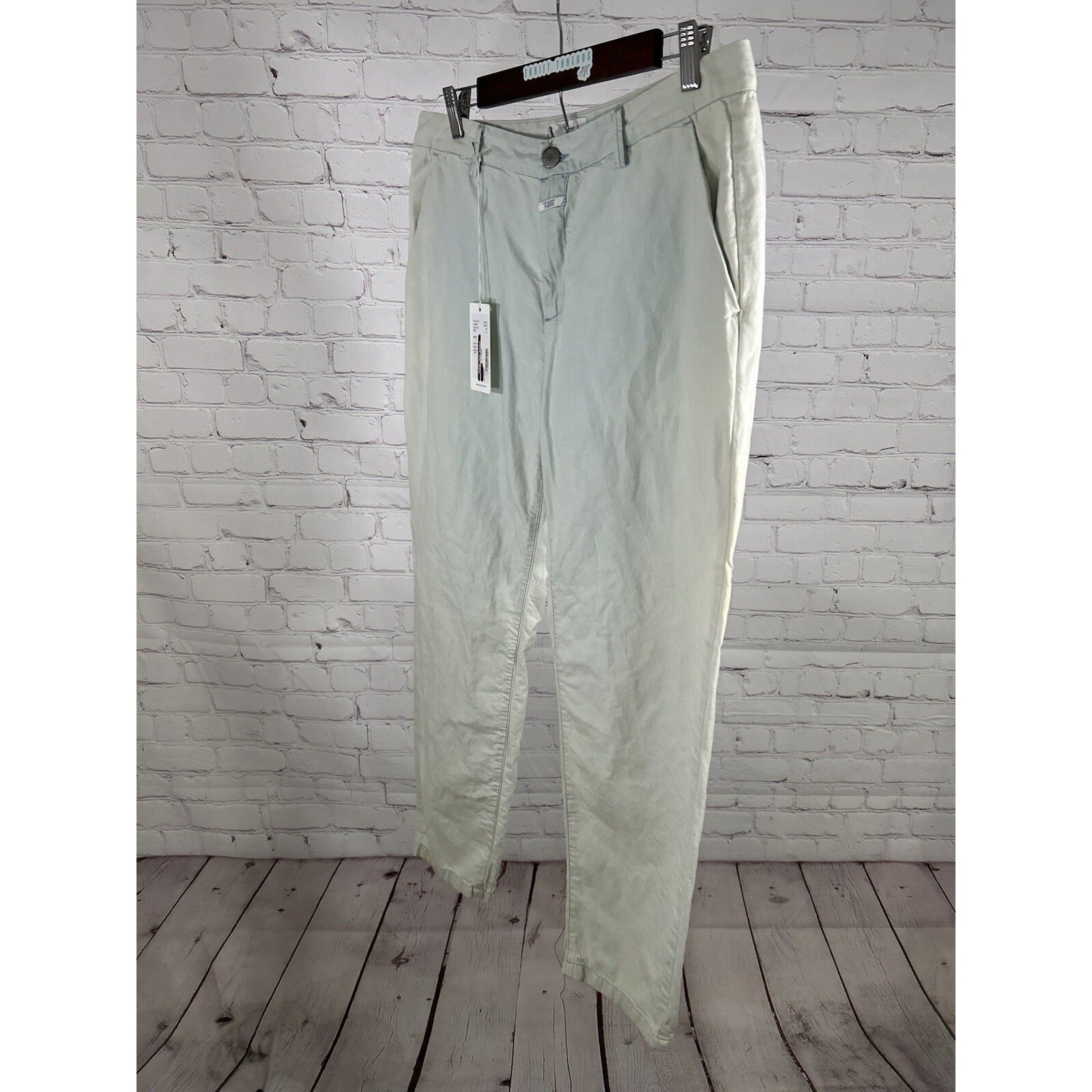 Elevate your denim collection with these stylish NWT CLOSED Jack Cotton Linen Blend Jeans. The blue and white solid pattern features a dirty wash for a trendy and effortless look. The mid-rise waist with a zip and button closure provides a comfortable fit.