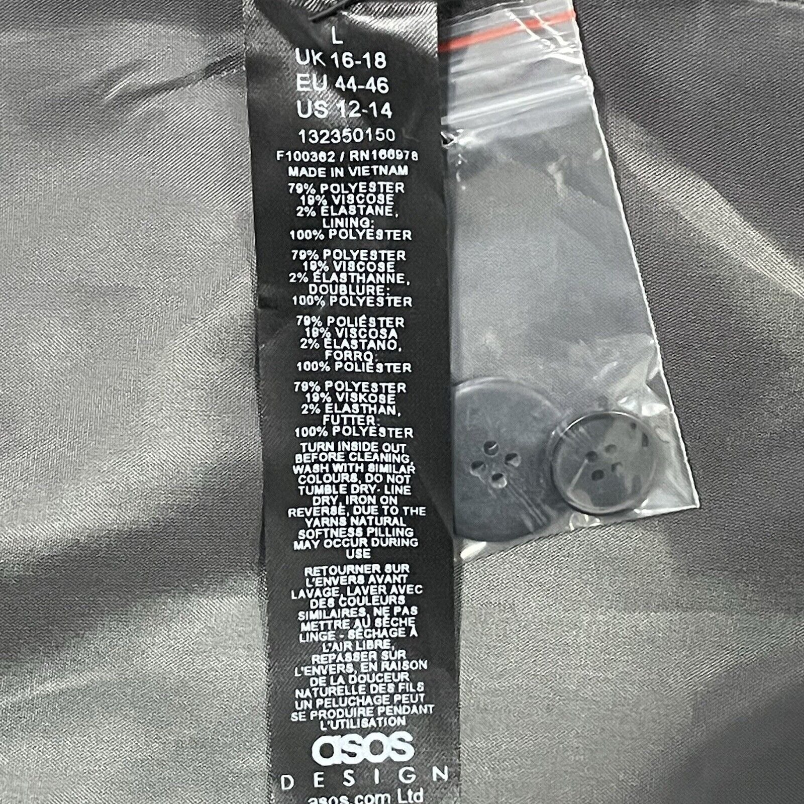 The NWT ASOS Design Grey Lightweight Easy Care Sports Coat Blazer in size Large L is a versatile and stylish 2-piece suit for men. Perfect for various occasions such as travel, weddings, parties, or business events, this blazer features a classic notch lapel style and a single-breasted, two-button front. The blazer is made of a polyester, spandex, and viscose blend with inner pockets and a single vented back for comfort and functionality. It has a regular fit and is suitable for the seasons of summer, fall, and spring, making it a practical and fashionable choice for any wardrobe.