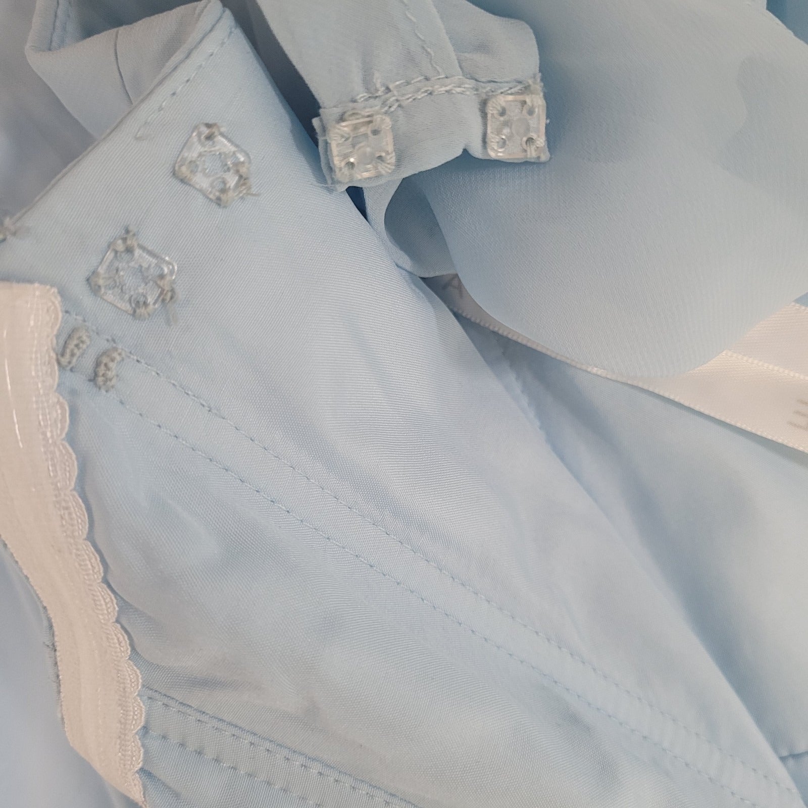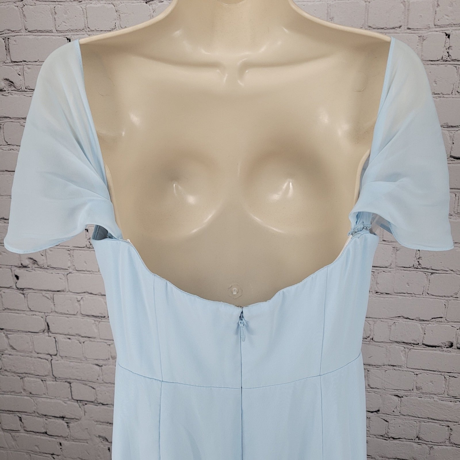 The NWT Azazie Sky Blue Empire Waist Chiffon Side Slit Bridesmaid Dress is a stunning and elegant option for weddings or formal events. This long A-Line dress features a sweetheart neckline, short removable flutter sleeves, and a chiffon fabric that adds a touch of sophistication. The custom size M dress is perfect for those looking for a solid blue color with a side slit detail, making it a versatile and classic choice for any season. The dress is made from polyester and requires dry cleaning for care, ensuring easy maintenance for the special occasion.