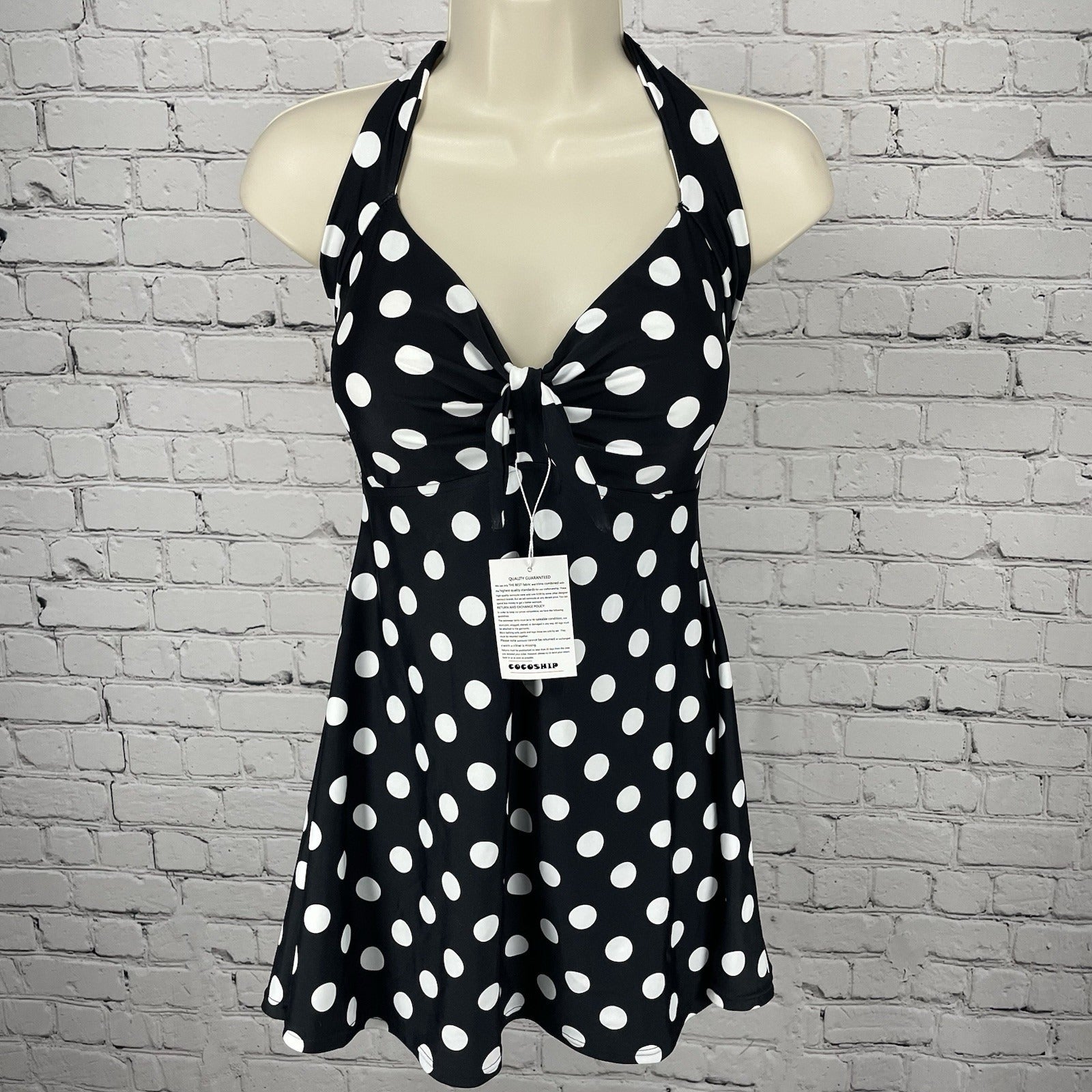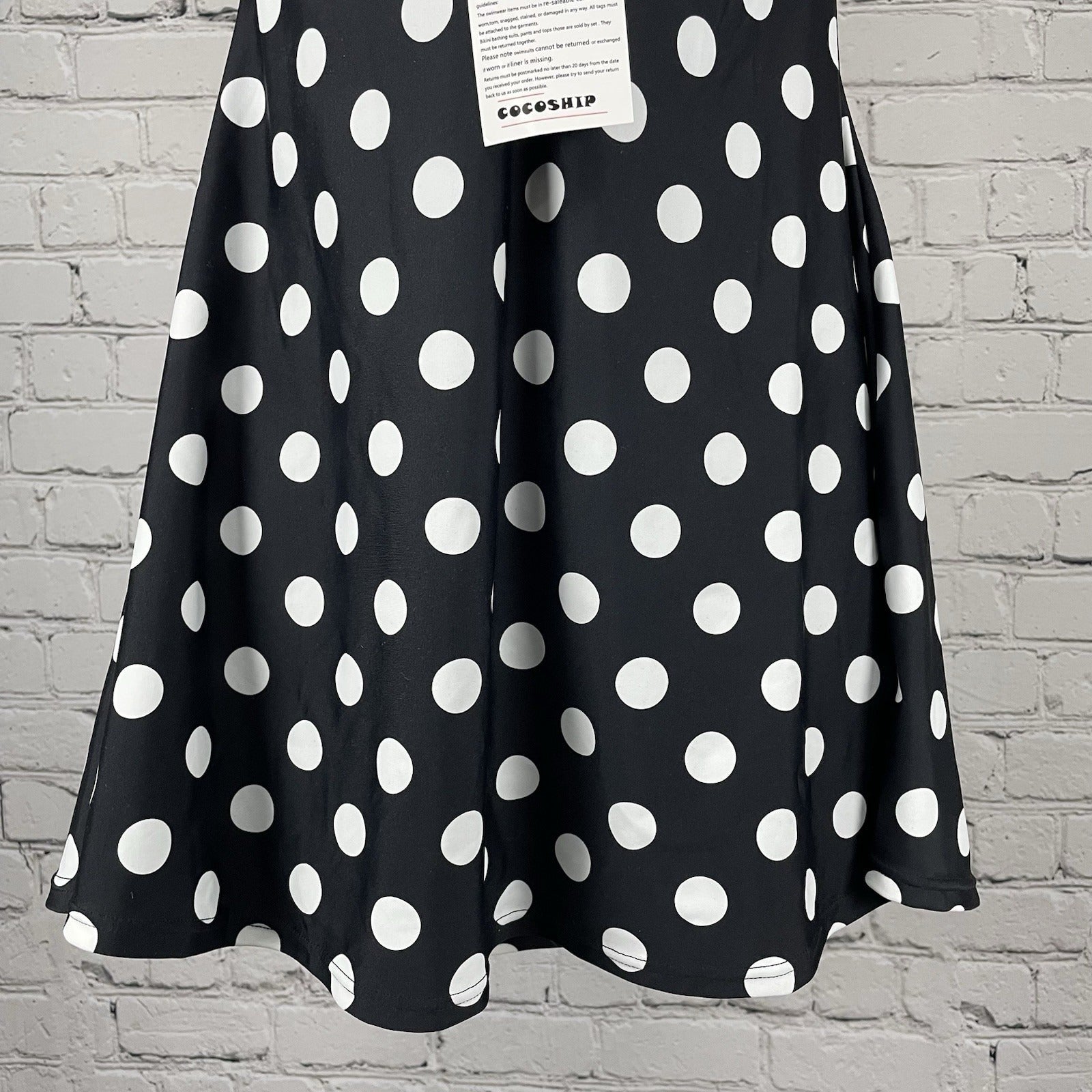 Step into vintage-inspired charm with the Cocoship Black & White Retro Padded Halter One Piece Swimsuit. A timeless polka dot pattern sets the stage for a classic beach day aesthetic, while the halter neck and swim shorts combo offers a flattering fit for a size 10 silhouette.