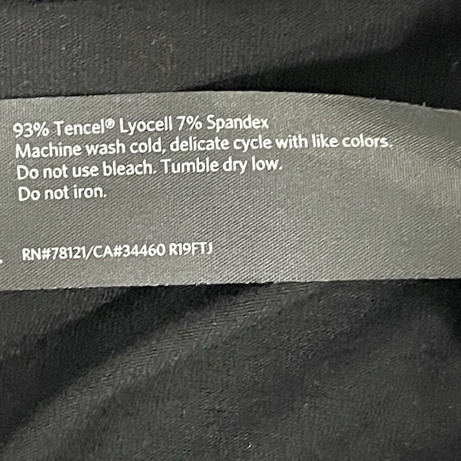 This is a new with tags (NWT) Eileen Fisher black midi dress made in the USA from fine Tencel jersey fabric. The dress is designed in a shirt dress style with a solid pattern, short sleeves, and a round neckline. It features a pullover closure, is machine washable, and comes in a size large (L). The dress is lightweight with stretch properties, making it suitable for travel and casual occasions in the summer, fall, and spring seasons. The classic and designer-themed dress is a versatile wardrobe piece for women who appreciate high-quality, sustainable fashion.