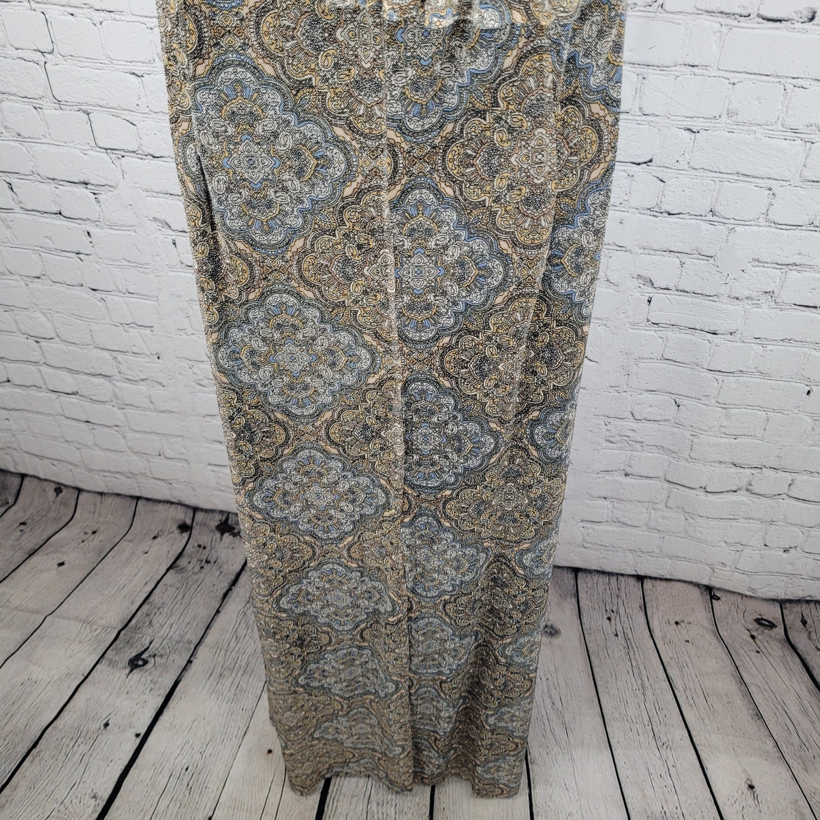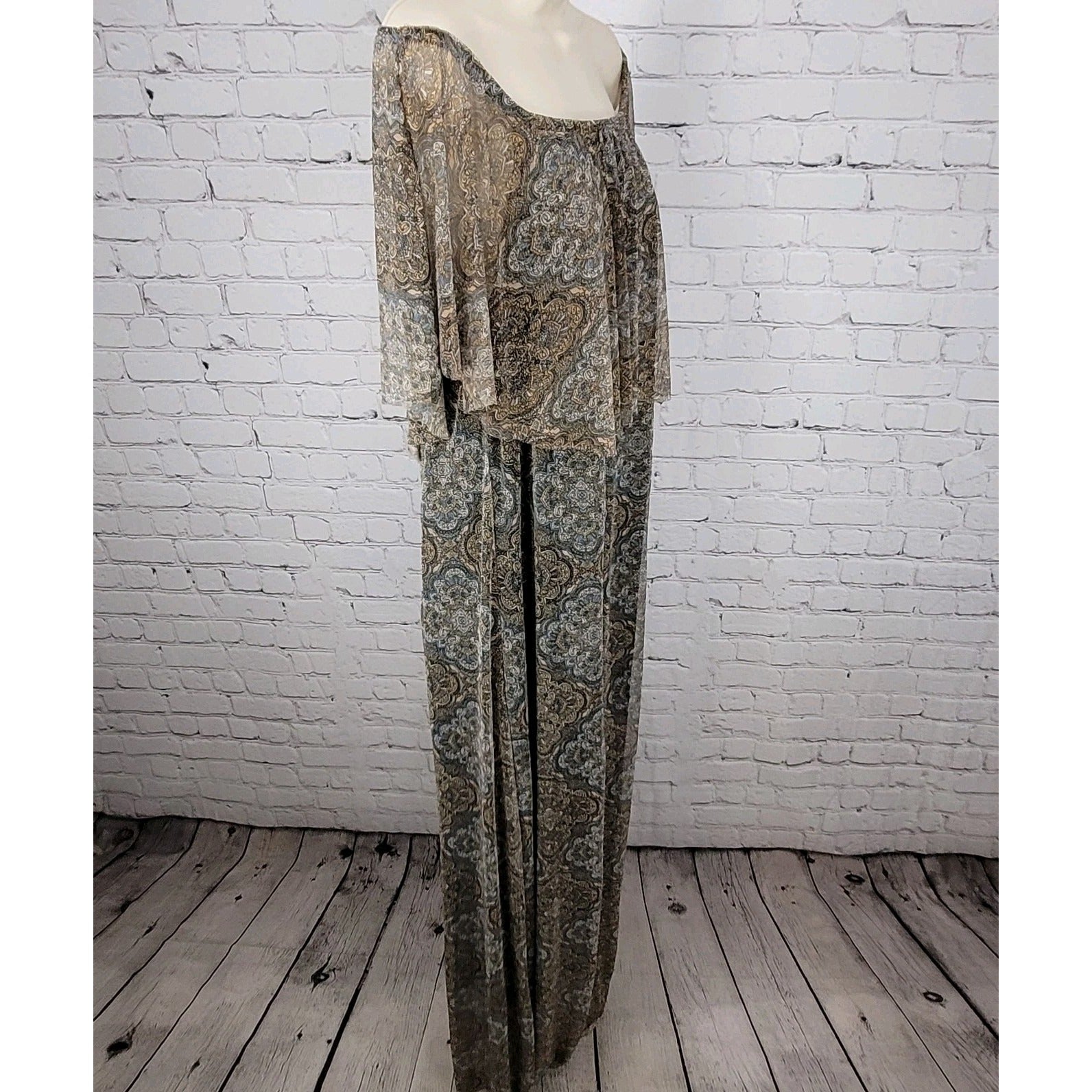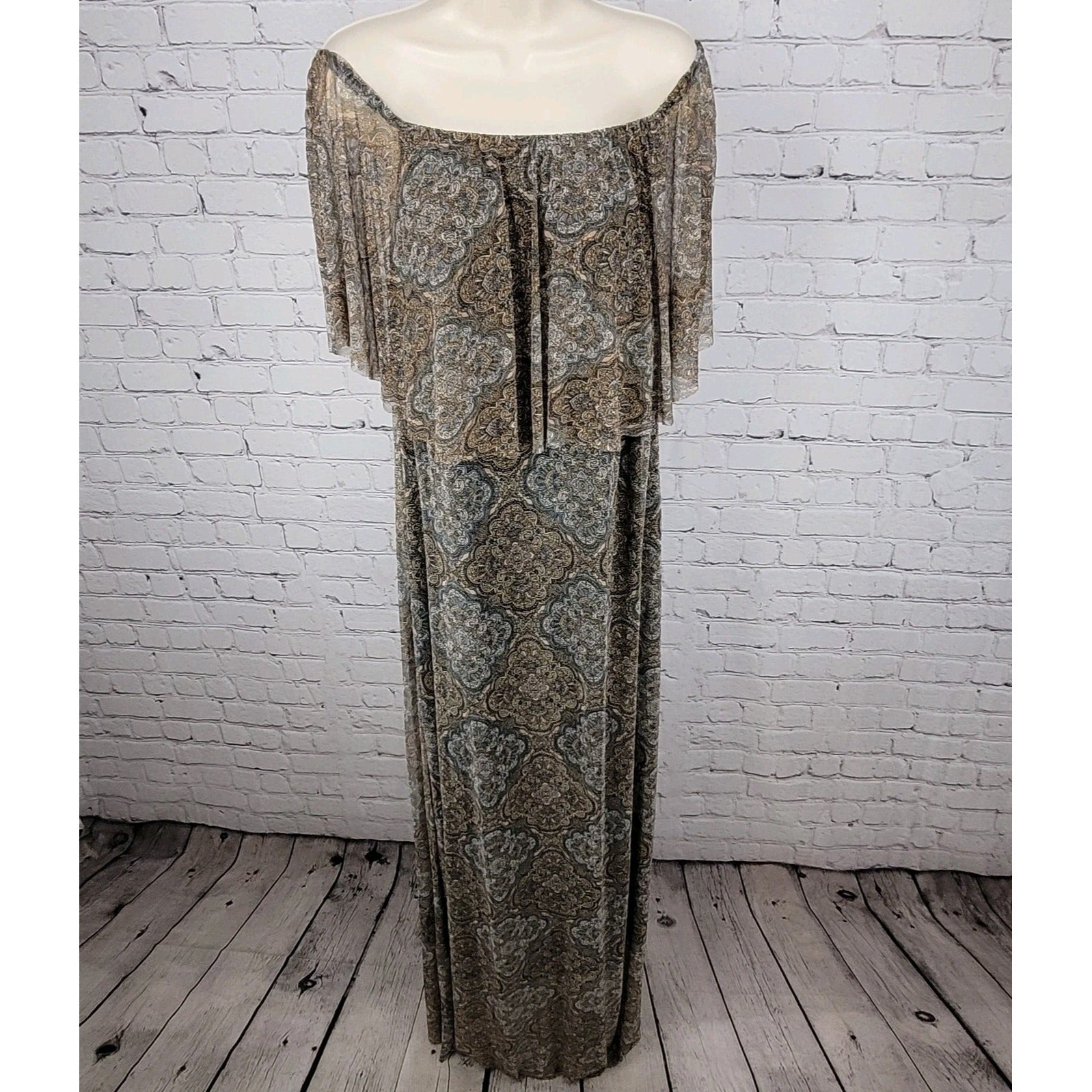 NWT Ellen Weaver Tan & Blue Print Off Shoulder Stretch Lined Maxi Dress Size 3X
