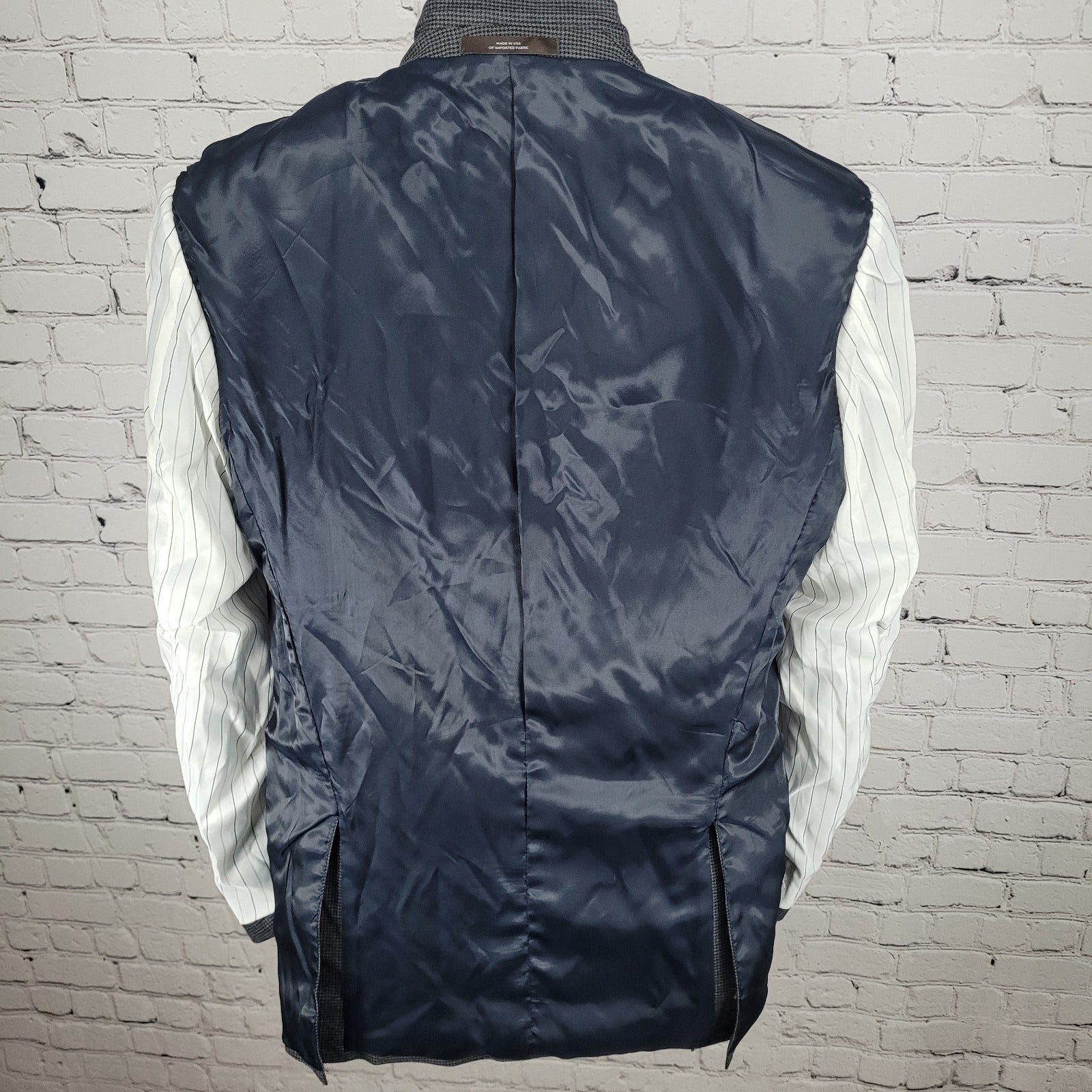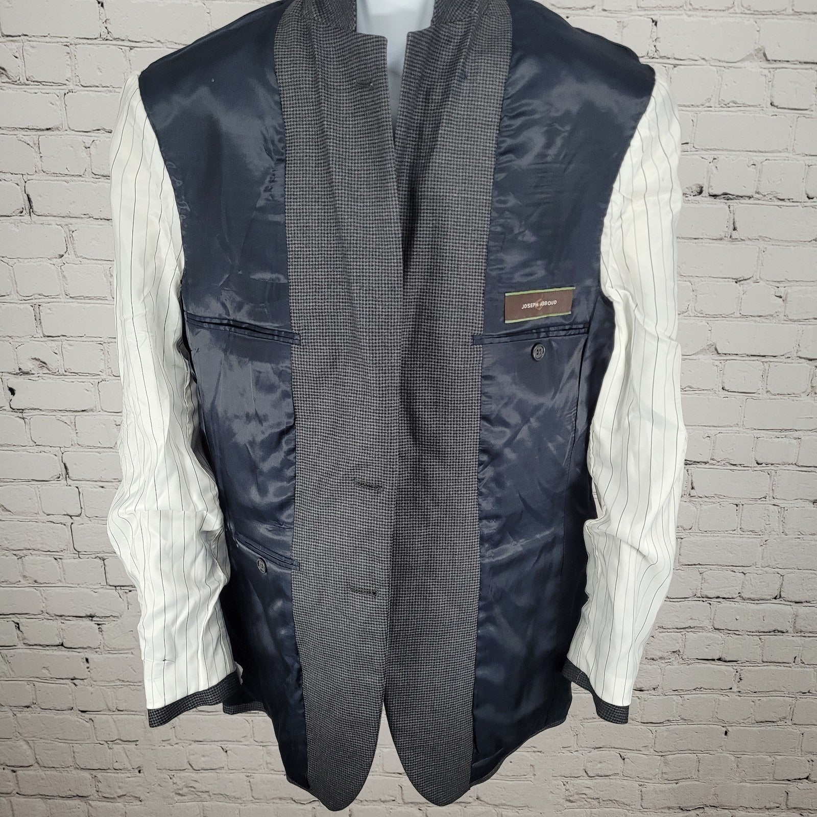 The NWT Joseph Abboud Grey 100% Wool Houndstooth Blazer Sport Coat is a high-quality and stylish piece of men's clothing. Made in the USA, this blazer exudes a sense of sophistication and American heritage. The houndstooth pattern and grey color add a touch of elegance to any outfit, making it a versatile and classic addition to any man's wardrobe. Crafted from 100% wool, this blazer is not only fashionable but also durable and versatile for various occasions.