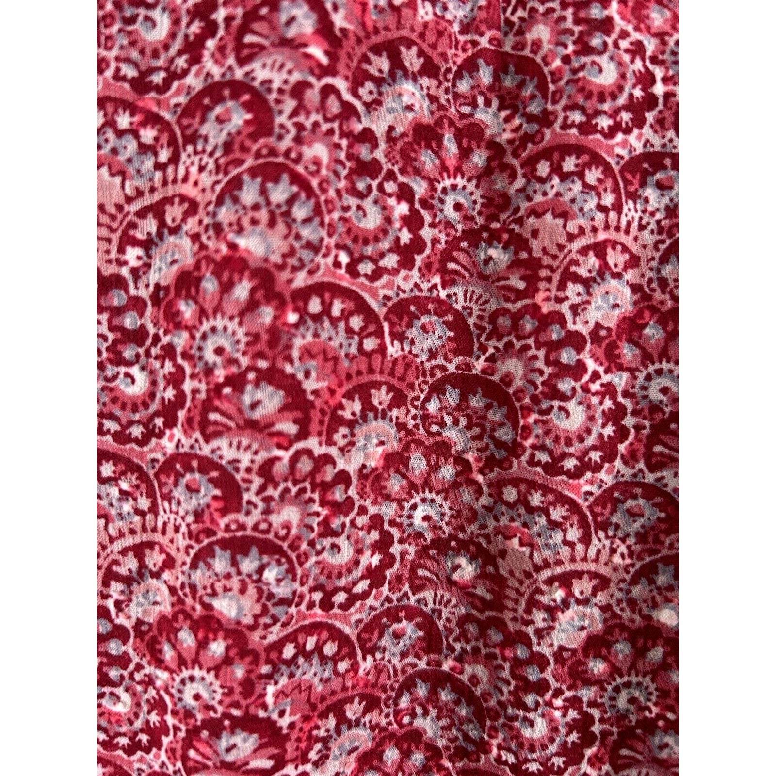 This beautiful red floral maxi dress from LOFT is perfect for any casual occasion. The dress features a V-neckline, short flutter sleeves, and a zip closure. The tiered design with a tie-back detail adds a touch of elegance to the dress. The dress is made of lightweight polyester material and is perfect for summer, fall, and spring seasons.