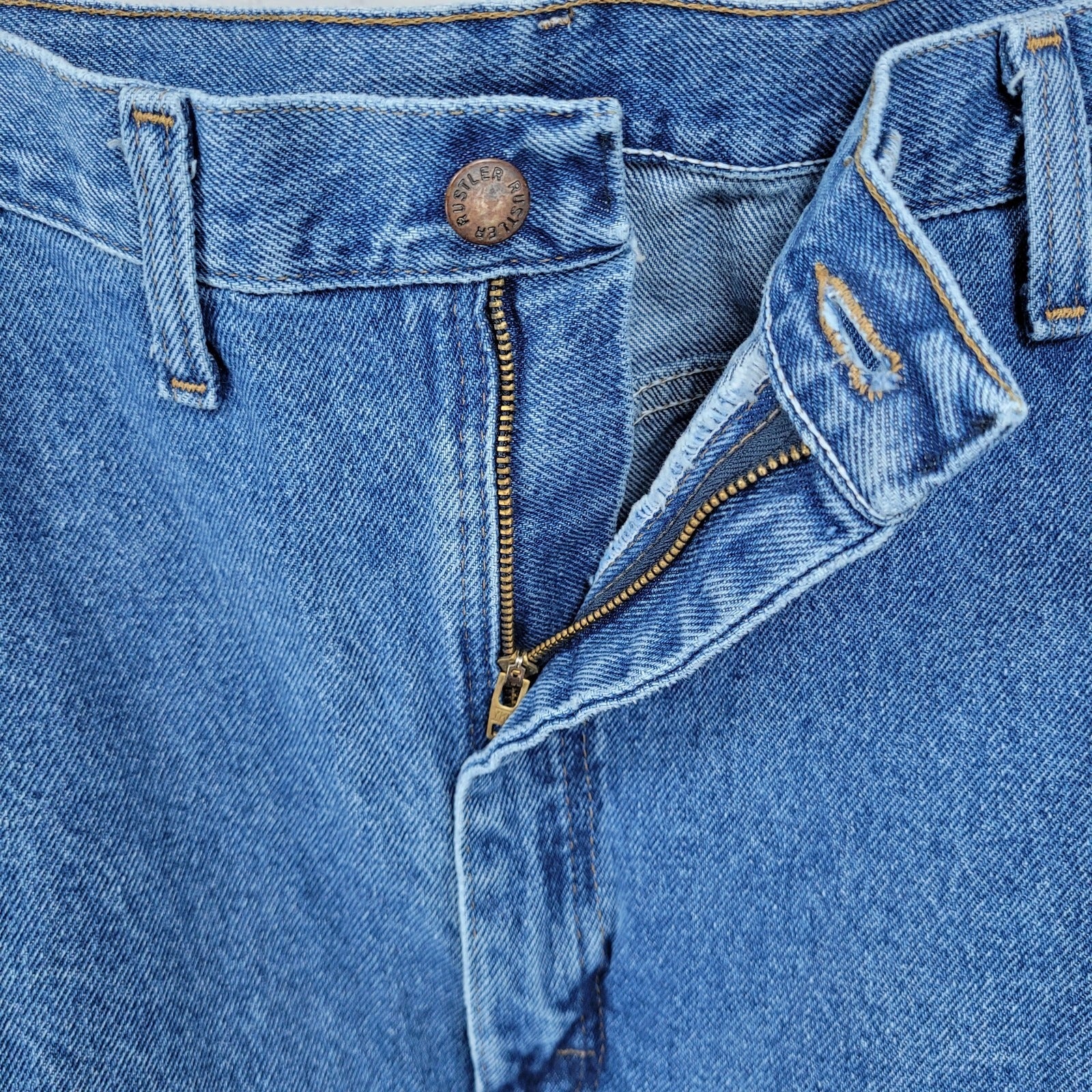 The NWT Rustler Wrangler Blue Heavyweight Rugged Denim Straight Leg Jeans in size 44x32 are a durable and functional option for men. Made from cotton denim with a medium wash, these jeans feature a high rise and a regular fit. The classic solid blue color and 5-pocket design add to the timeless appeal of this wardrobe staple. With a zip and button closure, these machine washable jeans are easy to care for and perfect for year-round wear.